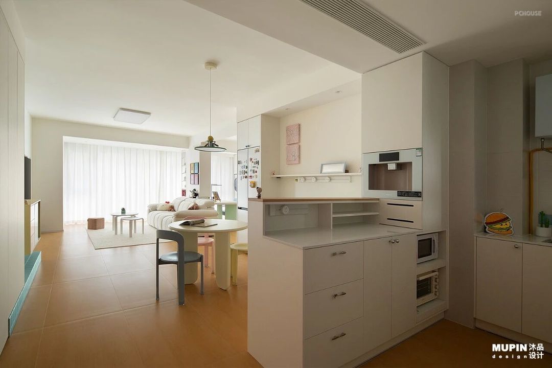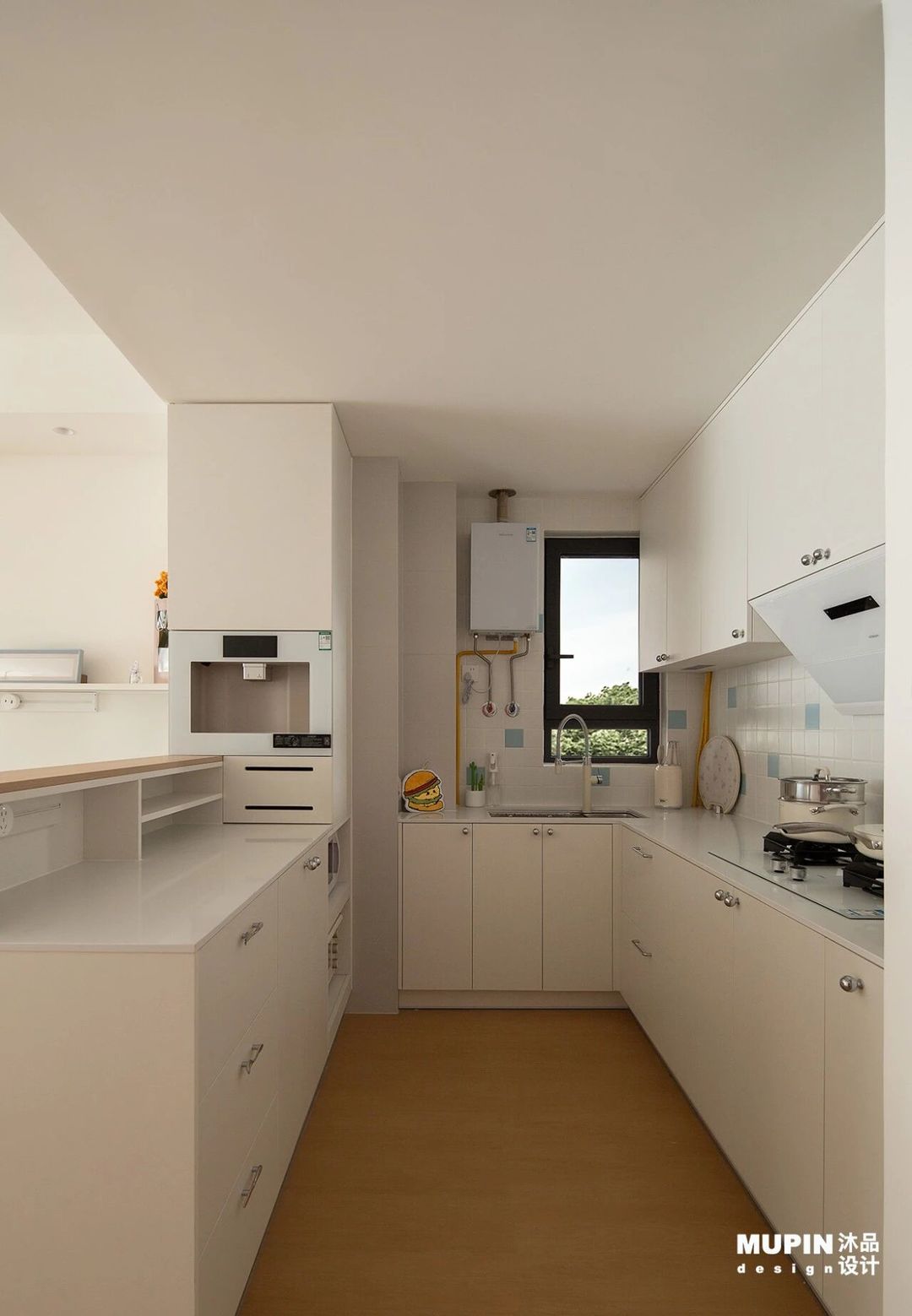 厨房也以白色为主色调,搭配浅木色地板,营造出明亮、干净的视觉效果,让厨房显得清爽整洁。