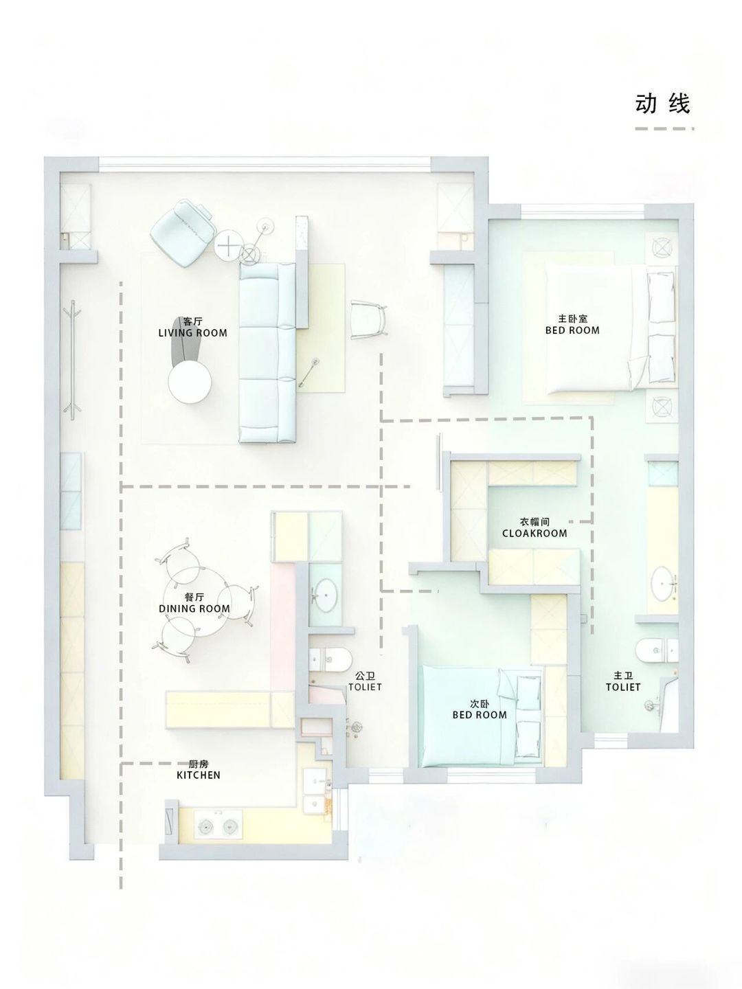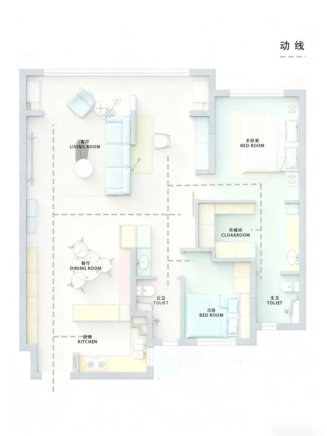 将空间清晰划分为客厅、餐厅、厨房、主卧、次卧、衣帽间以及公卫、主卫等区域。