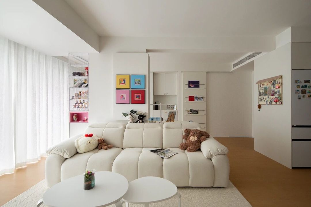 软装布置丰富且用心,沙发上的可爱玩偶、墙上的装饰画与照片墙,还有透明展示柜里的藏品等,这些细节不仅起到装饰作用,更传递出居住者的生活情趣与个性,让空间充满生活温度。灯光设计也较为柔和,与整体清新温馨的风格相契合,进一步烘托出舒适的氛围。