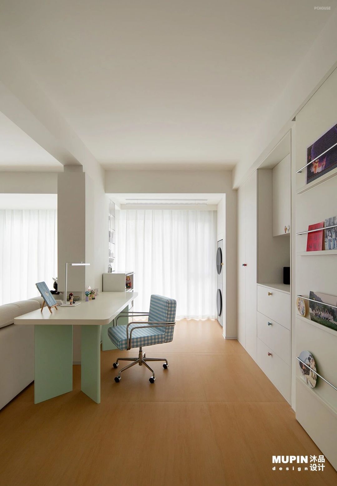 将办公功能与展示收纳功能巧妙融合在同一打通后的空间内。既保证了办公区域的相对独立与专注性,又利用侧边柜体实现了物品展示与收纳,满足了多元使用需求,同时也让空间利用更高效。