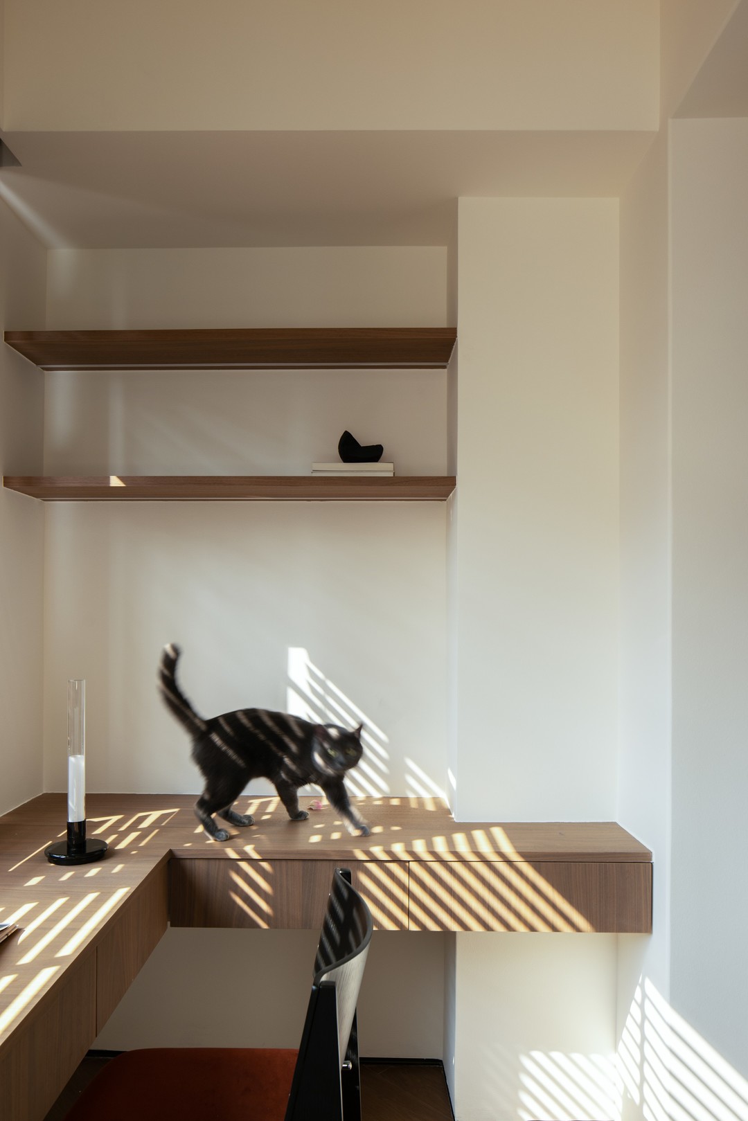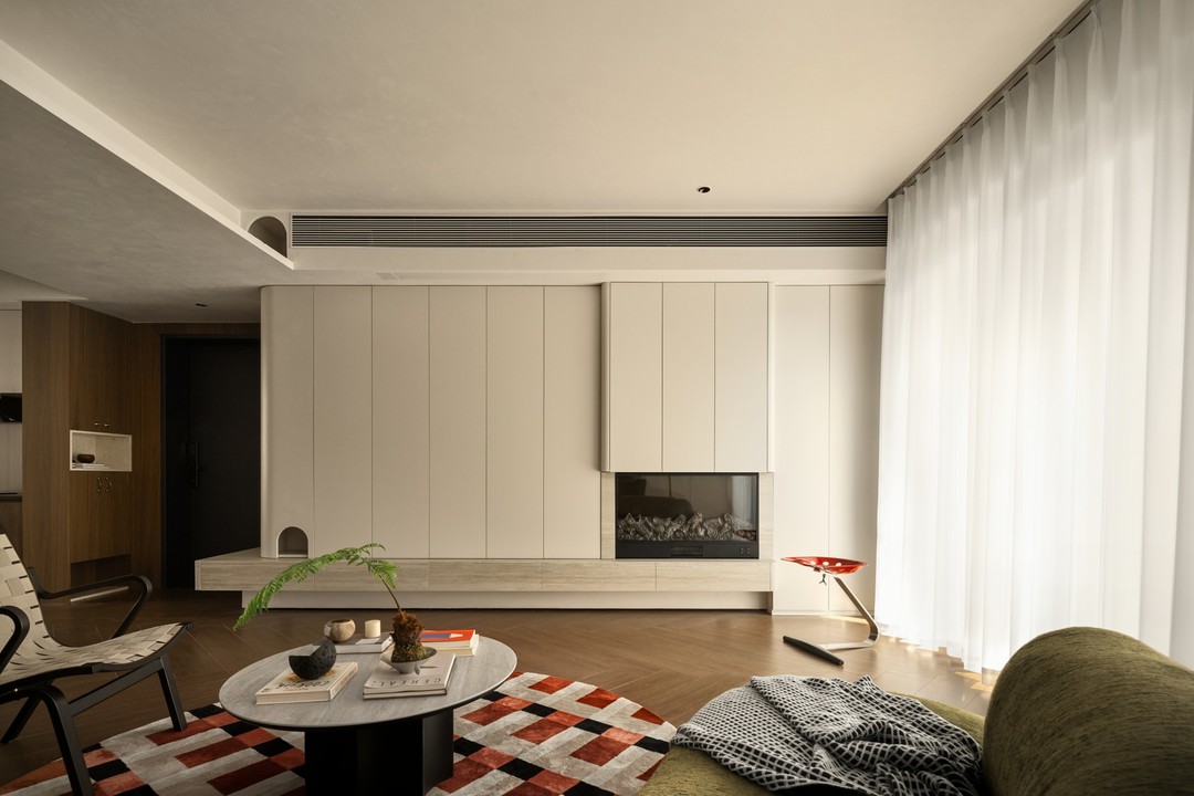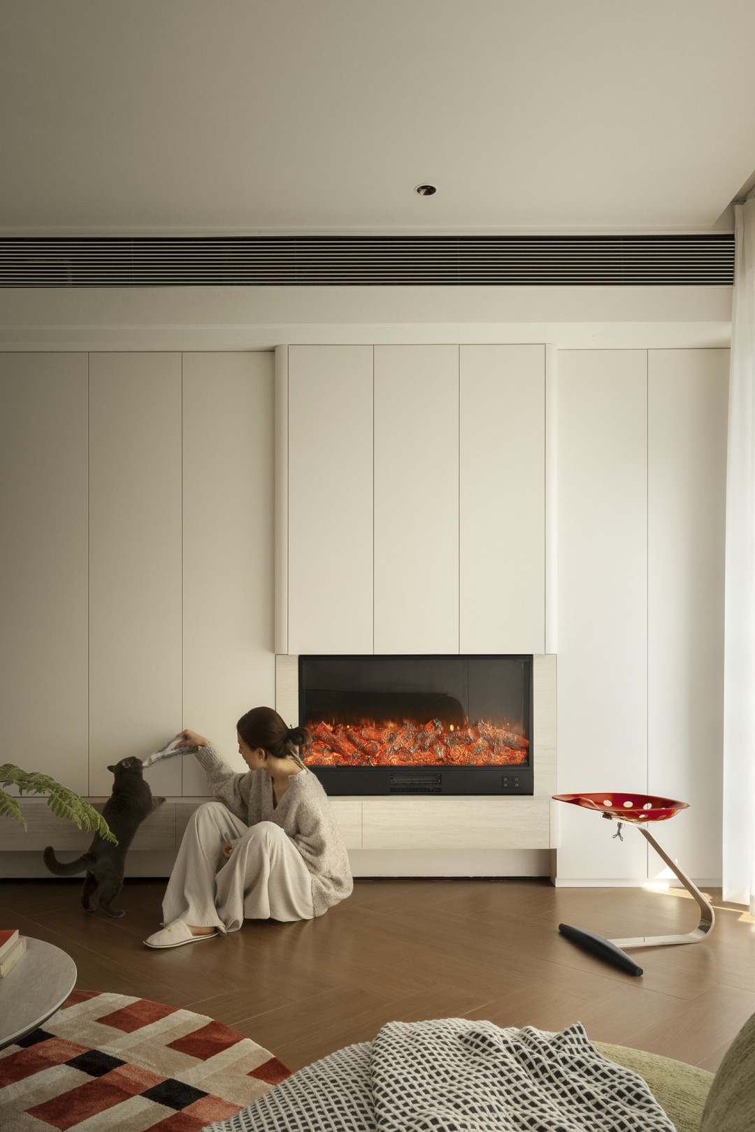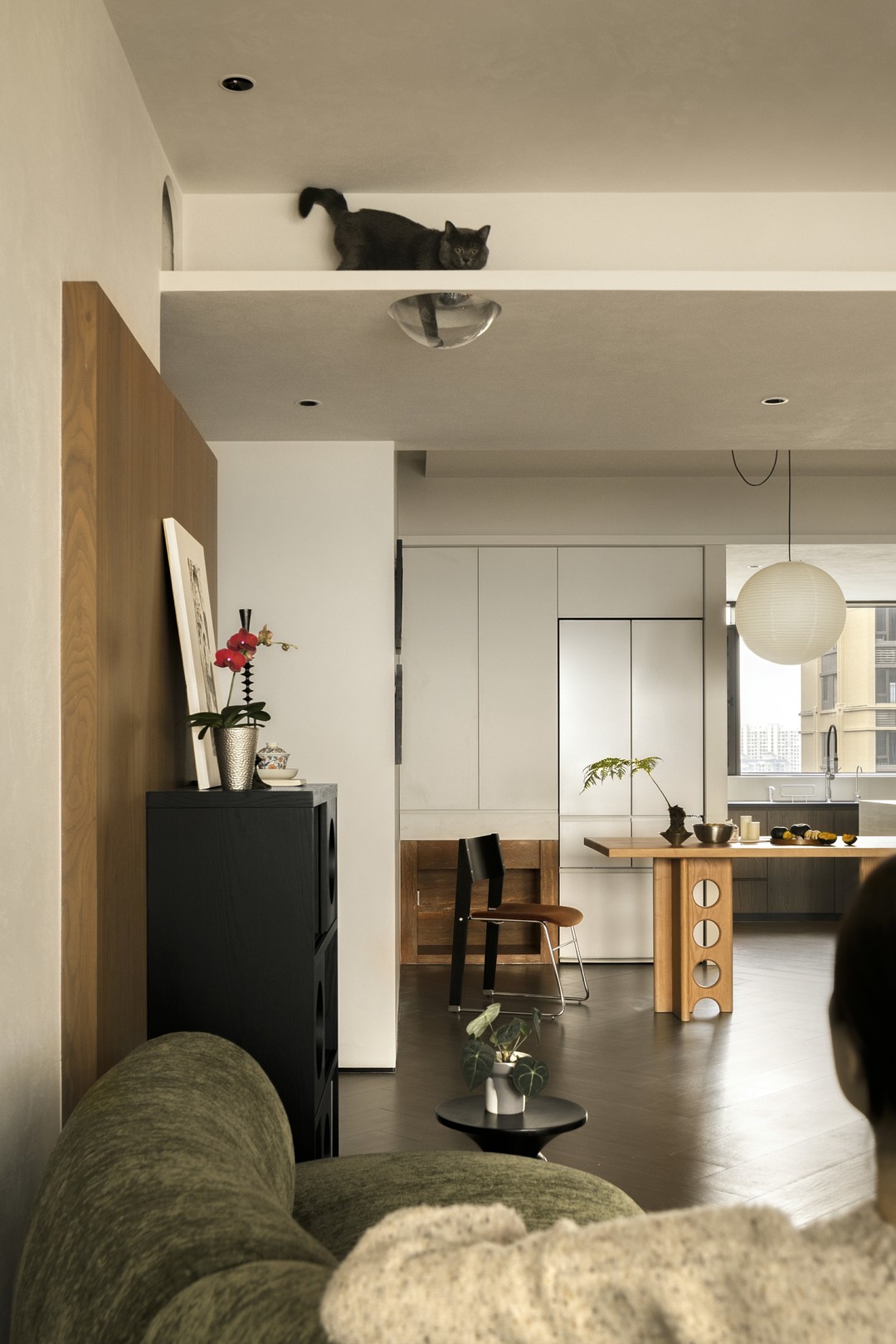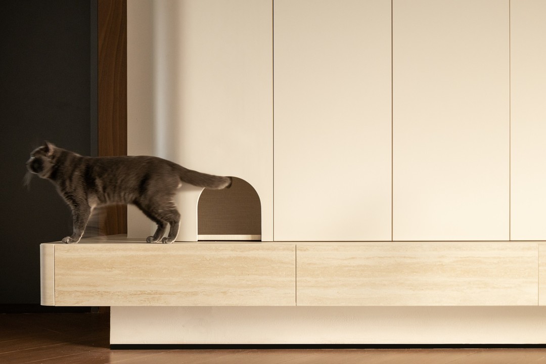 纯色背景墙中心偏右位置外凸,展现壁炉的温度与氛围,下方穿插横向悬空结构,串联起猫屋动线。吊顶设窄边平台,使猫的轨迹贯穿于跨客厅的柜体之间。过道上方嵌一透明半球用作猫咪的“暂休地”,一动一静,皆显爱宠与人双向奔赴的温情。