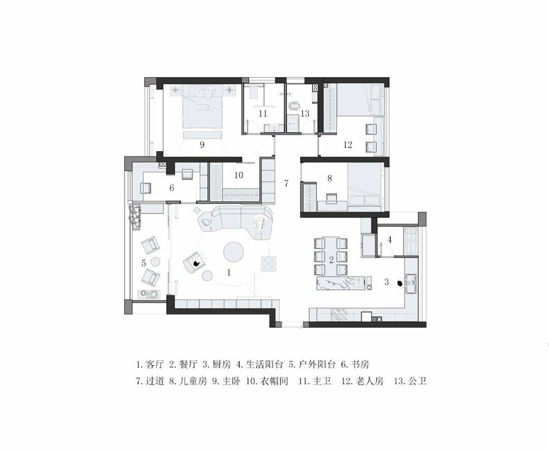 ① 原始景观阳台较长,为满足业主独立剪辑视频、增添衣帽间及猫屋的需求,借用靠近主卧的部分景观阳台空间,并利用承重墙分隔出双工位书房,然后向过道延伸出衣帽间、家政柜与猫屋,在保证客厅视觉通透的情况下,实现功能的高效整合;② 业主是美食博主,对厨房操作空间与拍摄空间有要求,所以将原始生活阳台缩小,外扩出更大的厨房。布局上竖向设置岛台并连接餐桌,形成流畅的洄游动线,提升空间利用率与体验感;③ 鉴于公卫与主卫同向并列的关系,采用“主大公小”的策略进行区分,并细化各自功能,最终实现便捷舒适的使用体验。