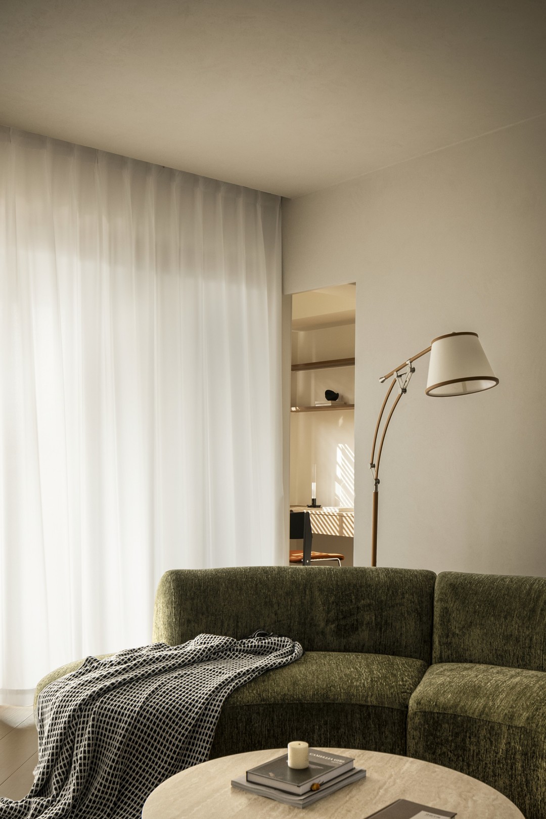 步入客厅,与自然相接的阳台引光入室,以疏朗通透之感消解束缚。纯白纱帘随风轻漾,呼应着落座区与电视壁炉区的布局。撞色圆毯,居中叠搭,成为客厅的视觉锚点,聚合一室气韵。可拥抱天光云影的诗意,又可沉浸于家的安稳与宁静。