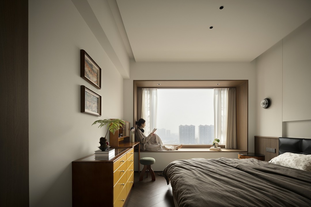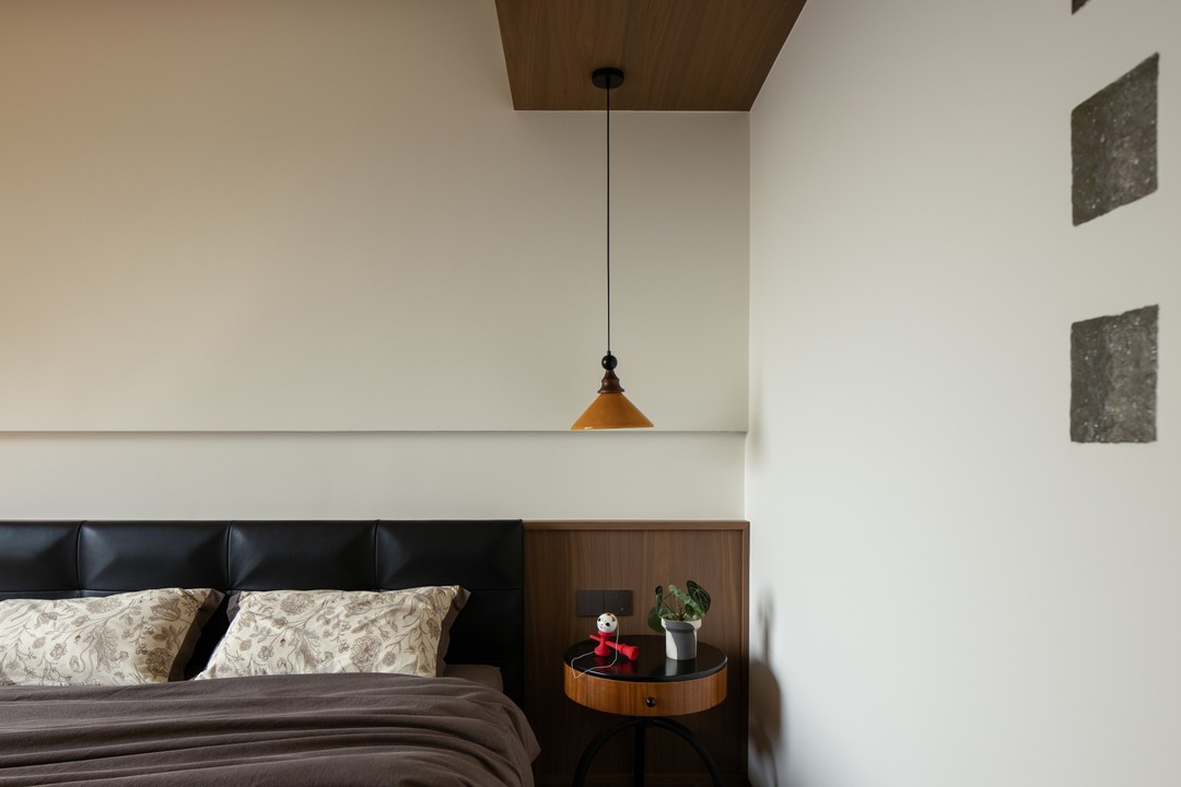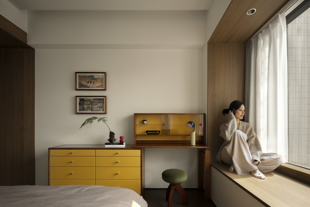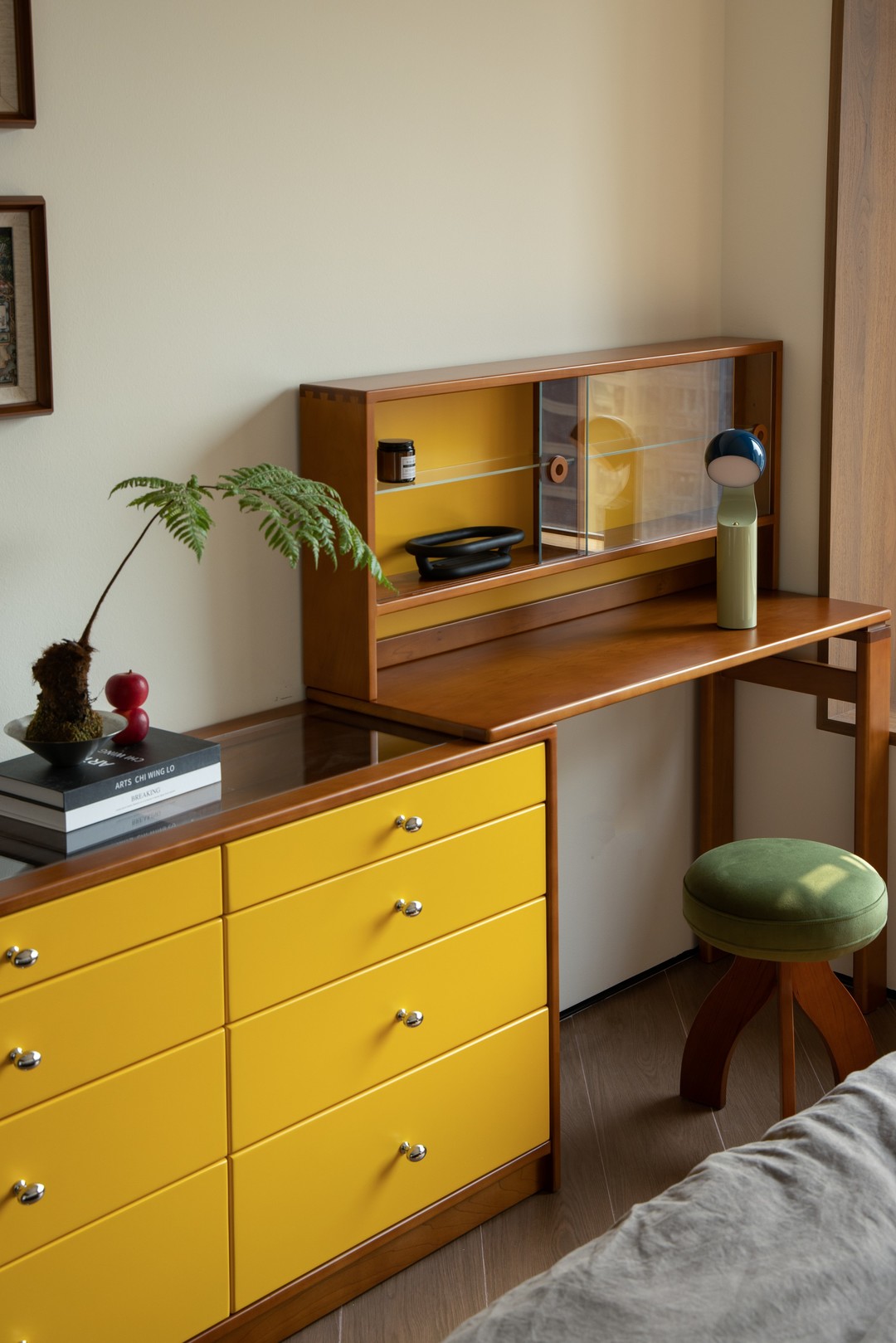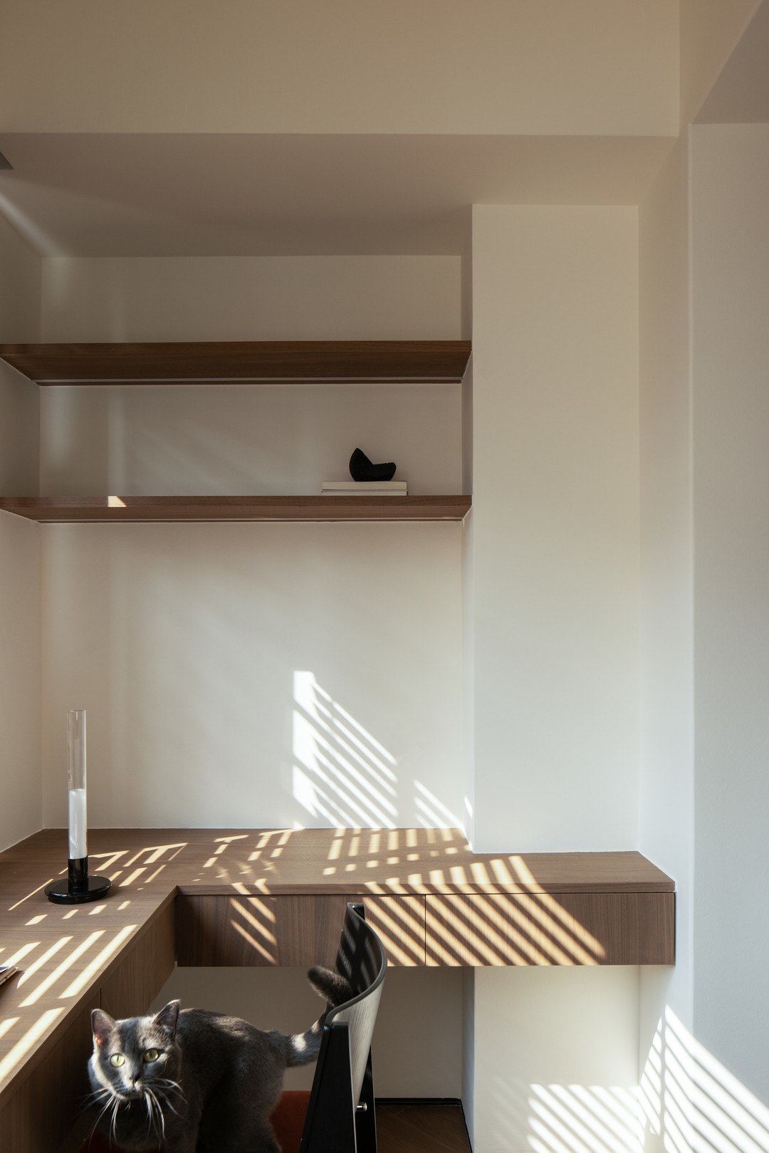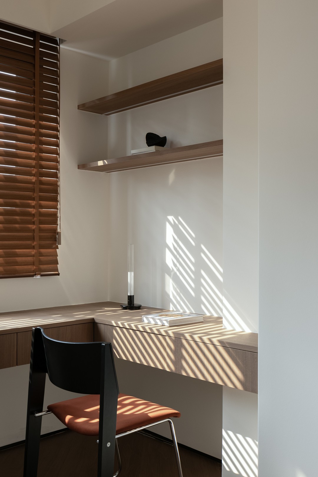 书房描摹留白基底,营造美妙光感,复古的百叶帘垂下,光斑显现出诗意,划过空间,流过家具,唤醒了木元素的自然生机,为影像创作注入灵感。双层隔板巧妙填补立面与置物功能的空白,简约实用,还与光斑产生静谧协奏。