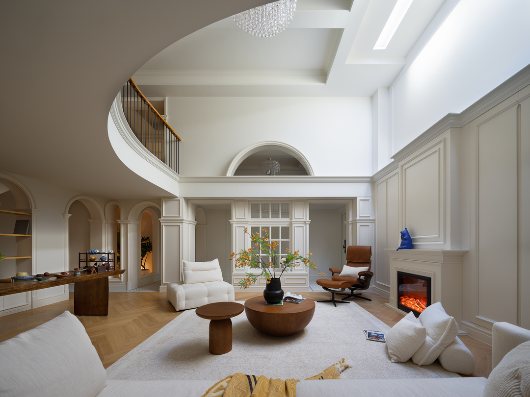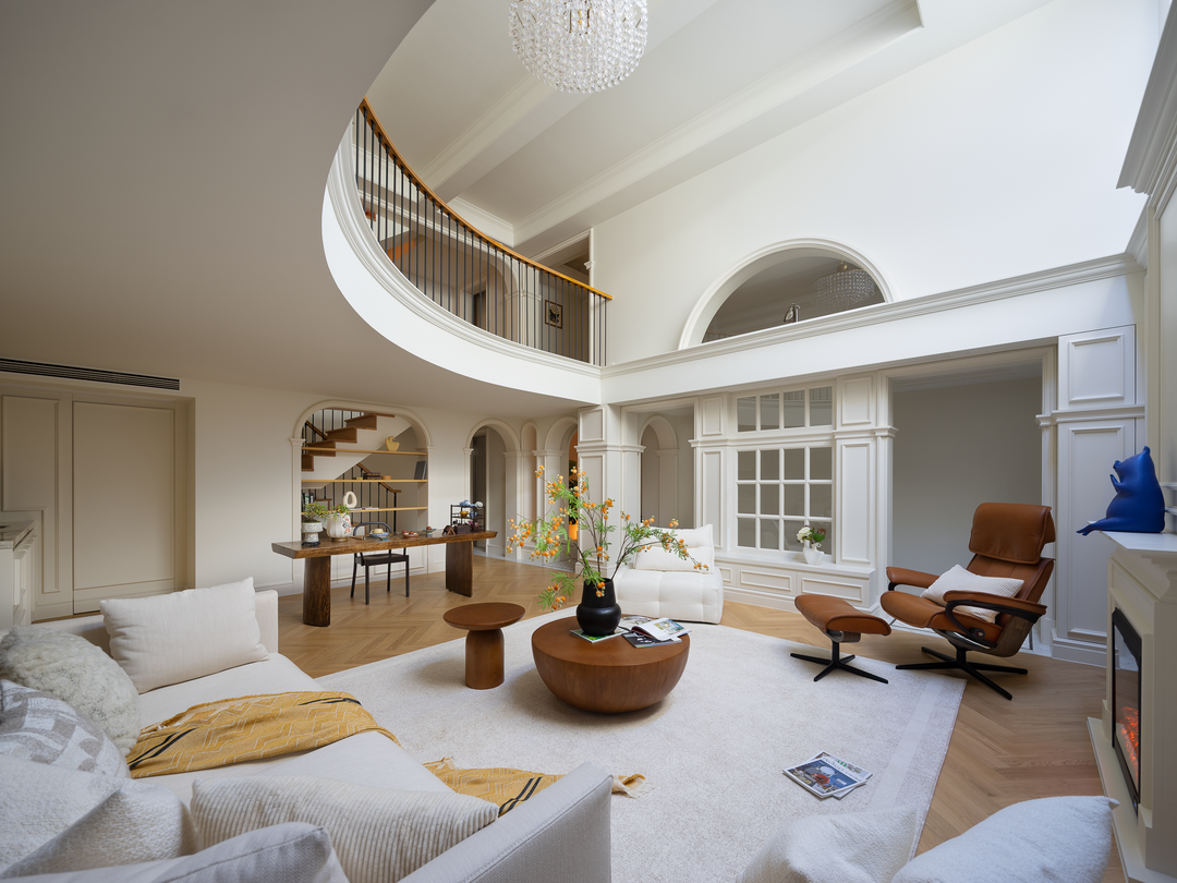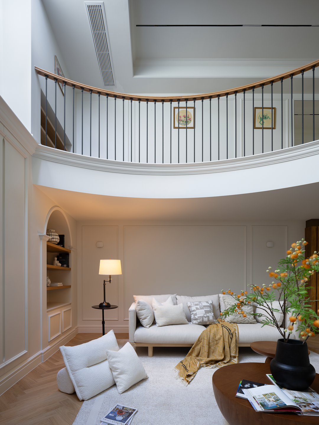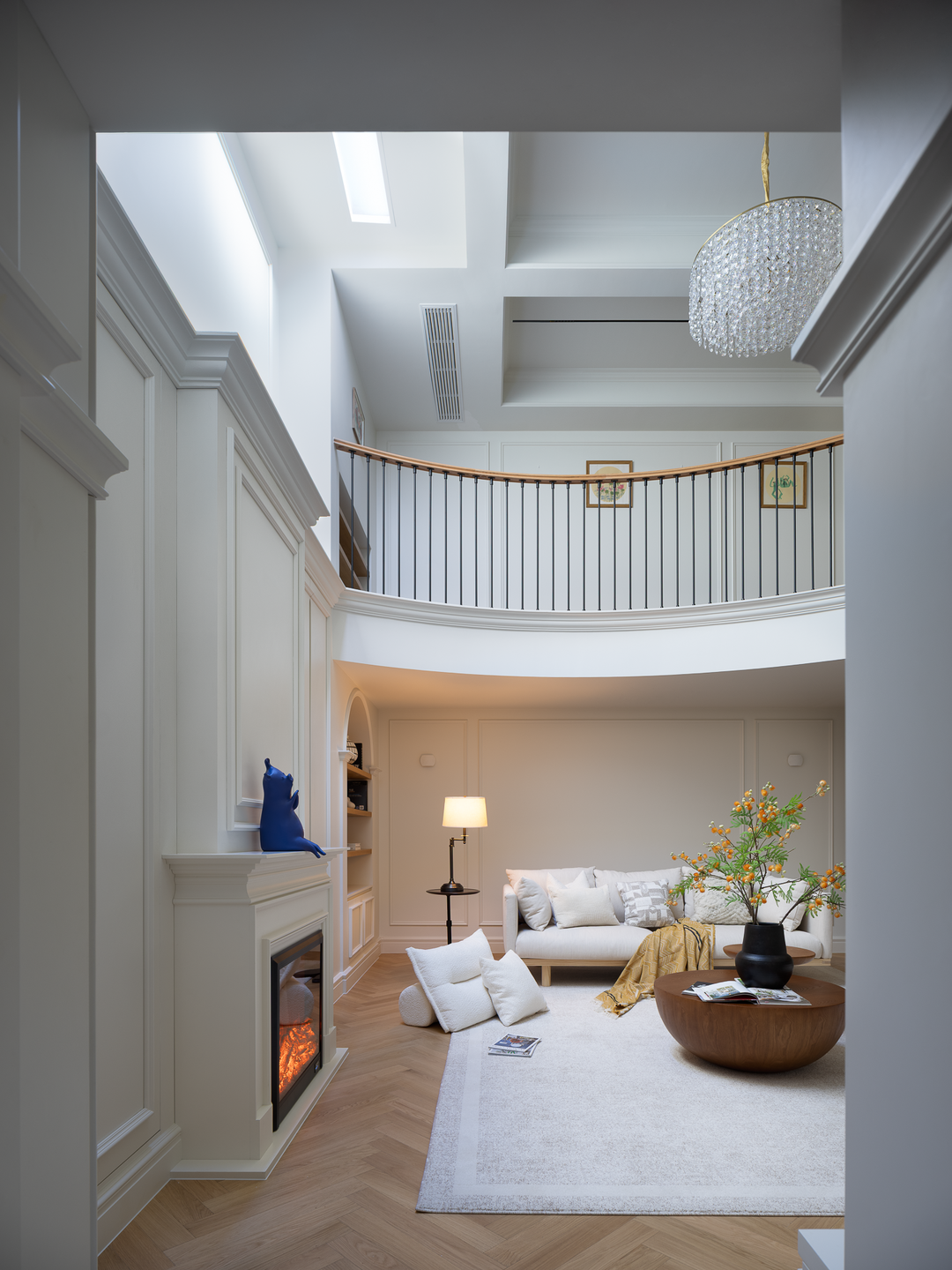 B2,进行了挑空设计,仿佛凿开尘世的一道缝隙——光自高处倾泻而下,空气也有了流动的韵律。这里,不再只是客厅,而是主人与知己围炉夜话、对月品茗的精神庭院。茶烟袅袅,笑语低回,时间在此处打了个温柔的结。