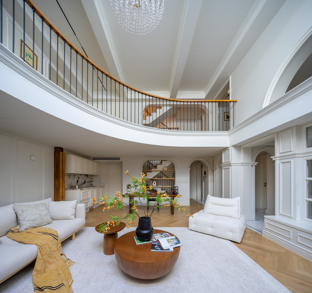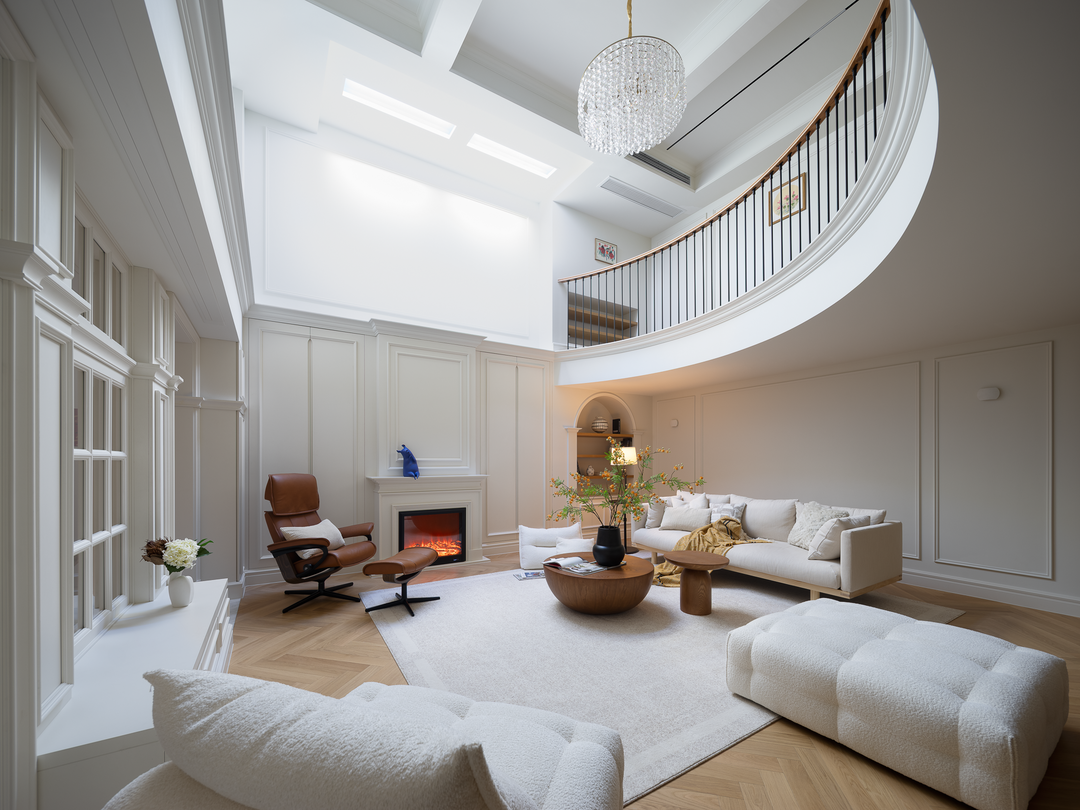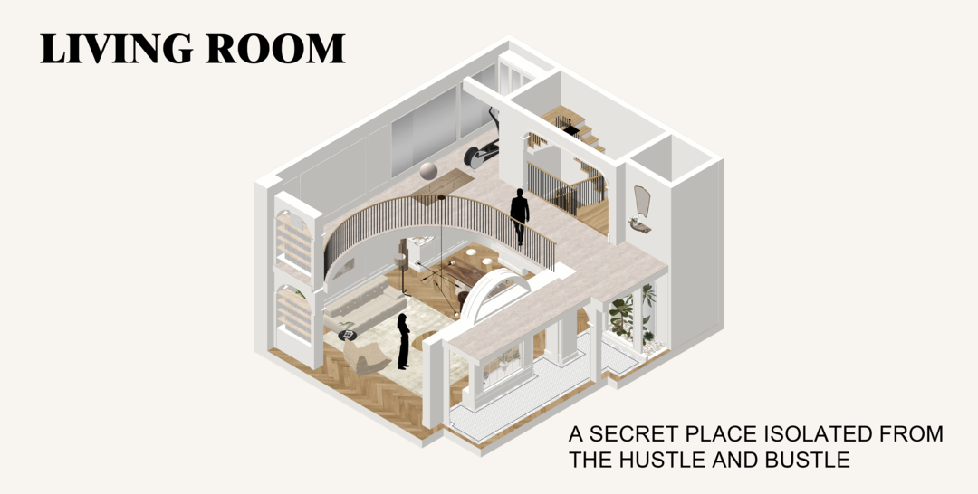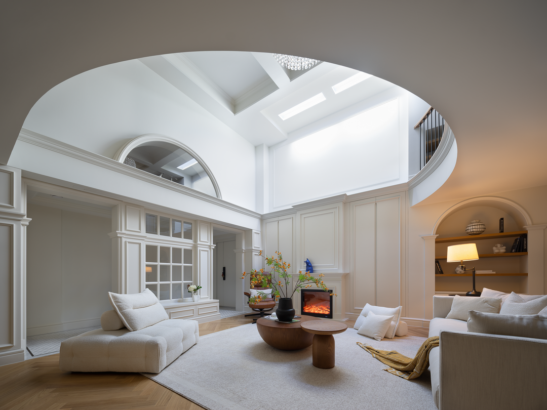 B2,进行了挑空设计,仿佛凿开尘世的一道缝隙——光自高处倾泻而下,空气也有了流动的韵律。这里,不再只是客厅,而是主人与知己围炉夜话、对月品茗的精神庭院。茶烟袅袅,笑语低回,时间在此处打了个温柔的结。