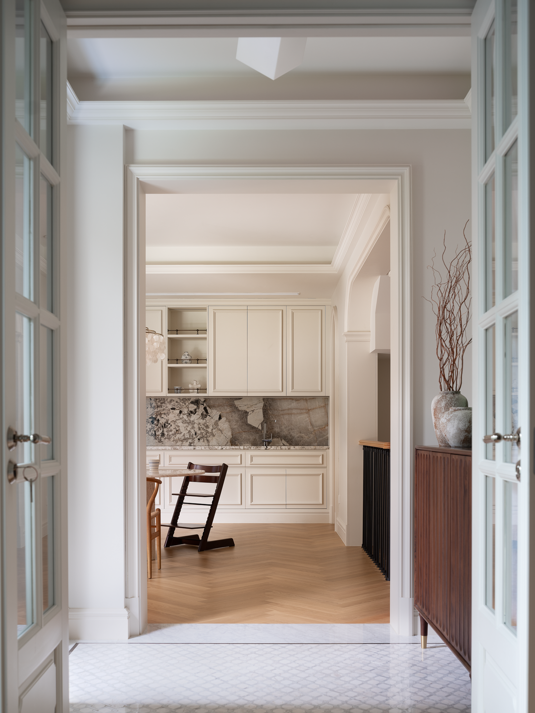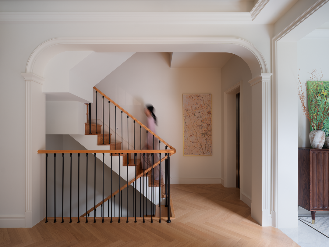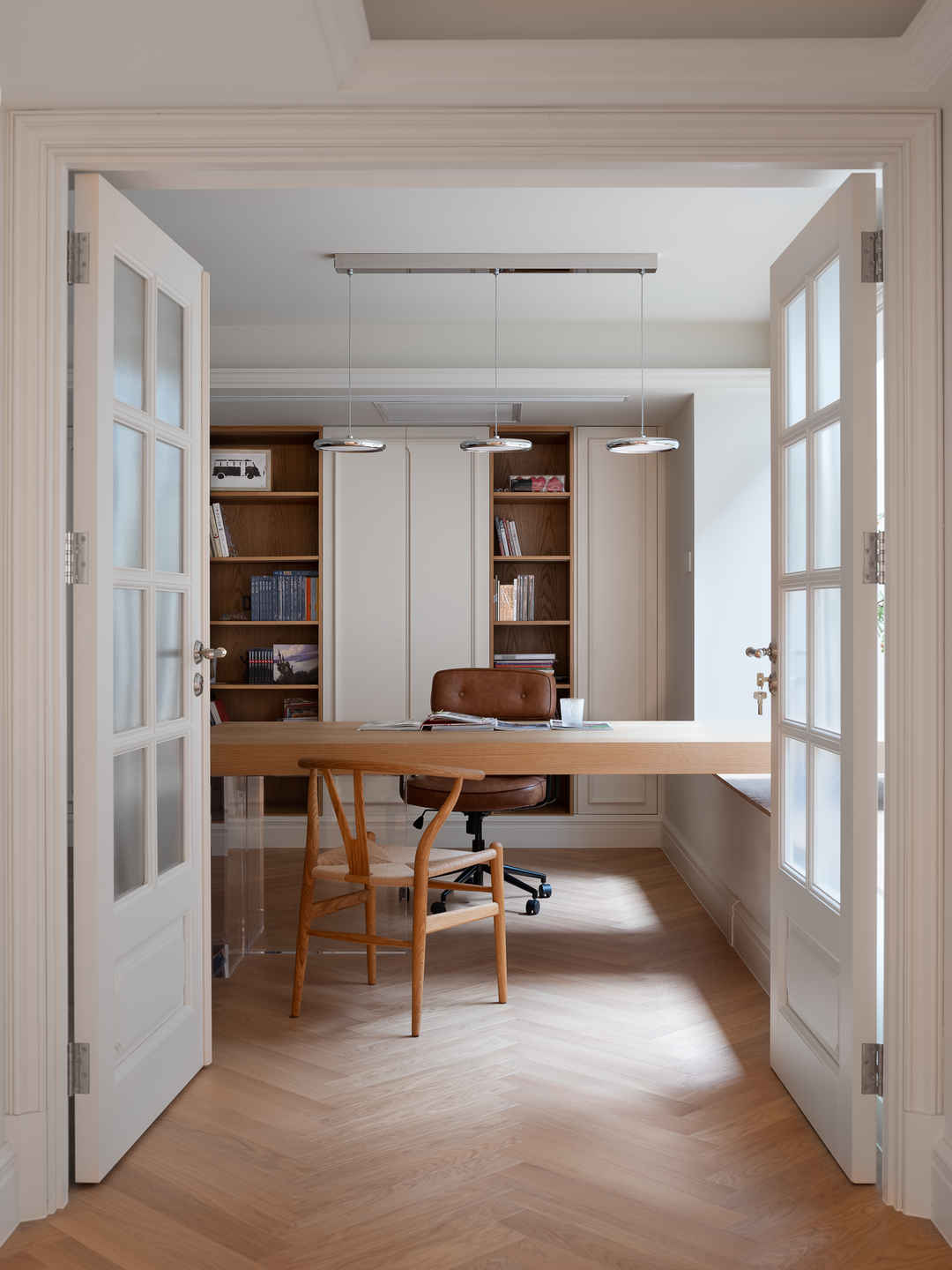 一楼原先设有厨房,打通后,梁会暴露出来,客厅显得不够方正。为了解决这一问题,设计师在对称区域增加了假梁设计,并配合法式吊顶结构,打造出整体空间形成矩阵形状的法式横梁吊顶。这种设计不仅弱化了梁的存在感,也使得不完整的碎片化空间变得更加协调统一。