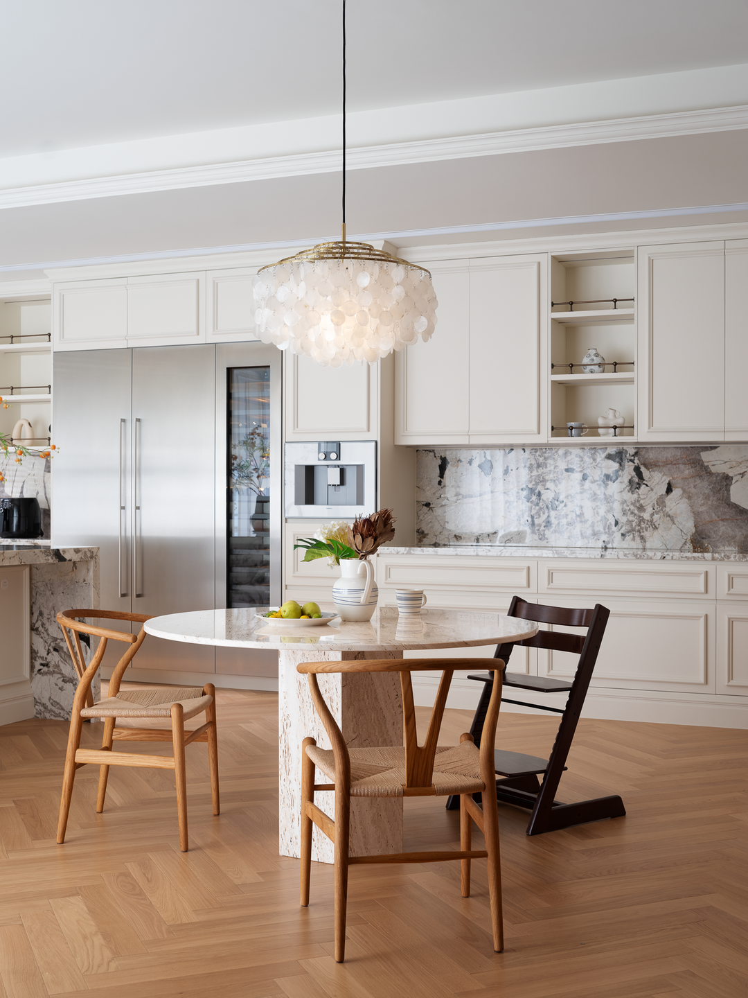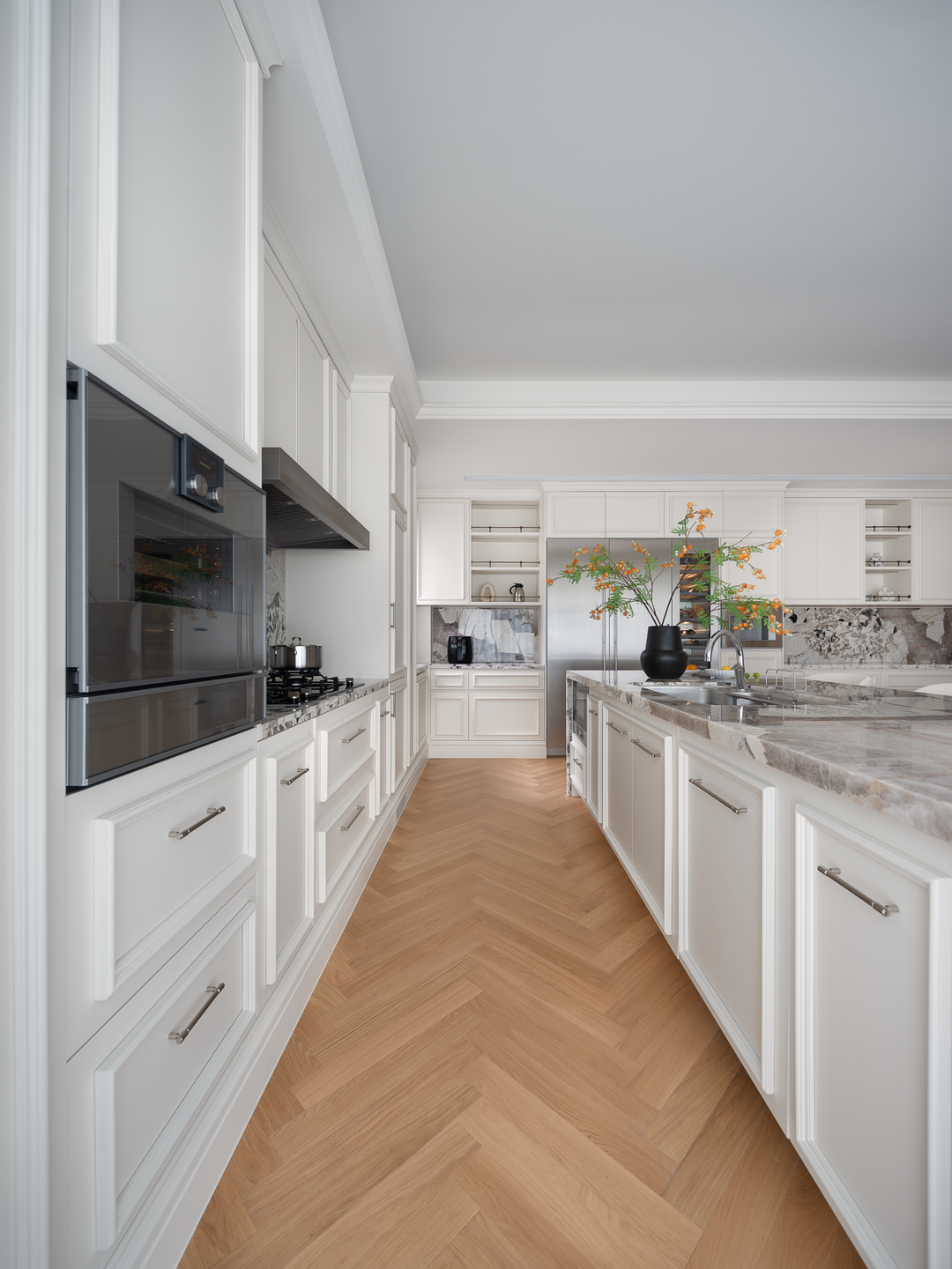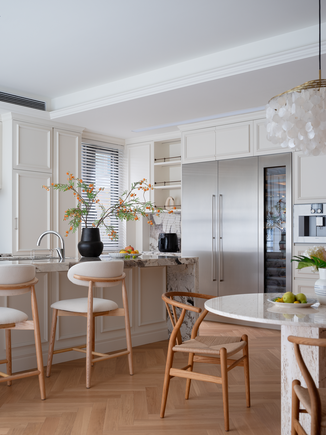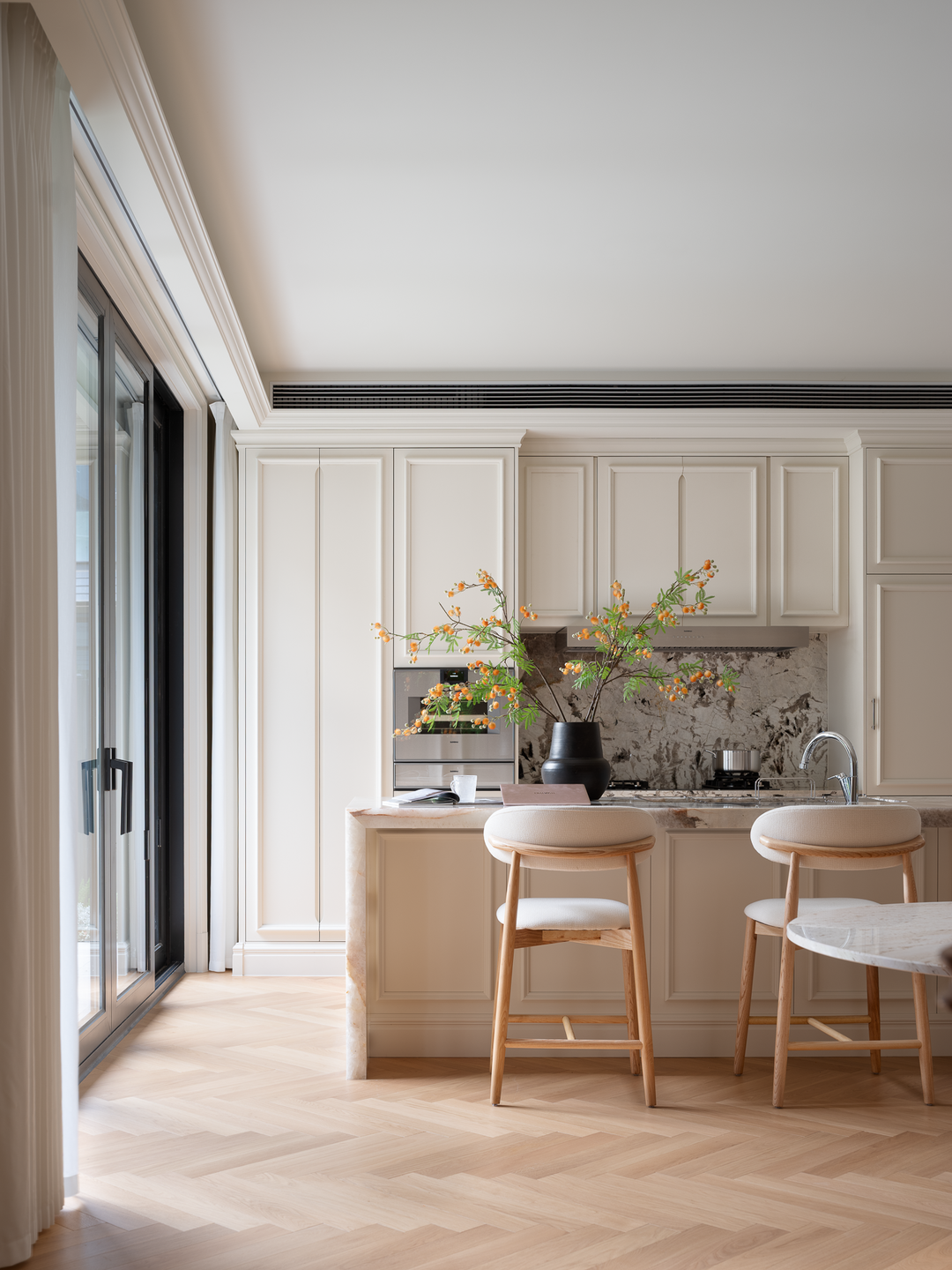 考虑到屋主一家经常有老人过来带孩子,女屋主本身也喜欢制作美食,厨房使用频率较高。一楼区域设计了开放式厨房,三米多的大岛台,既方便家人享受美食,也能在烹饪与用餐过程中更好地互动。