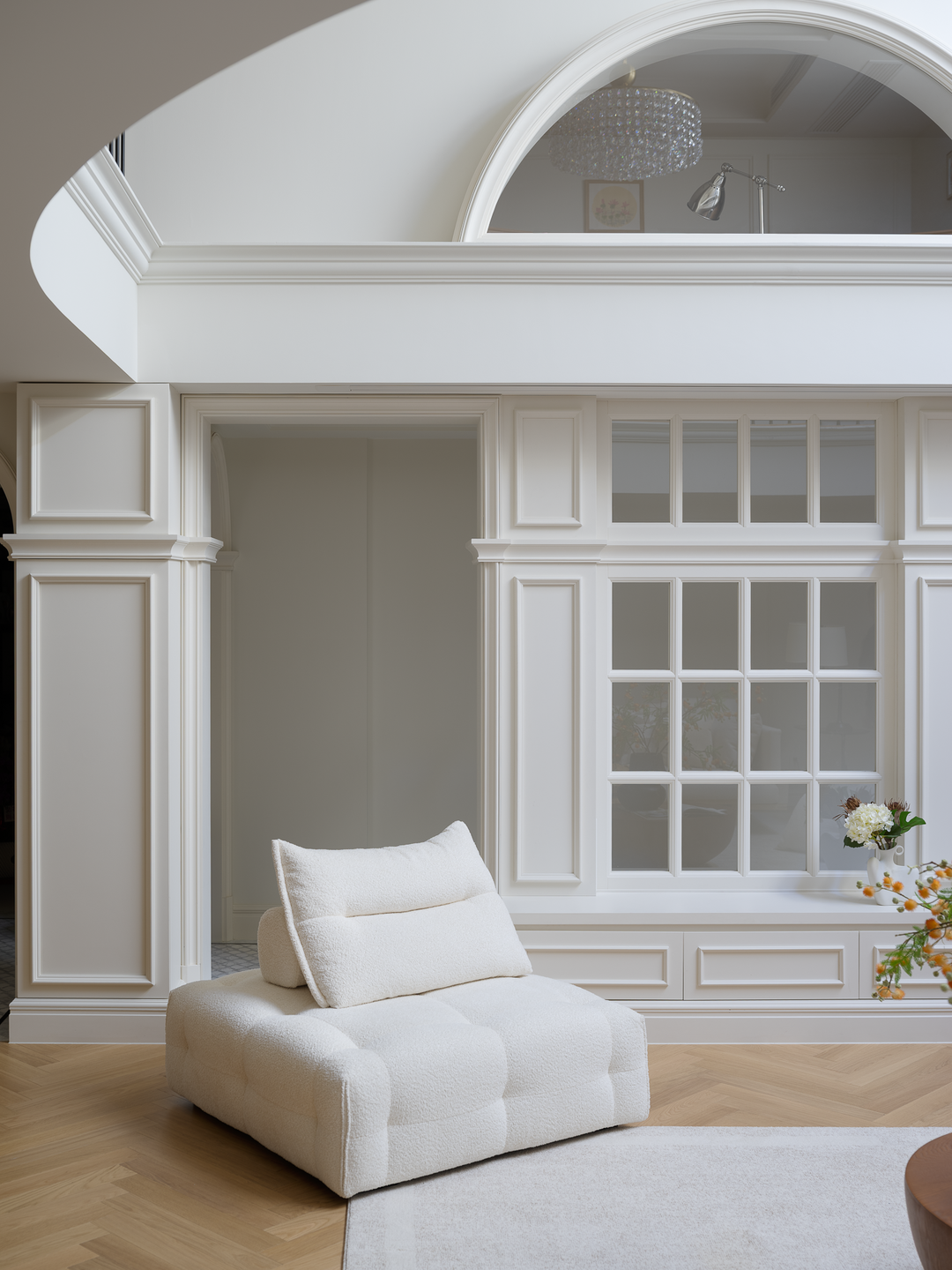 地下室做了挑空设计,入户玄关所在的B1会偏矮一点,设计师利用原始结构,设计了法式弧形的凸窗,与玄关下面隔断形成了一种欧式建筑结构的氛围感。