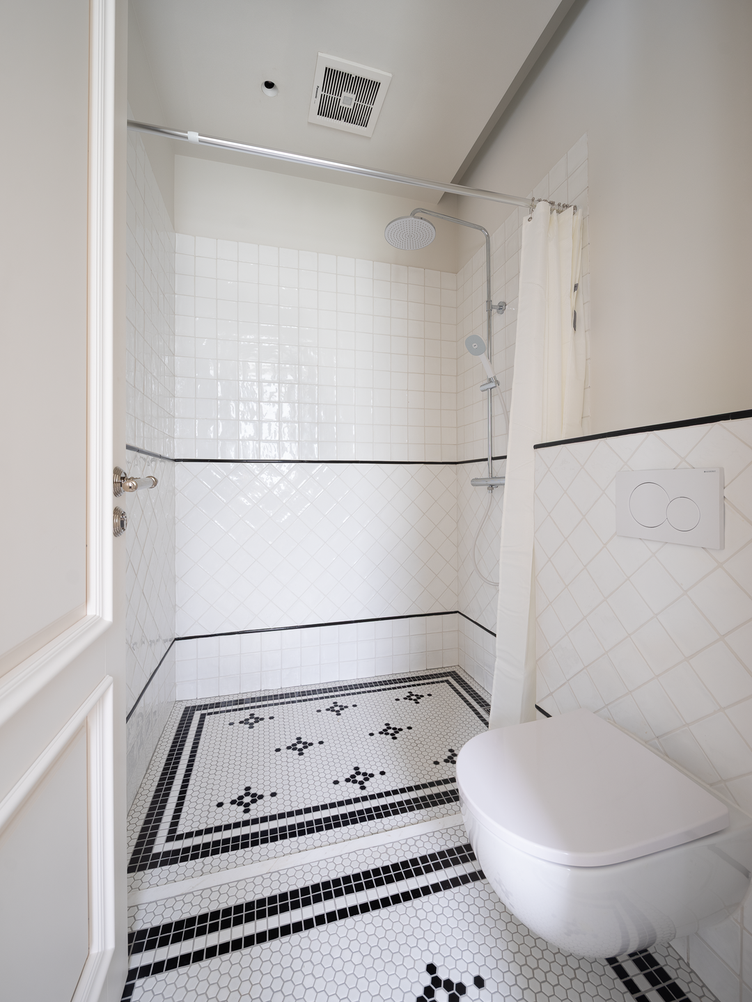 当空间摇身一变成为客房时,卫生间窗户透露的光线为空间增添了一丝明亮与温暖。为了更好地利用这束光,设计师在干区门洞上增加了一扇谷仓门,它既是空间的隔断,又可作为小朋友的写字板,随意涂鸦、写字或与小伙伴们分享心事。