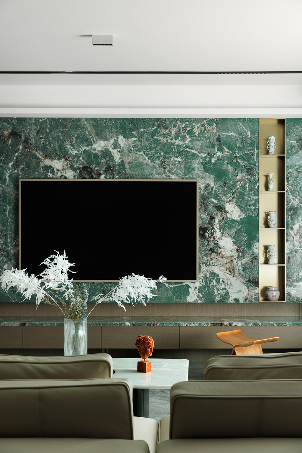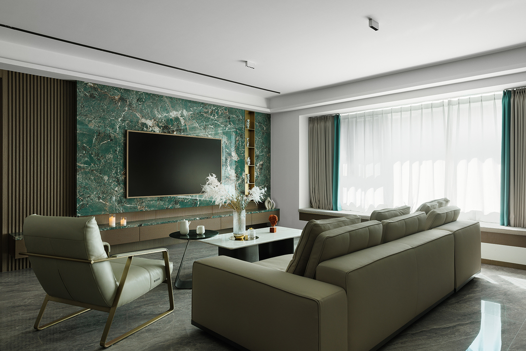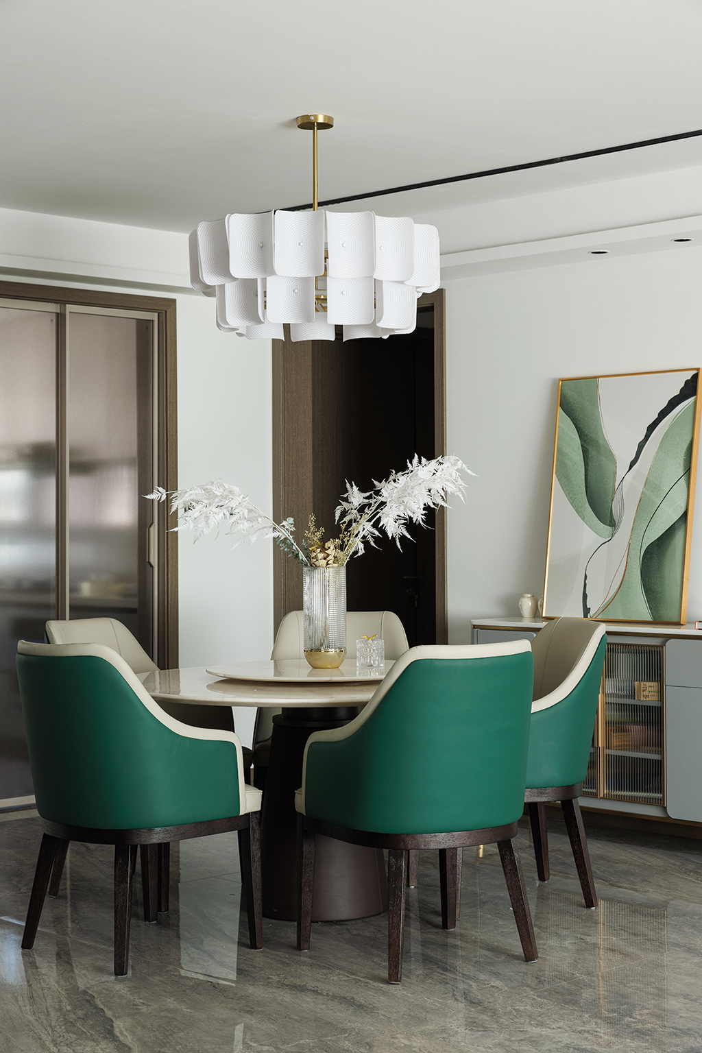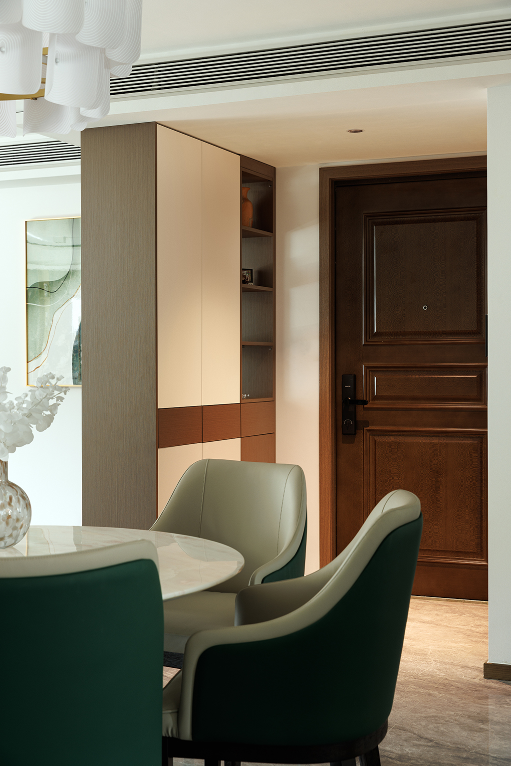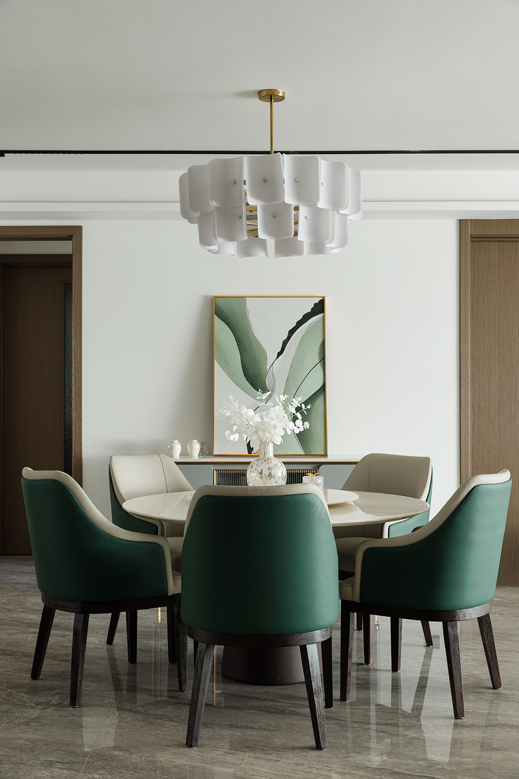以精致细节与低调奢华感为基调,融合木色系家具与皮质沙发的温润质感,通过绿色调的贯穿性运用,营造自然雅致与低调奢华的氛围。
