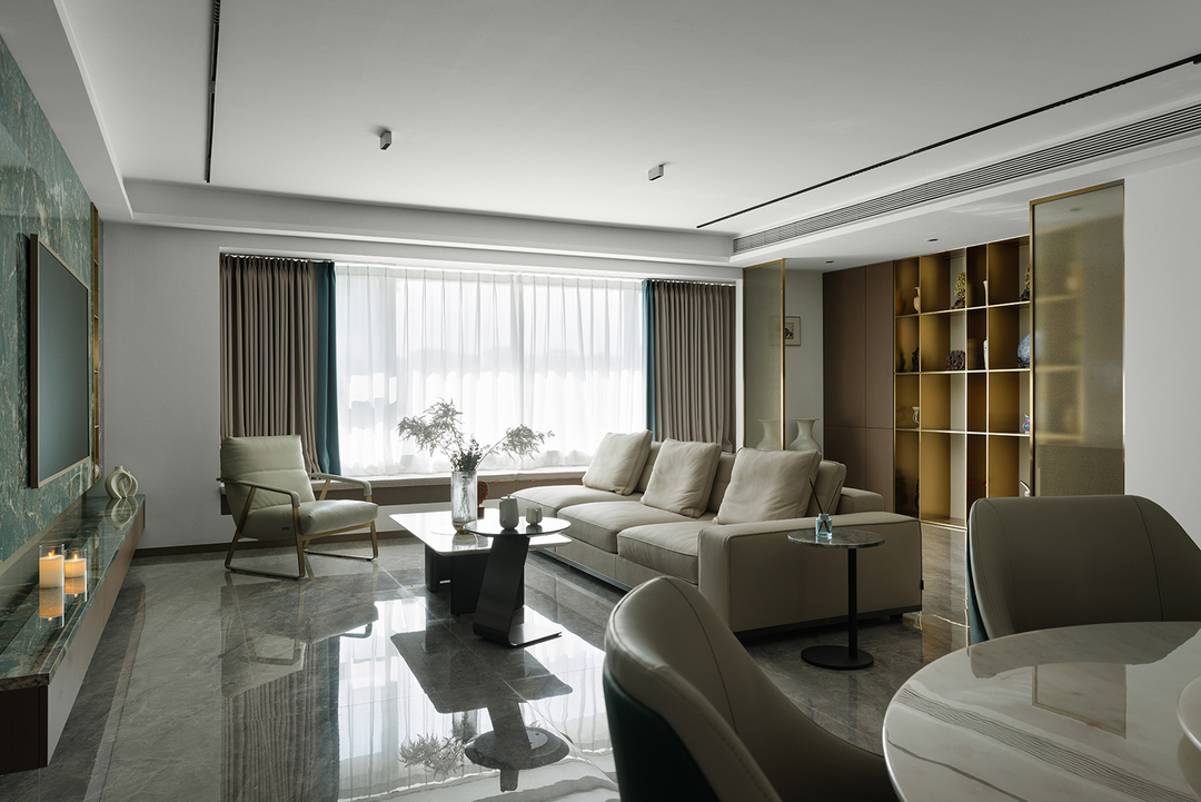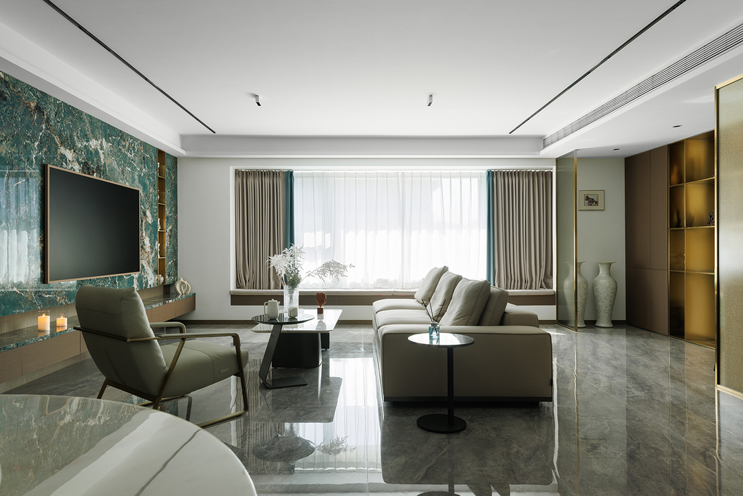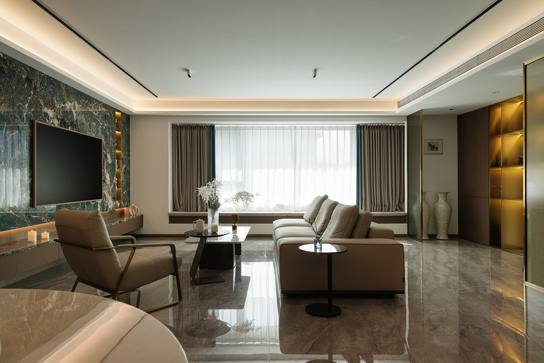 空间整体强调材质对比与细节层次,以现代设计手法诠释轻奢美学,同时将更多的自然光引入室内,为生活增添了诗意和远方。
