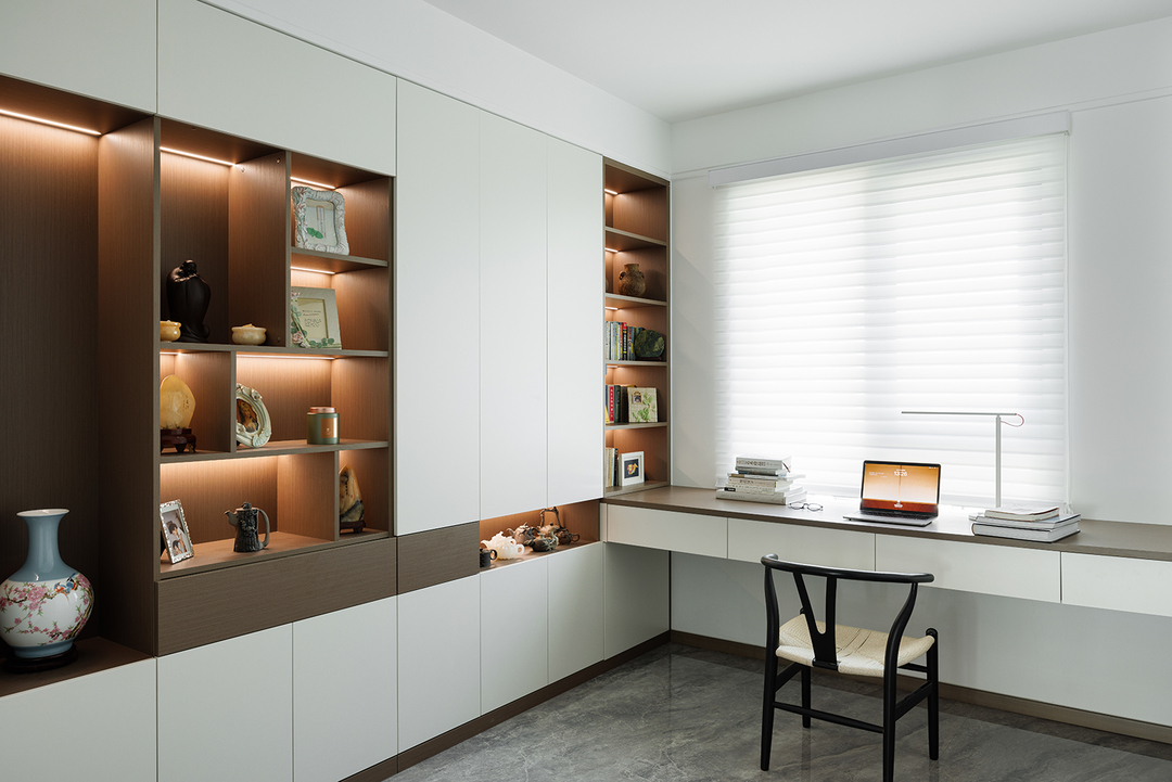 悬浮书桌提供了充足的工作空间,并与大面积的收纳柜一体化设计,保证了整洁与有序。开放式书架采用隐藏式照明,营造出温馨的氛围,同时展示的精美的装饰品,增添了空间的艺术感。