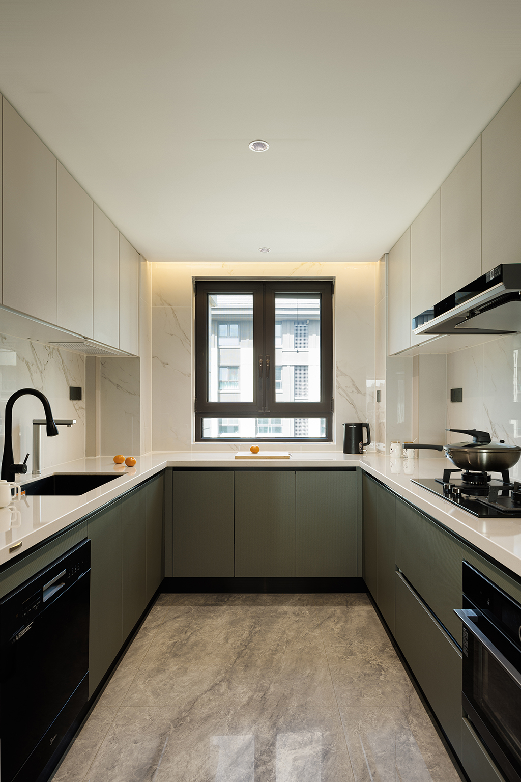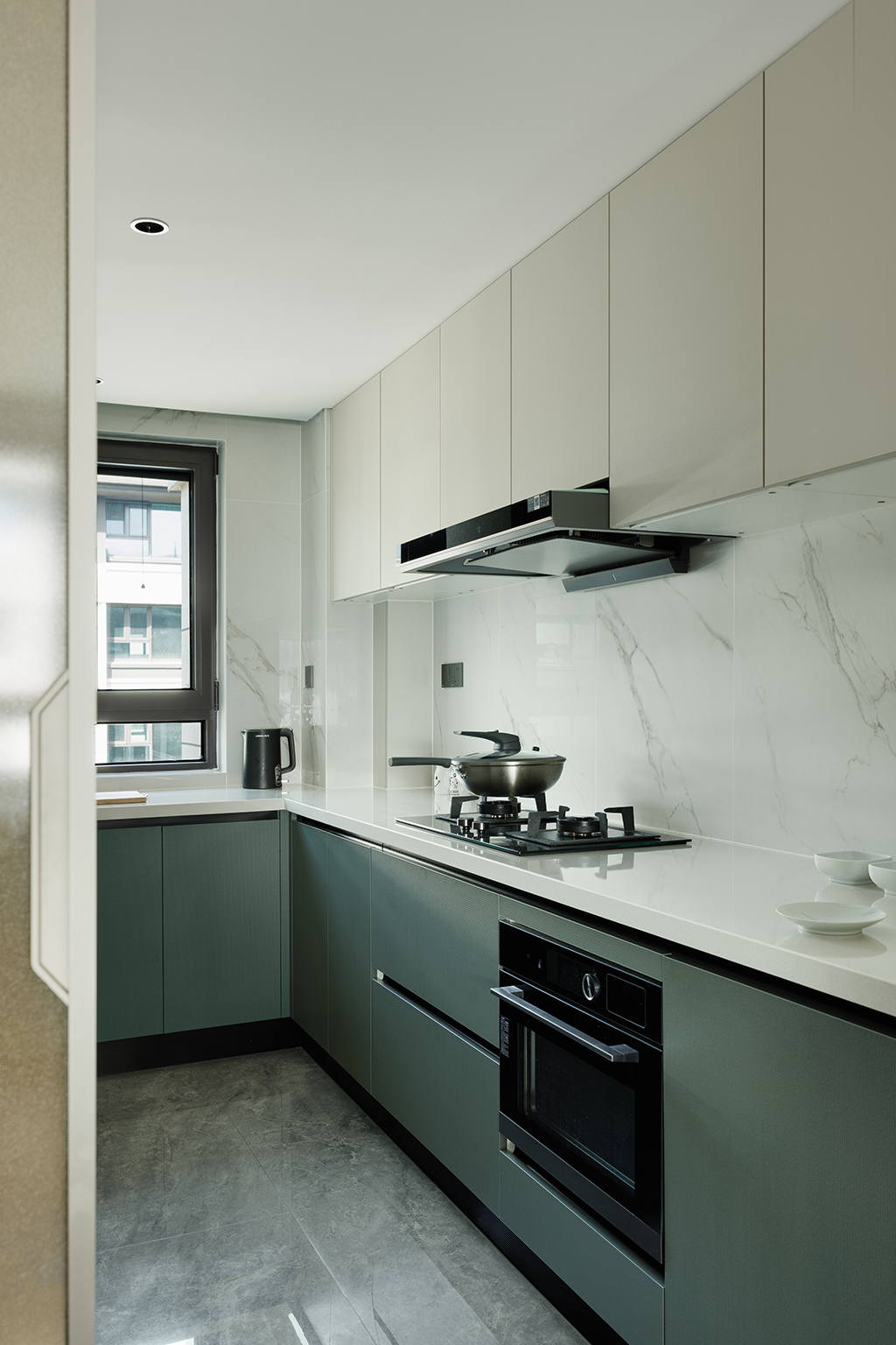 U型橱柜采用绿色哑光柜门,台面为白色细腻质感石英石,墙面铺贴白色大理石纹瓷砖。绿色地柜与浅色吊柜形成层次,隐形金属拉手与黑色嵌入式电器提升现代感。
