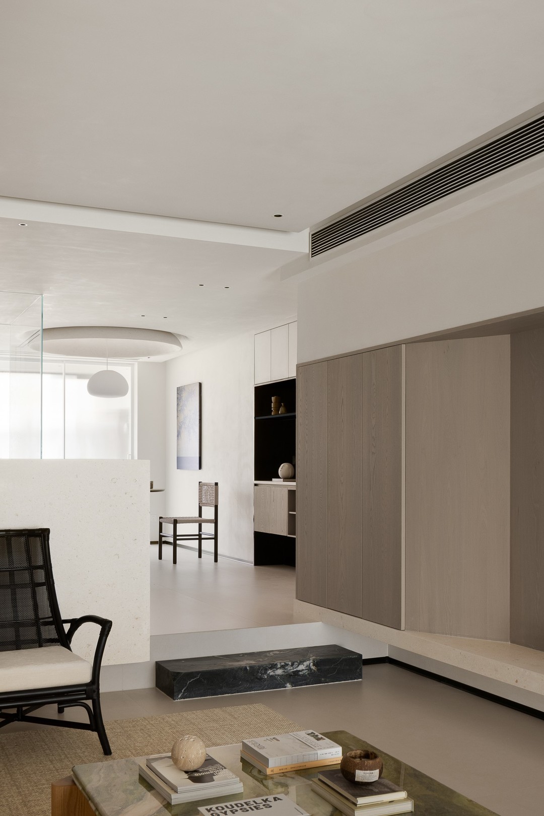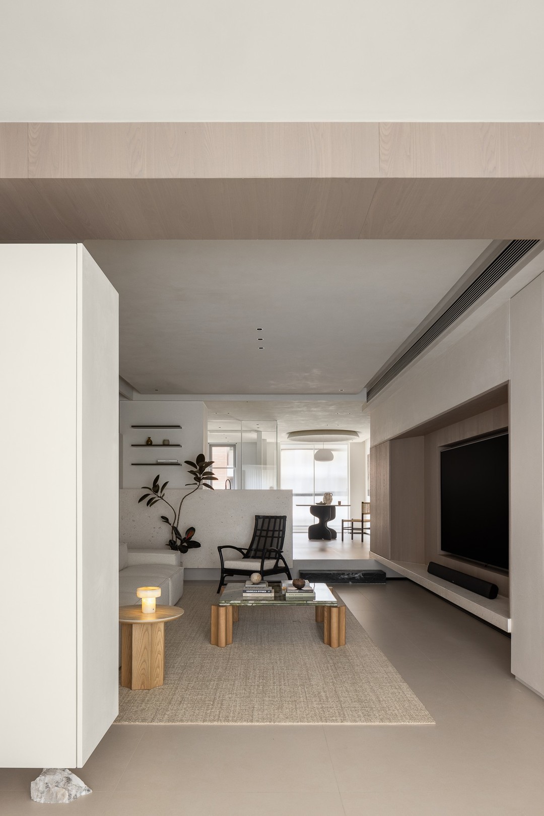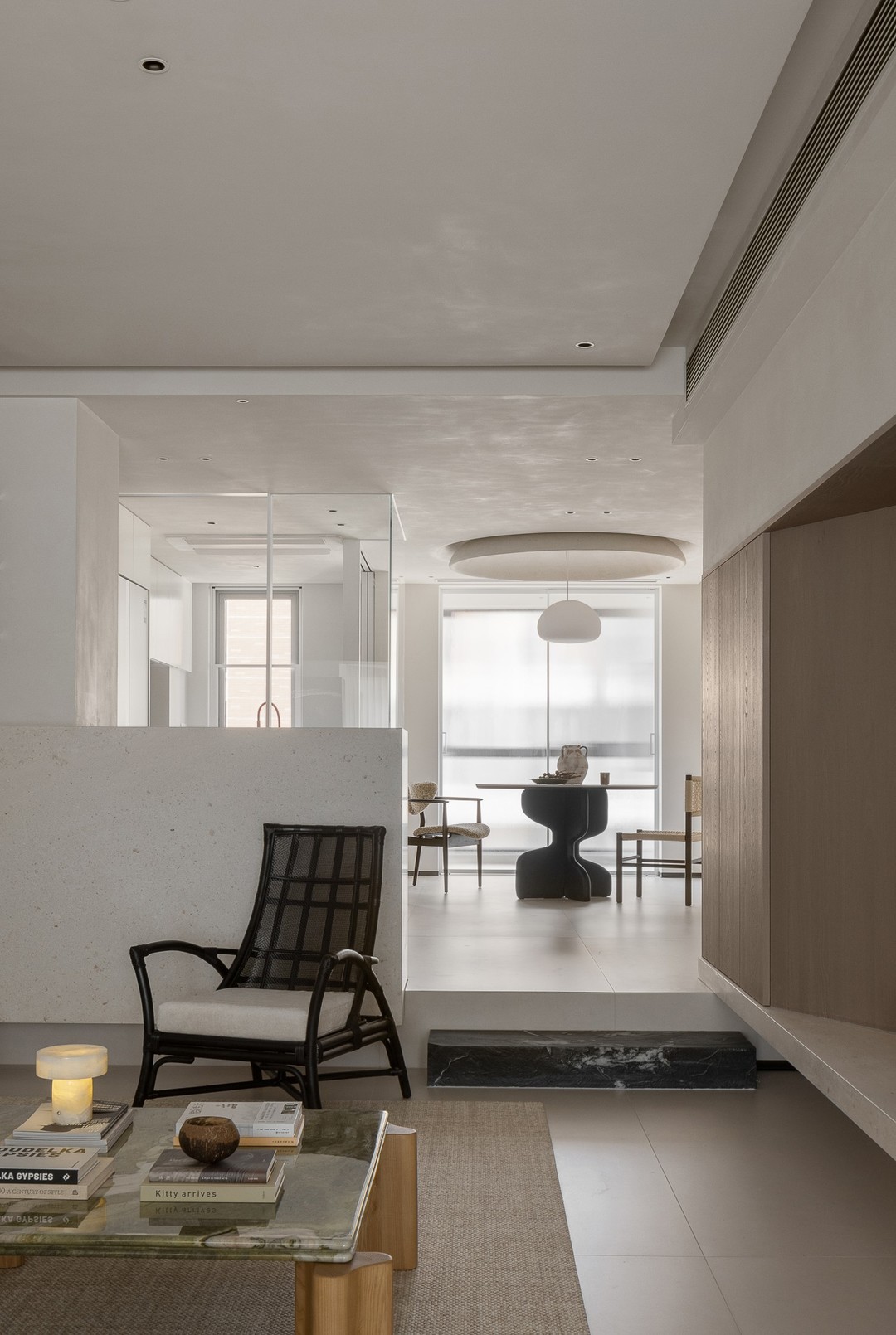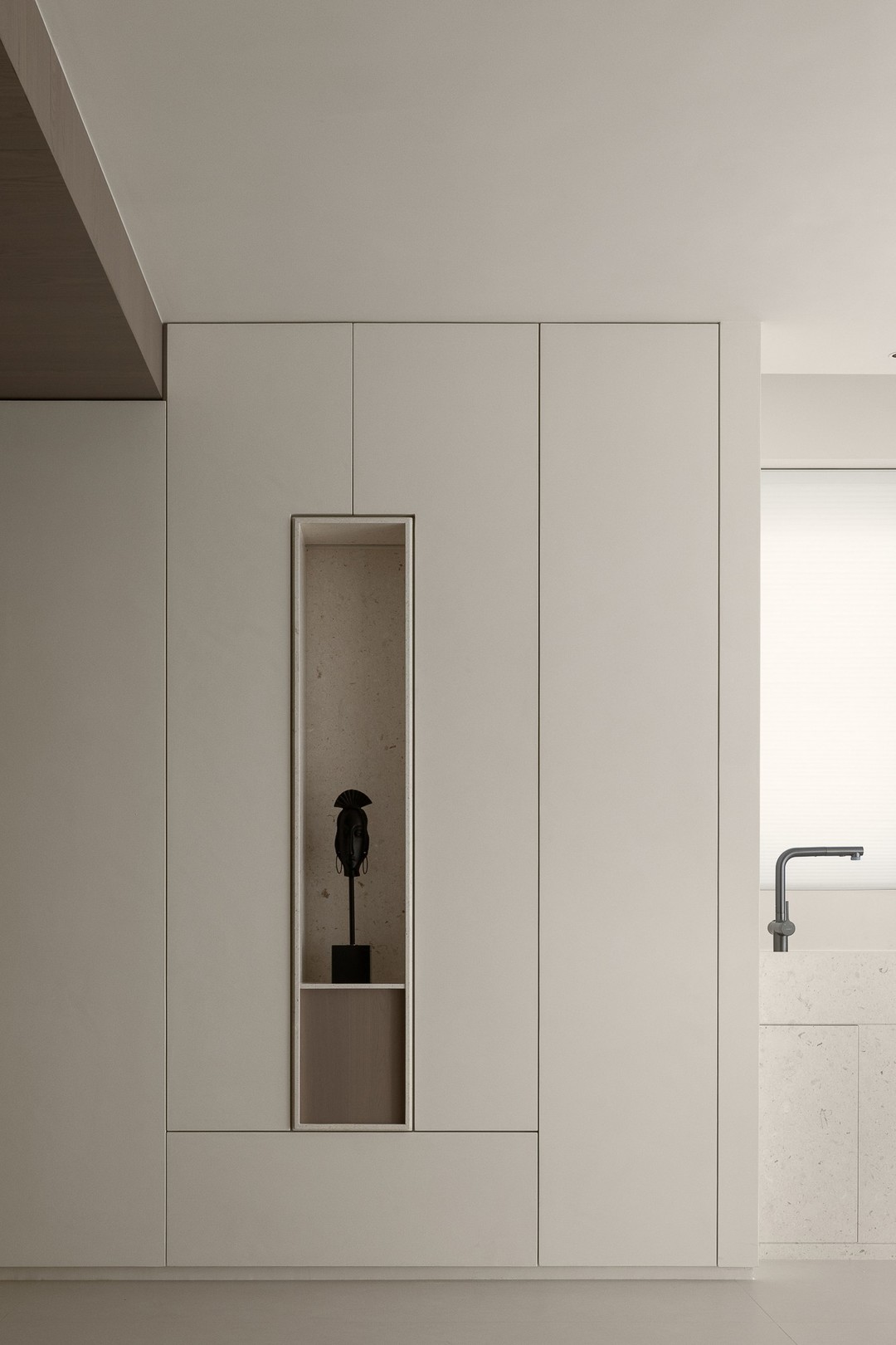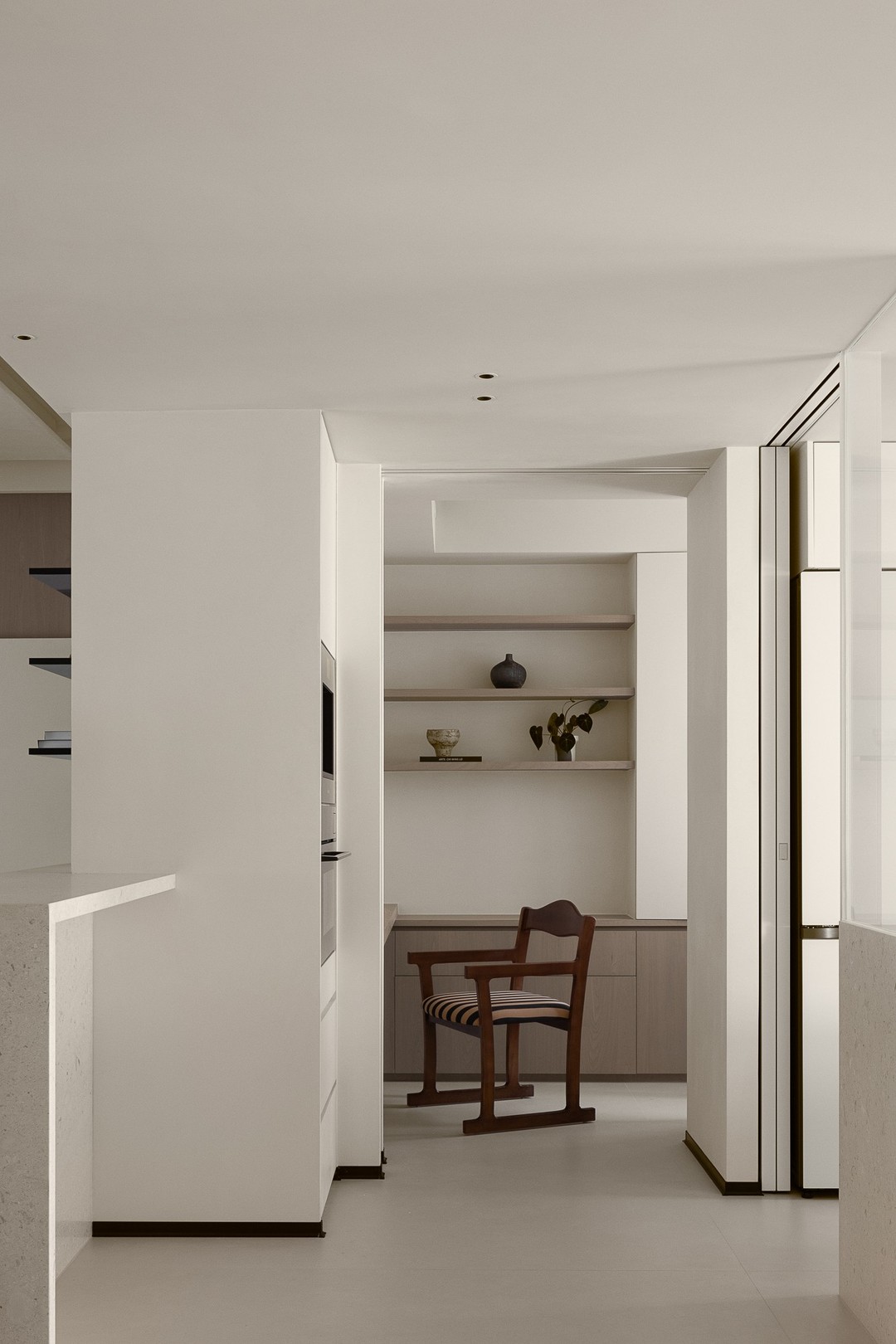 水吧台承续厨房的视感,做内凹处理,拓展出休闲场景。占据枢纽位置,方便客厅、餐厅、厨房或书房的人随时饮水。书房处,深浅递进,光影悠缓,器物含情,木椅候人,书写出公区的番外篇,助人在动静变化中生成无限心力。