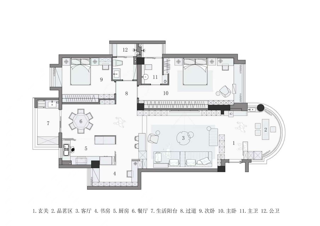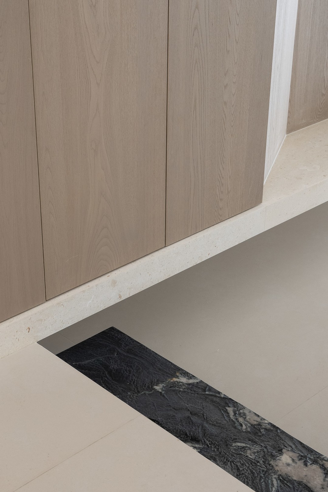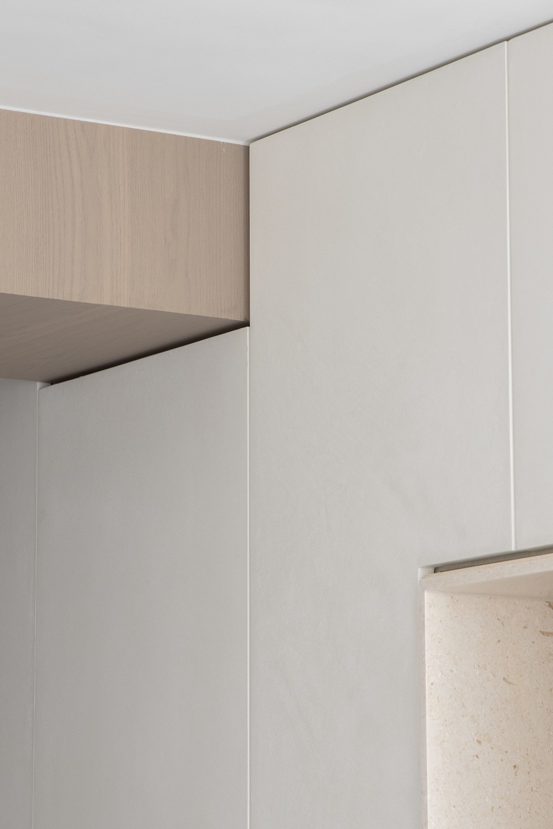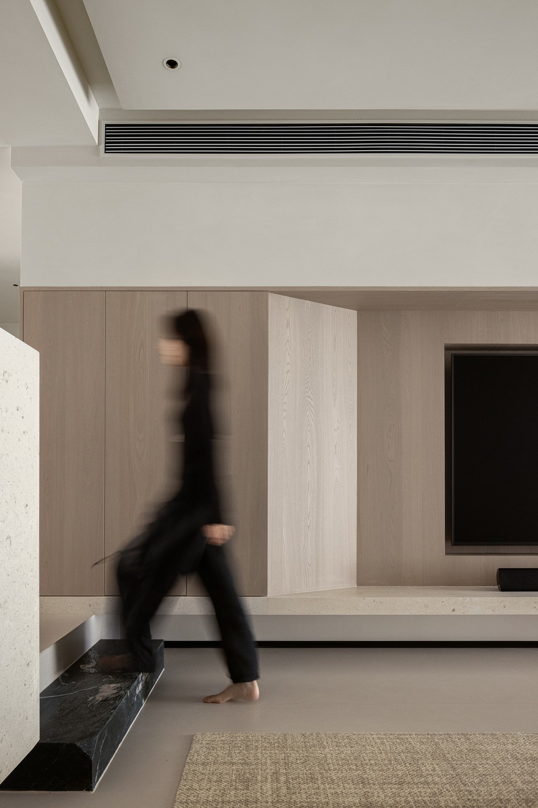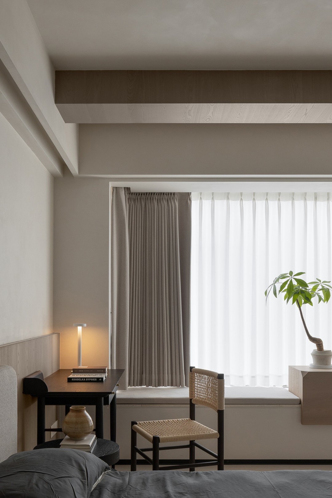 水吧台承续厨房的视感,做内凹处理,拓展出休闲场景。占据枢纽位置,方便客厅、餐厅、厨房或书房的人随时饮水。书房处,深浅递进,光影悠缓,器物含情,木椅候人,书写出公区的番外篇,助人在动静变化中生成无限心力。