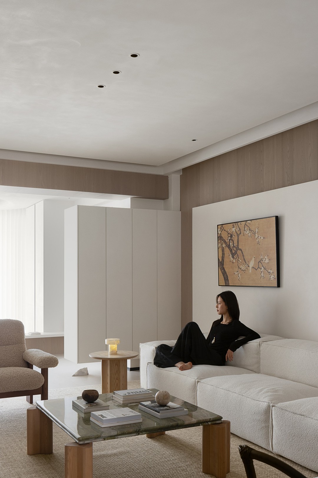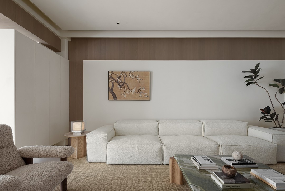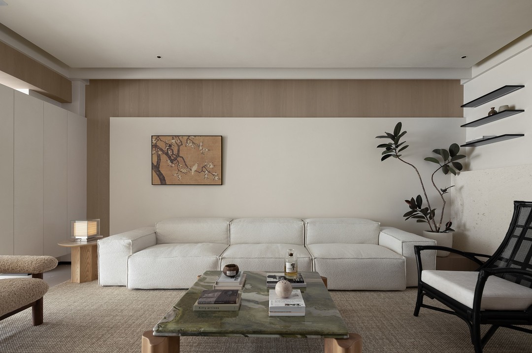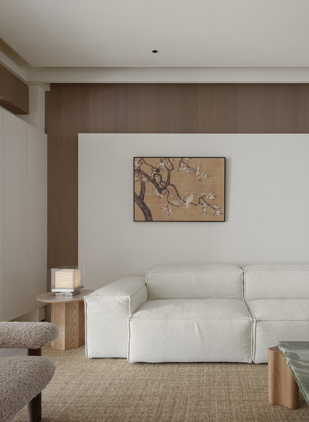 绿石、绿植与墙壁上的花鸟图,回响着灵动意趣。主人可随时陷进奶白色体块的温柔里,体验松弛,无惧纷扰。以木饰面作为背景,叠色叠画,置暖光,织交情,把身心治愈,沉浸在自洽舒怡的氛围里。