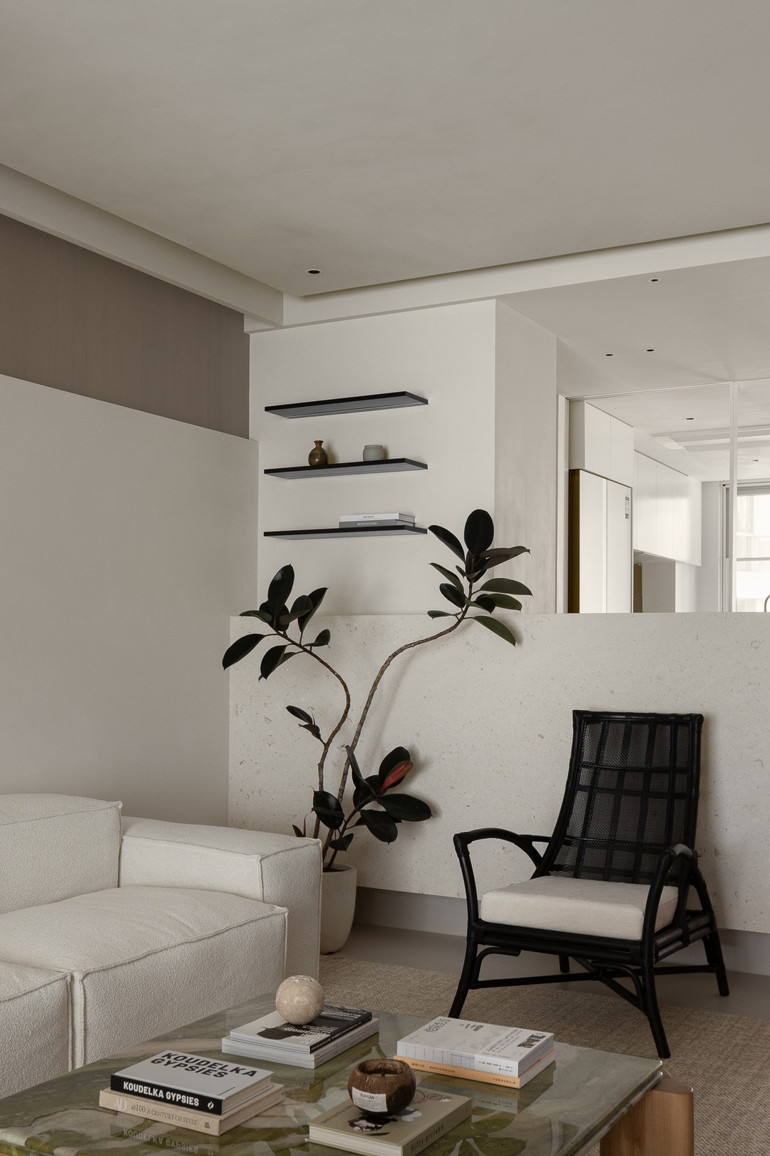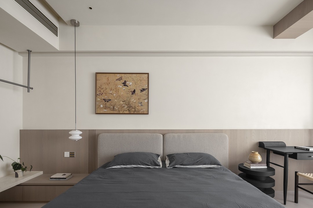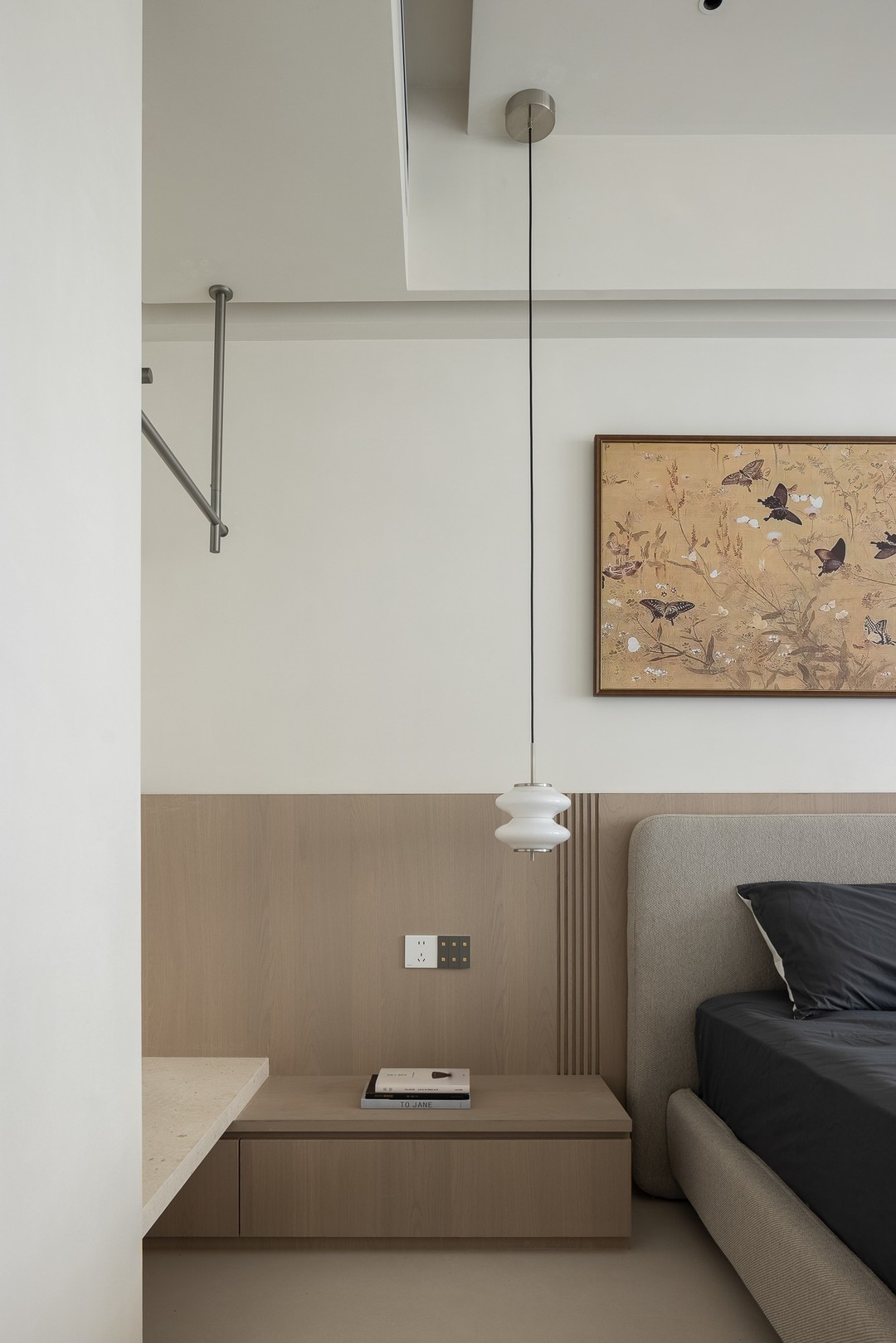 绿石、绿植与墙壁上的花鸟图,回响着灵动意趣。主人可随时陷进奶白色体块的温柔里,体验松弛,无惧纷扰。以木饰面作为背景,叠色叠画,置暖光,织交情,把身心治愈,沉浸在自洽舒怡的氛围里。