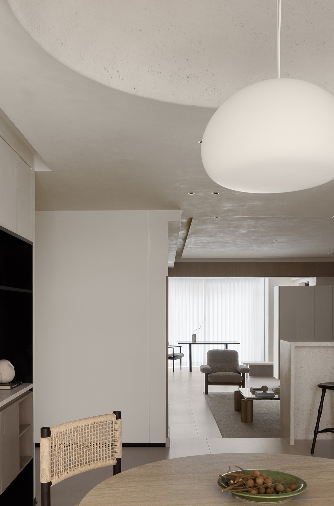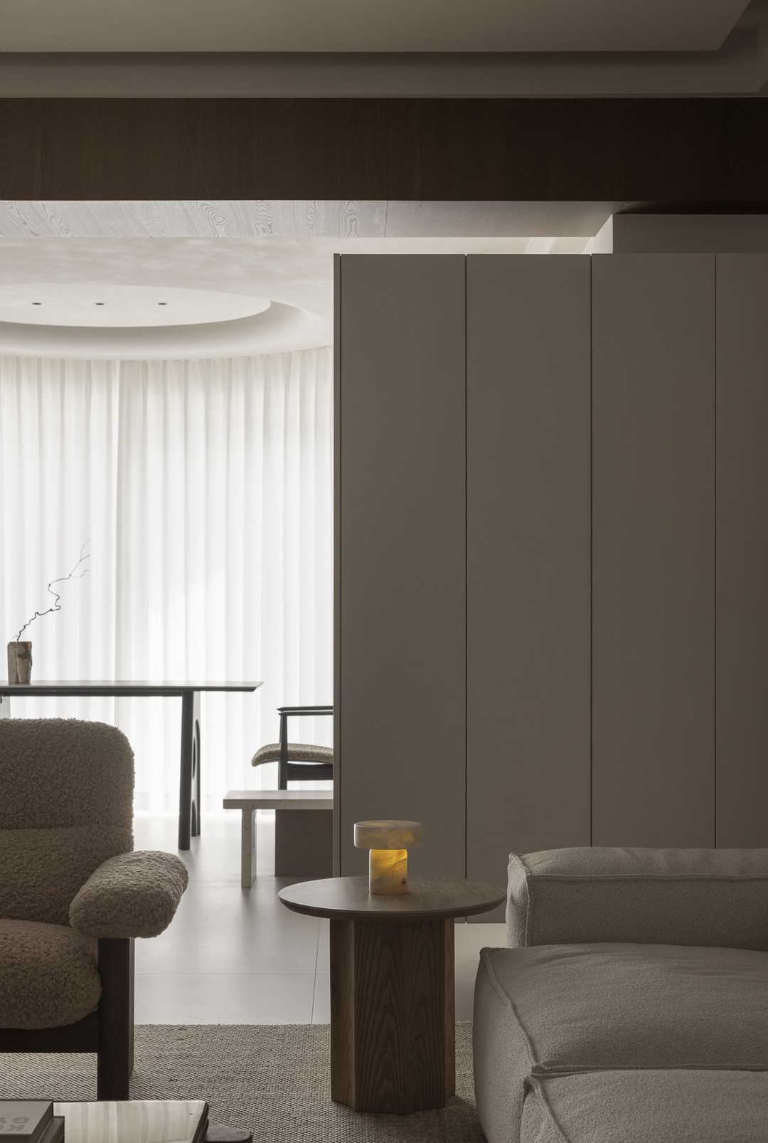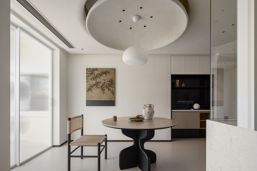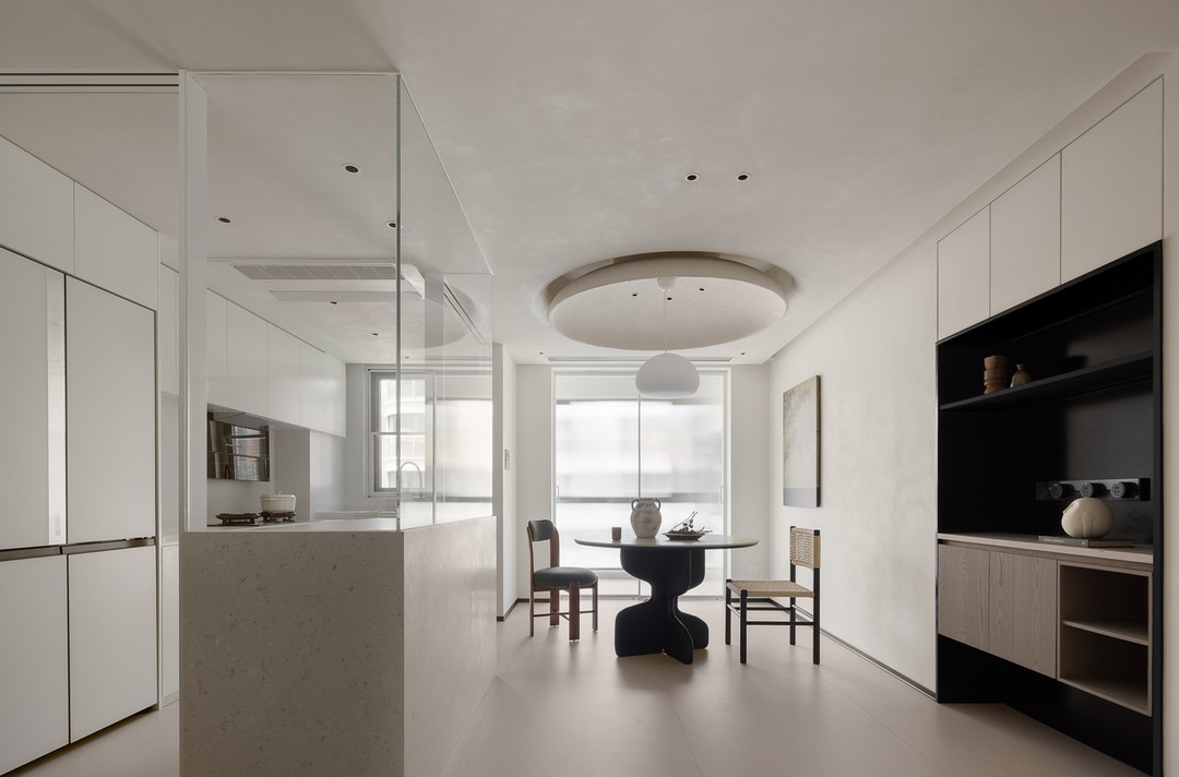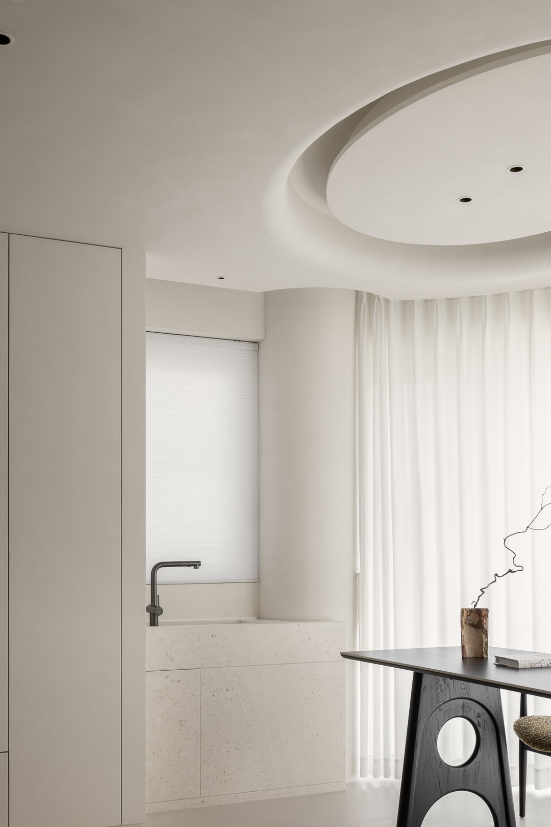 视线穿过收纳系统落向品茗区,纯白薄帘衬托出素雅之美,圆形吊顶为开放的格局营造一份独立感,驱散喧嚣,孕育静谧。当手执茶盏,清香展开跨维度地流转,让过往的雅集意境汇聚此间,与心对话,便知简、知纯、知逍遥。