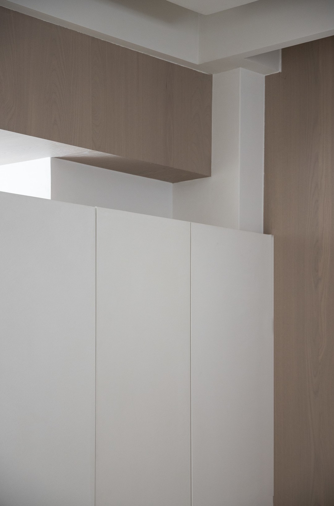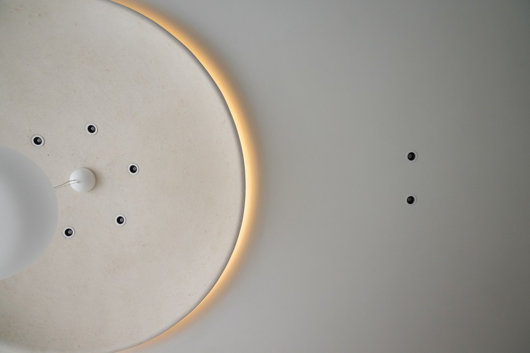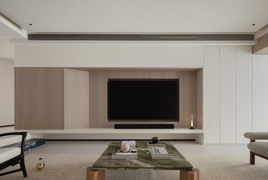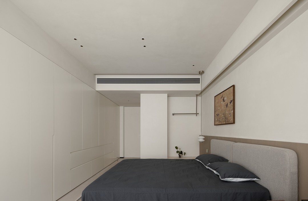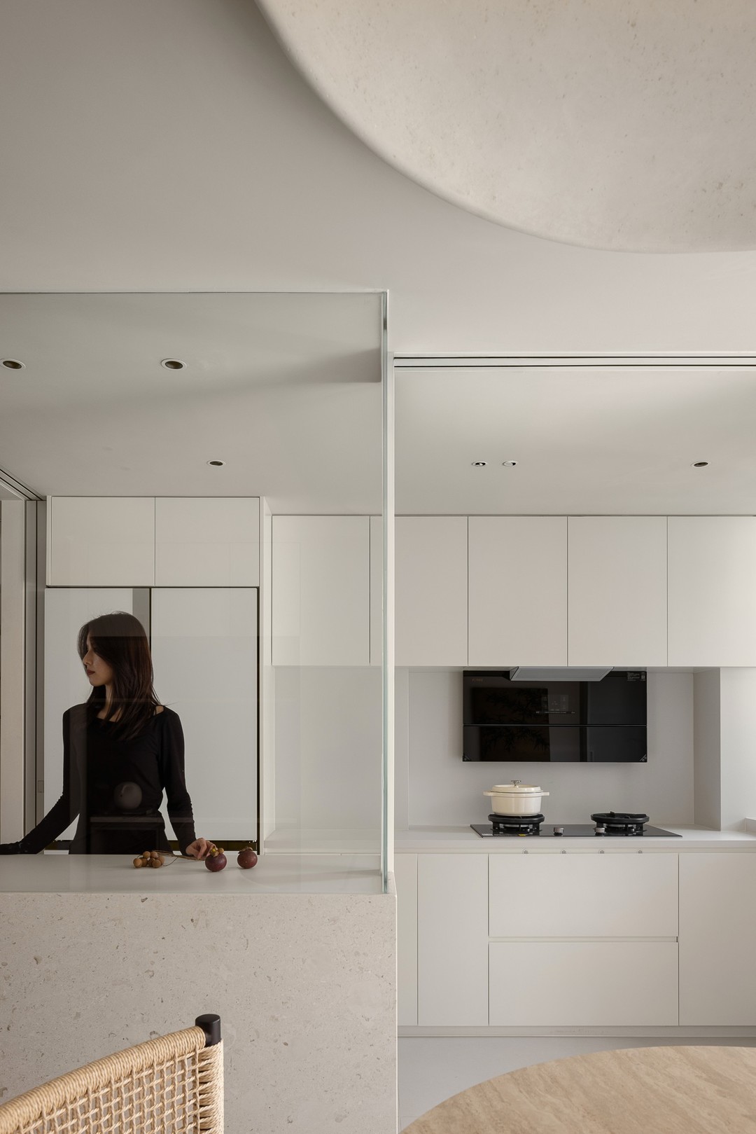 视线穿过收纳系统落向品茗区,纯白薄帘衬托出素雅之美,圆形吊顶为开放的格局营造一份独立感,驱散喧嚣,孕育静谧。当手执茶盏,清香展开跨维度地流转,让过往的雅集意境汇聚此间,与心对话,便知简、知纯、知逍遥。