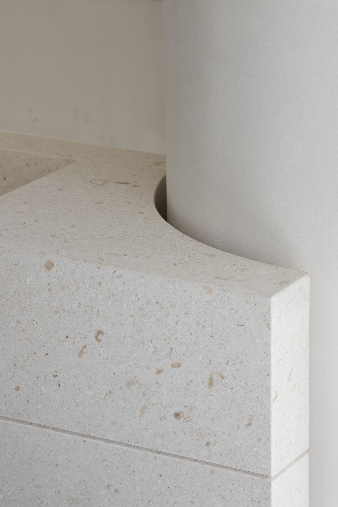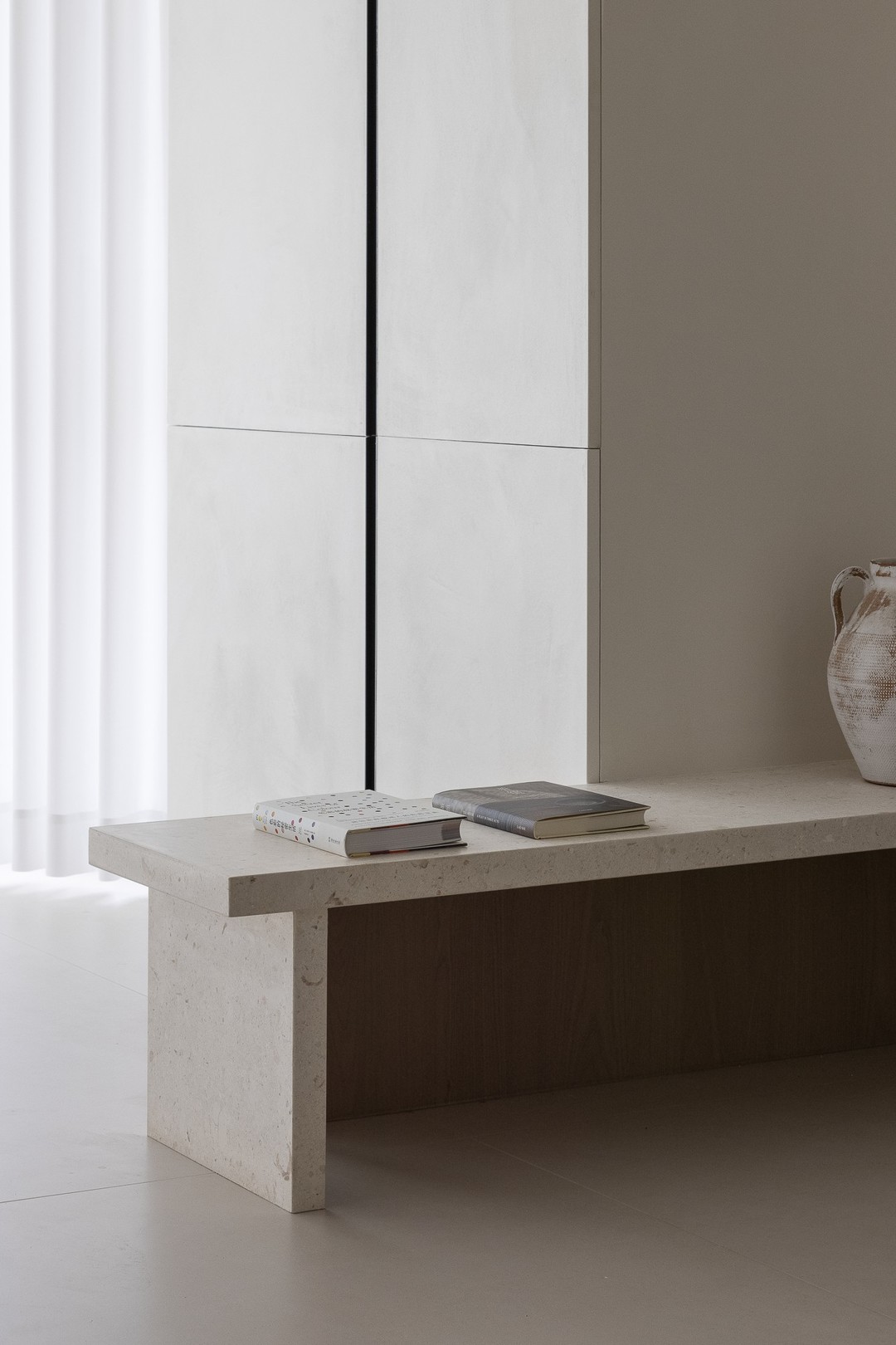 推开家门,就像跌进了月光酿的蜜罐。由月光米黄石板打造的座椅,是月亮偷偷裁下的一块星光石,坐上去,看得见书中精彩,也听得见家的故事。前方的嵌入式造型,借“艺术收纳格”的名义,呼应左侧原石支脚的自然气息,亲近阳光与微风。
