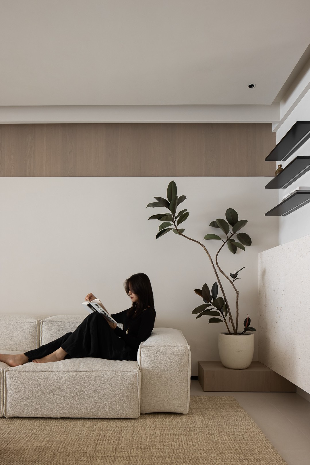所谓“诗意”,在马丁·海德格尔看来是人对存在的“解蔽”能力——通过诗歌、艺术或对自然的沉思,揭示存在的本真面貌,对抗外部的纷杂。空间以重色共鸣暗部,以斜面跃动正面,让曲直界面自然相融,照见一家三口与柴犬诗意栖居的模样。