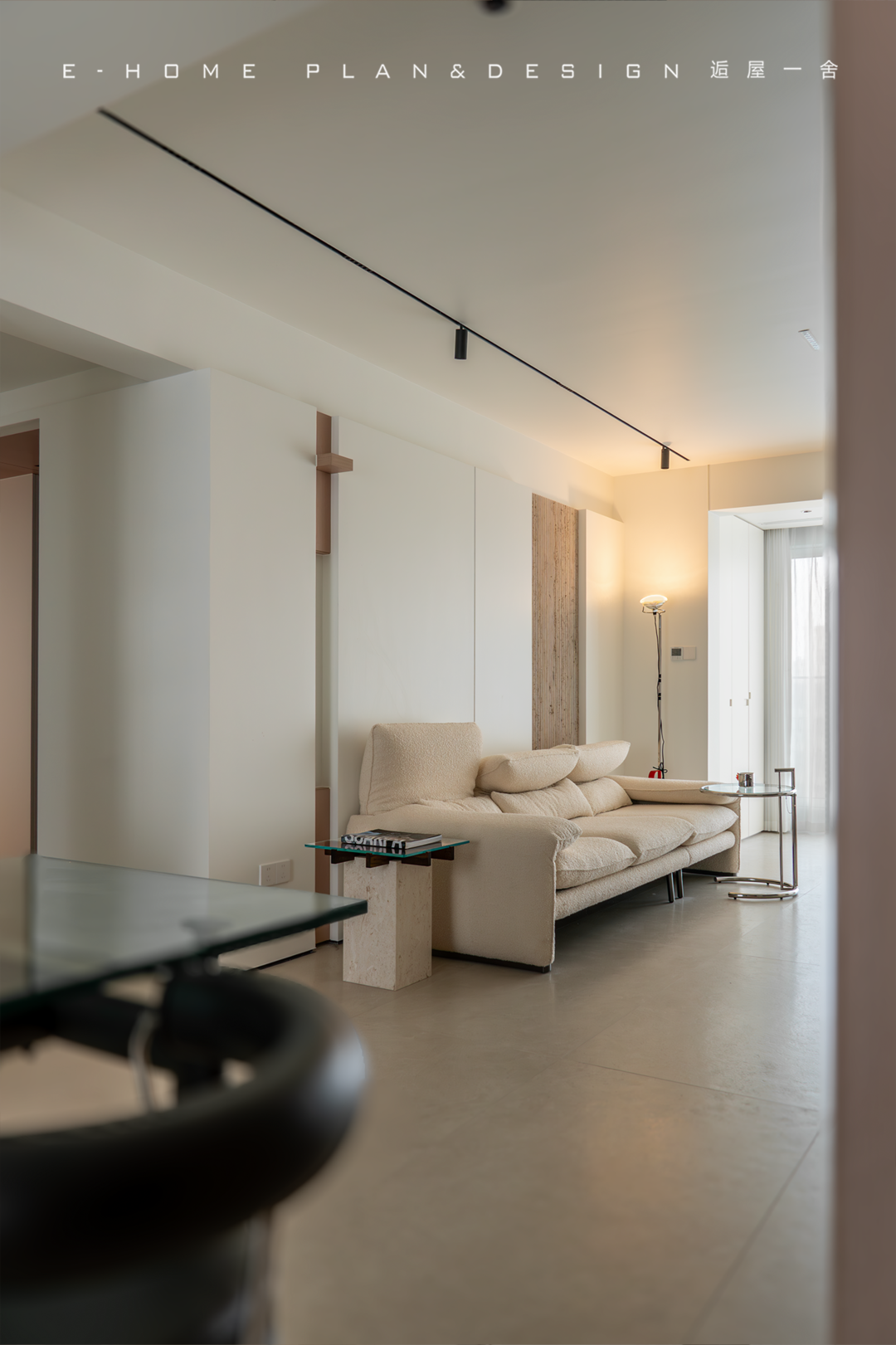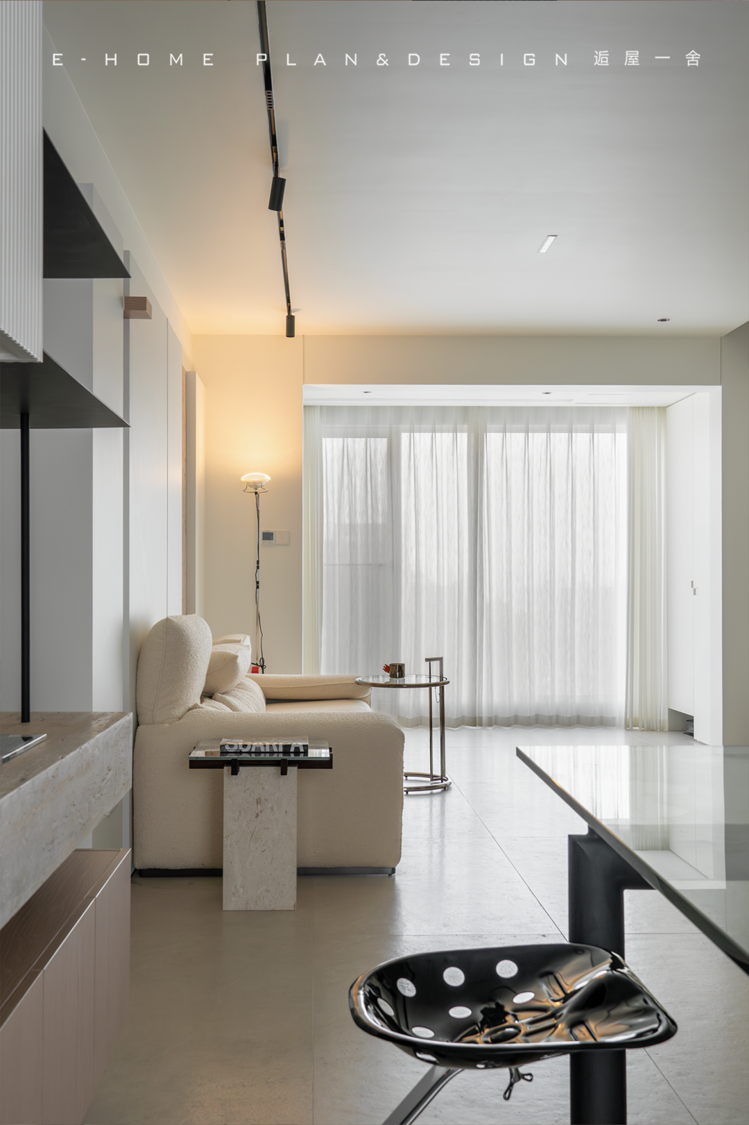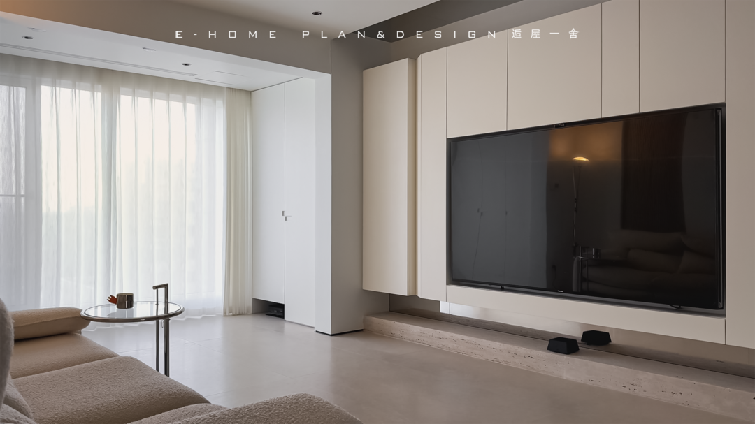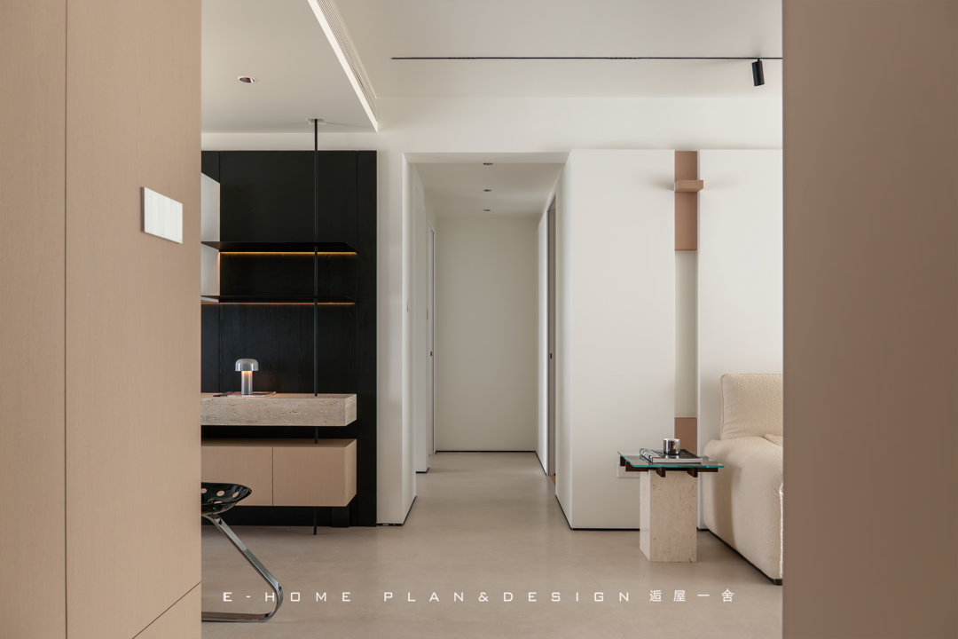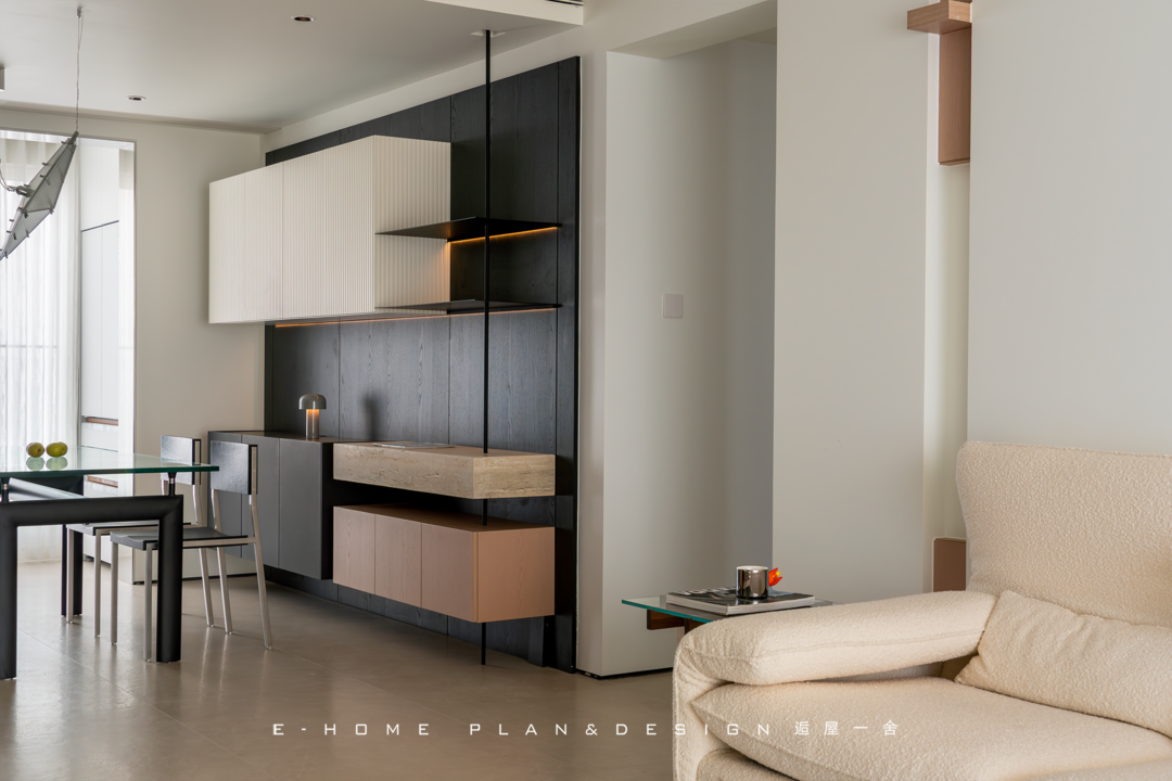 是可以闲庭信步的游荡氛围,客餐厅一深一浅左右开弓,铺设出清晰的开阔布局,我们会被大面积的采光吸引,原因一个来自于窗帘的二次过滤,另一个则是整面墙的白色储物系统;空间内不预设传统茶几,但依旧顾及随手拿取的生活习惯,节奏明快大步地跳跃,只在使用细节处转折留空。