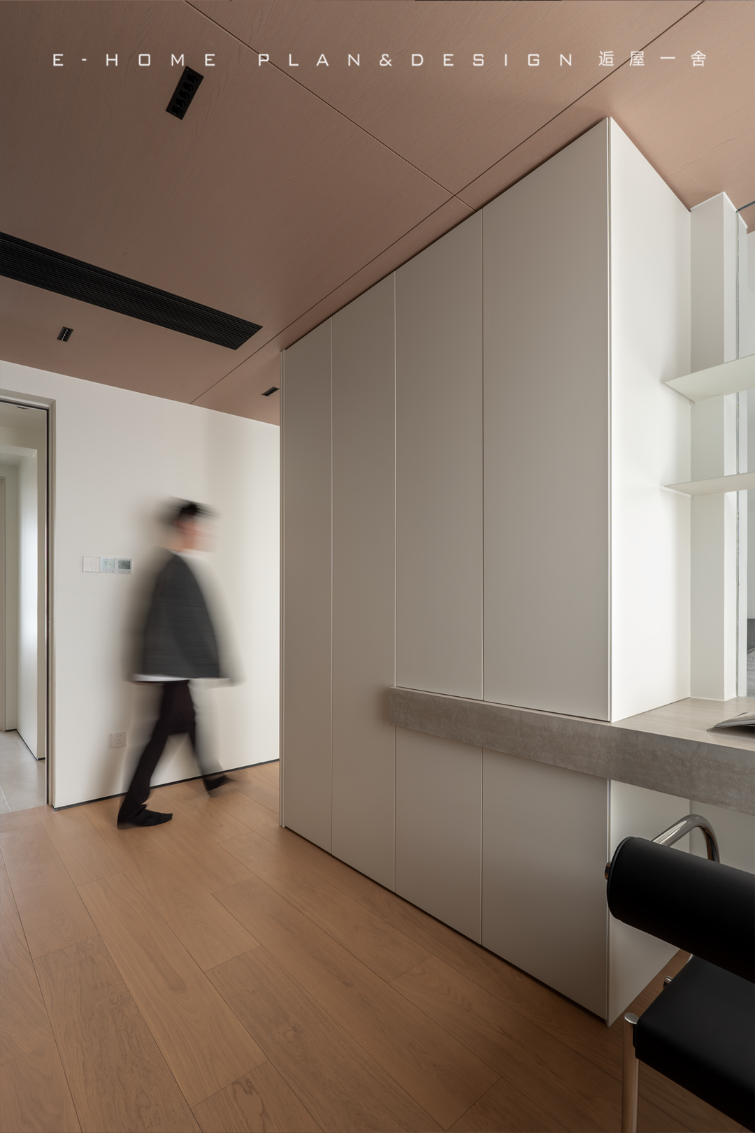 和休憩区域仅一个柜子之隔,故事就完全不同,木地板在蔓延的过程中,逐渐变换为和茱萸色的木饰面相接,从地面到顶面,折弯上去的延伸设计让休憩区域有着温暖而整体的包裹感。视觉上只留下干净的块面与利落的线条,衣帽收纳系统通过柜体的组合与转折,形成一个环抱睡眠区的流畅储藏区域。