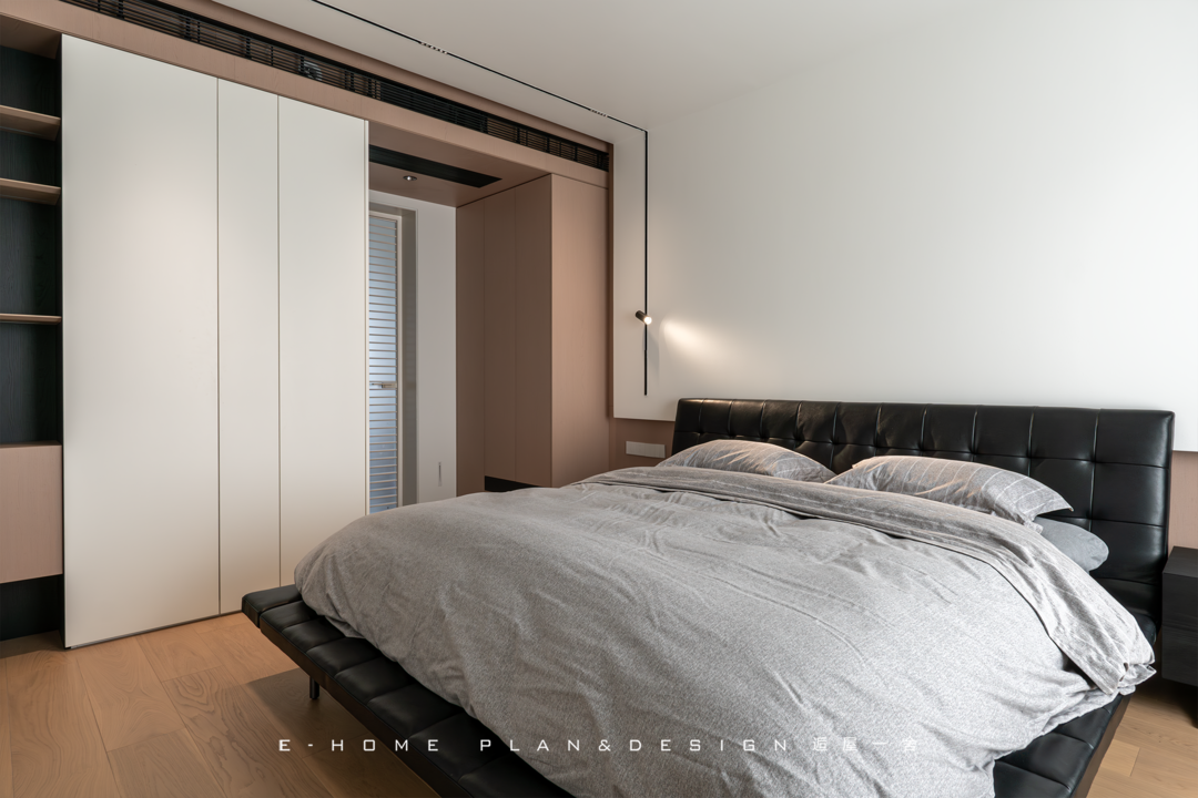 在材质与色系的递进中完成功能分区。板材的接缝处理精细,让柜体本身成为墙面造型的一部分,海量收纳需求被满足,又丝毫不显笨重与“仓库感”。而这里的灯光绝非一盏主灯了事,嵌入天花的基础照明提供均匀光线,床头的壁灯承担阅读与起夜的重点照明。这种组合允许屋主根据心情和需求切换光影模式,是借鉴酒店般放松氛围的技巧。