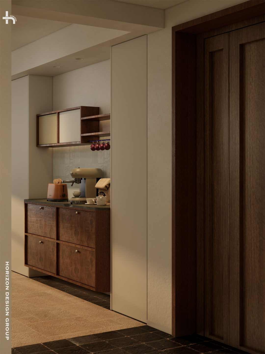 大面积覆盖中古风格木皮,小部分做天然石材点缀,最特别的是底部手工感的小方砖。
