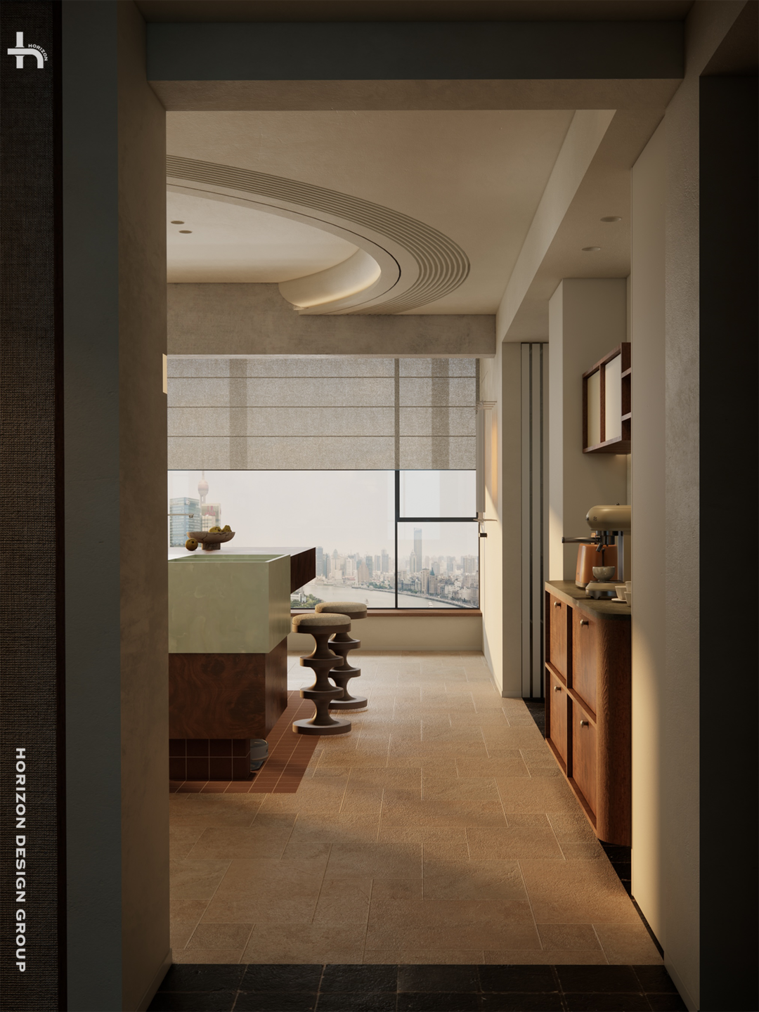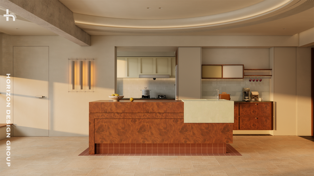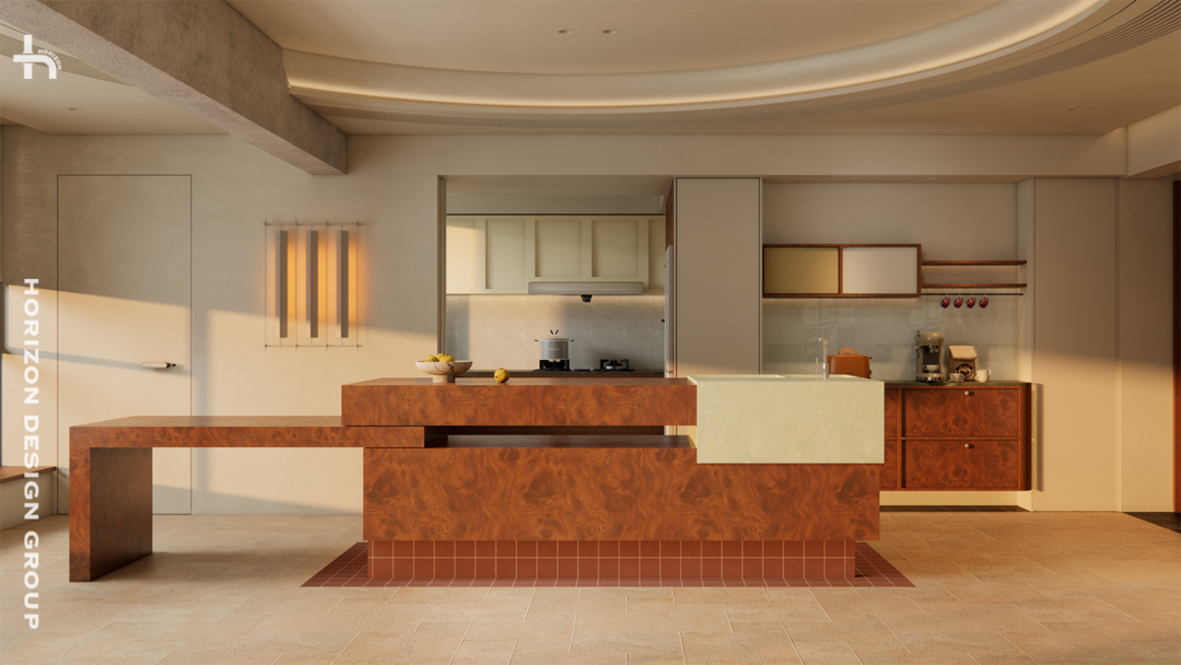 从深邃甬道的「画框」所凝视的焦点,正是家中充满灵魂的餐岛区域,它完美融合了中古韵味、实用功能、独特的材质艺术、独具特色的拉伸式设计以及三重材质的碰撞: