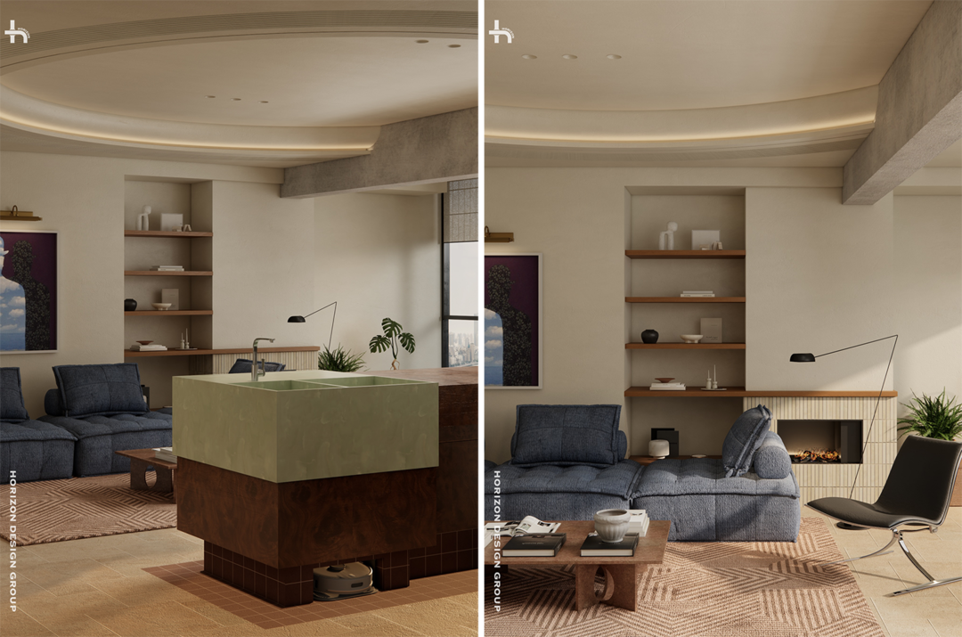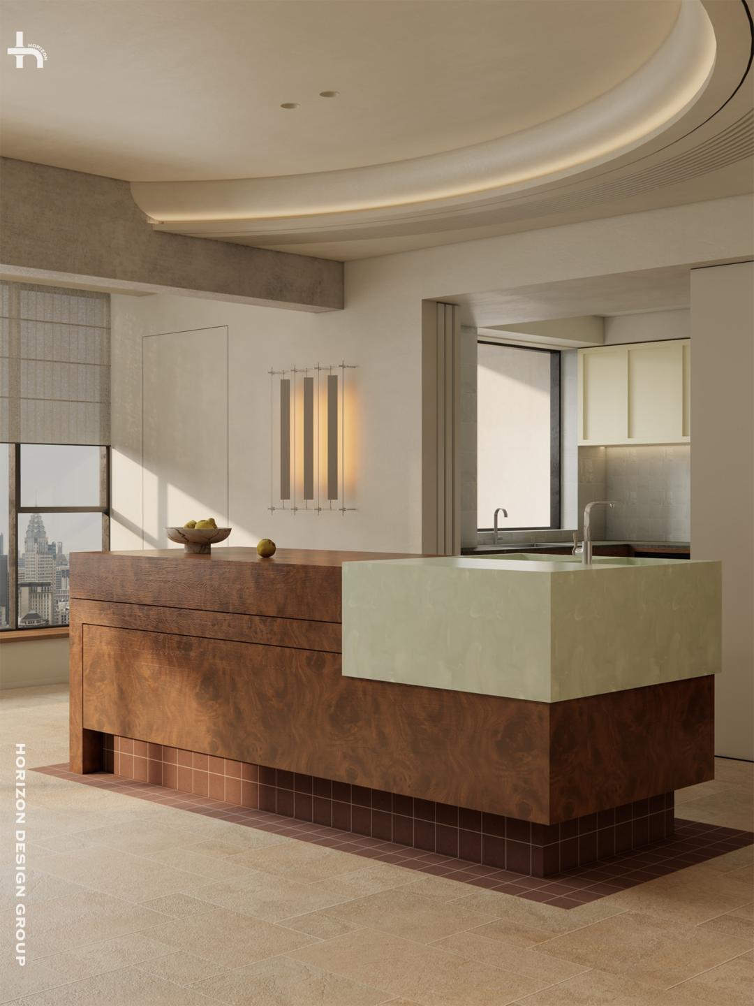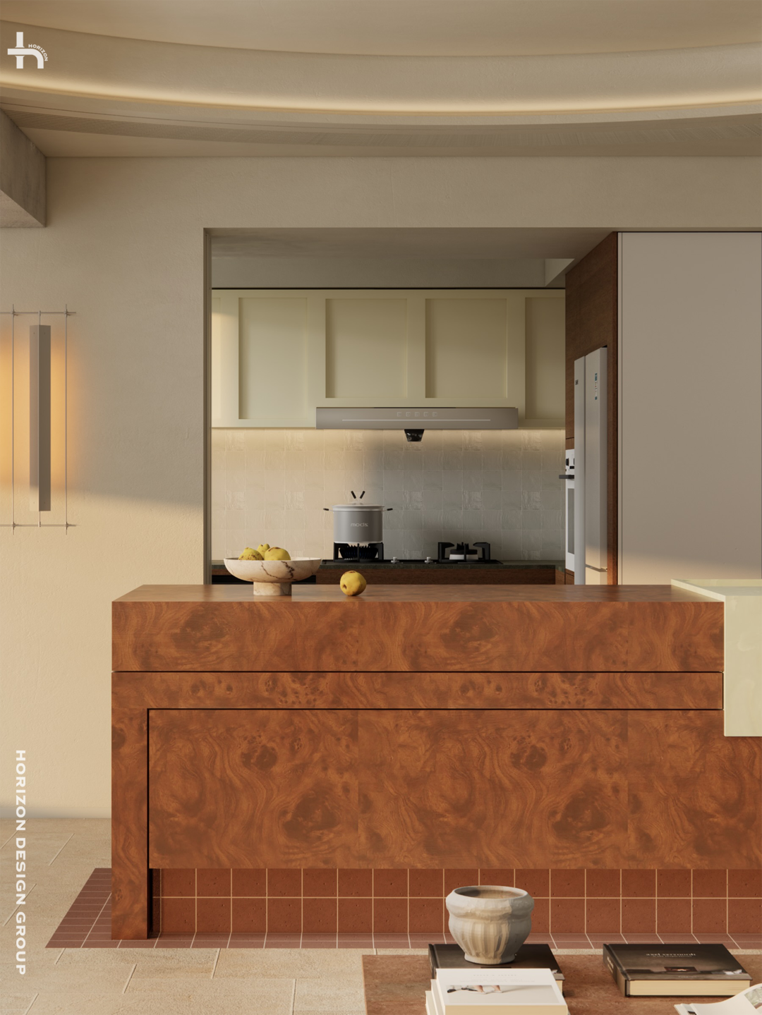 这一圈地面的小方砖超越常规的地面铺贴,犹如为岛台定制了专属的「底座」,使其成为空间中无可争议的视觉焦点。