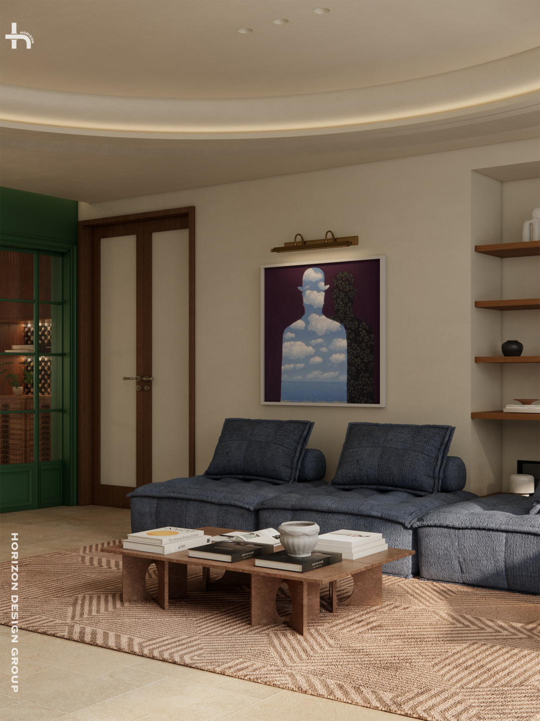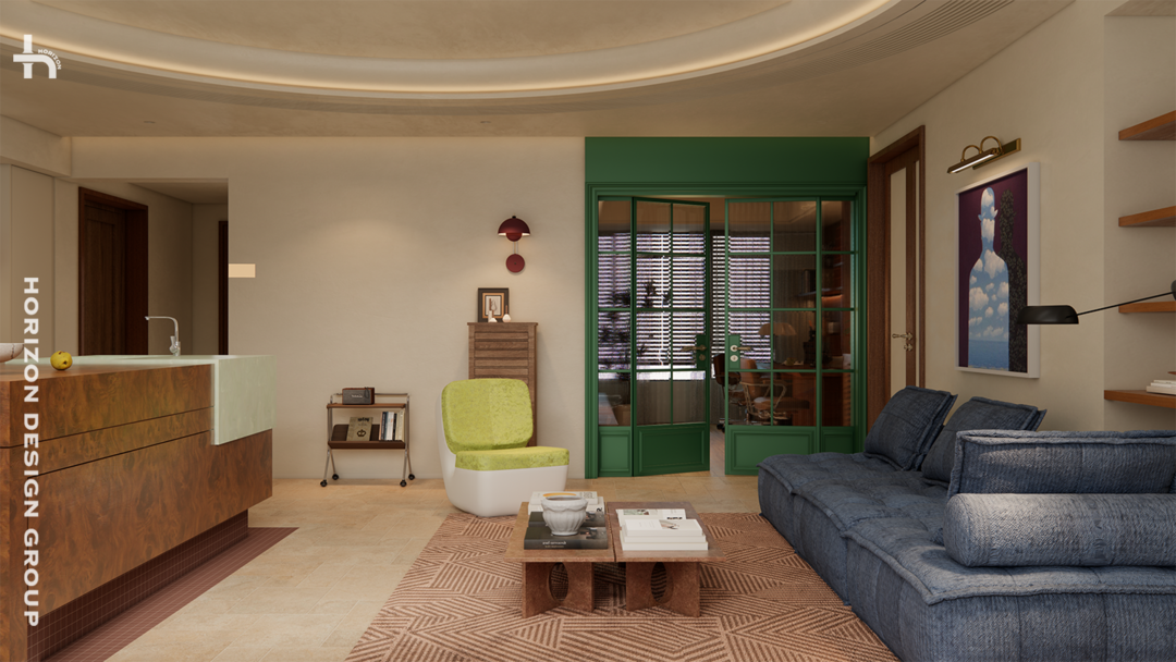 高饱和度的绿色推拉门毫无疑问是客厅的神来之笔,不仅完美融入整体空间基调,同时带来了戏剧性、复古灵魂和活力的点缀。