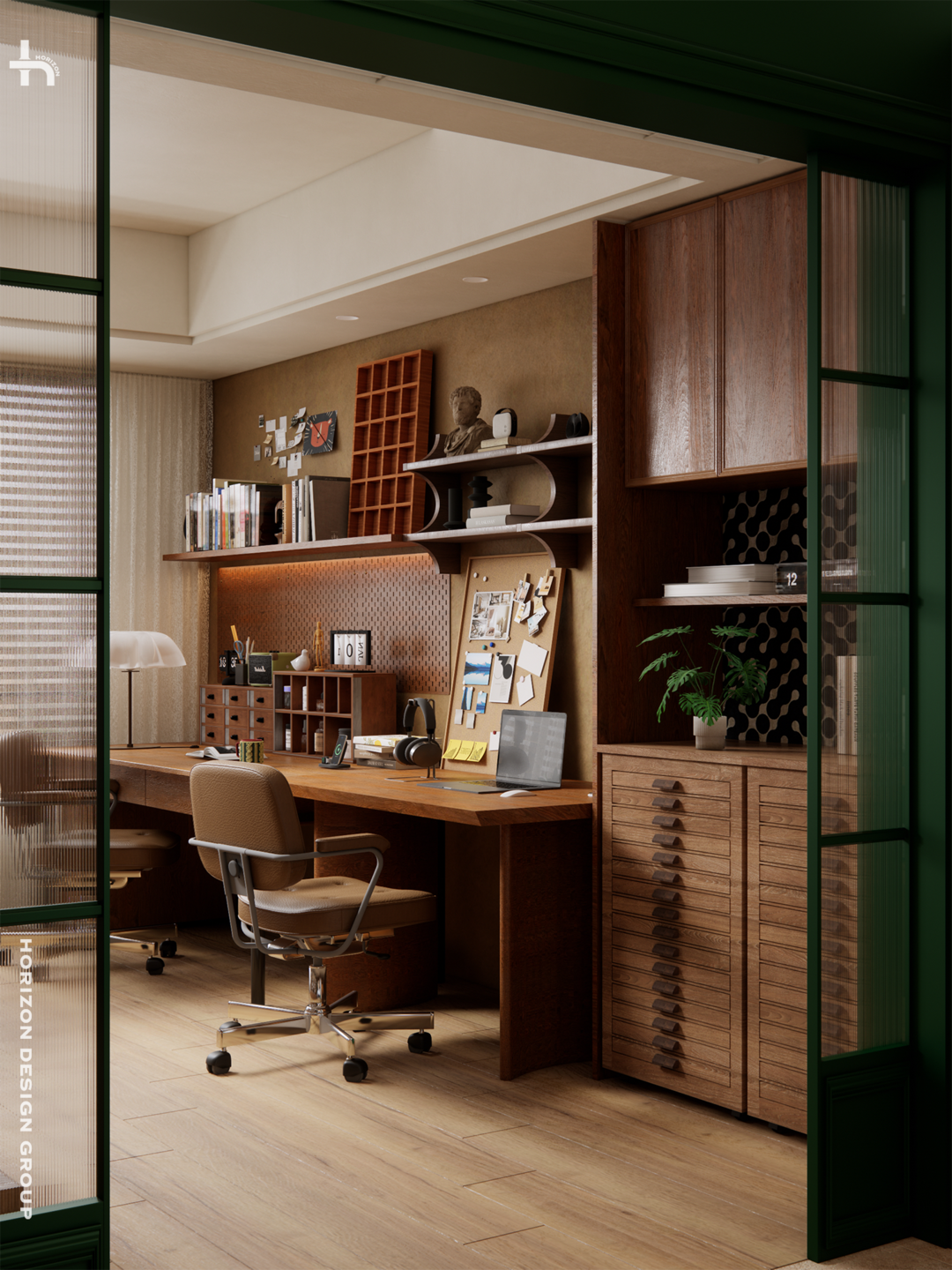 作为连接客厅和书房的门户,两个空间视觉上连通,增强了空间的流通感和灵活性,并且成为一个精致的画框,框出书房或客厅的一角景象,无形中增加了一份景深感。