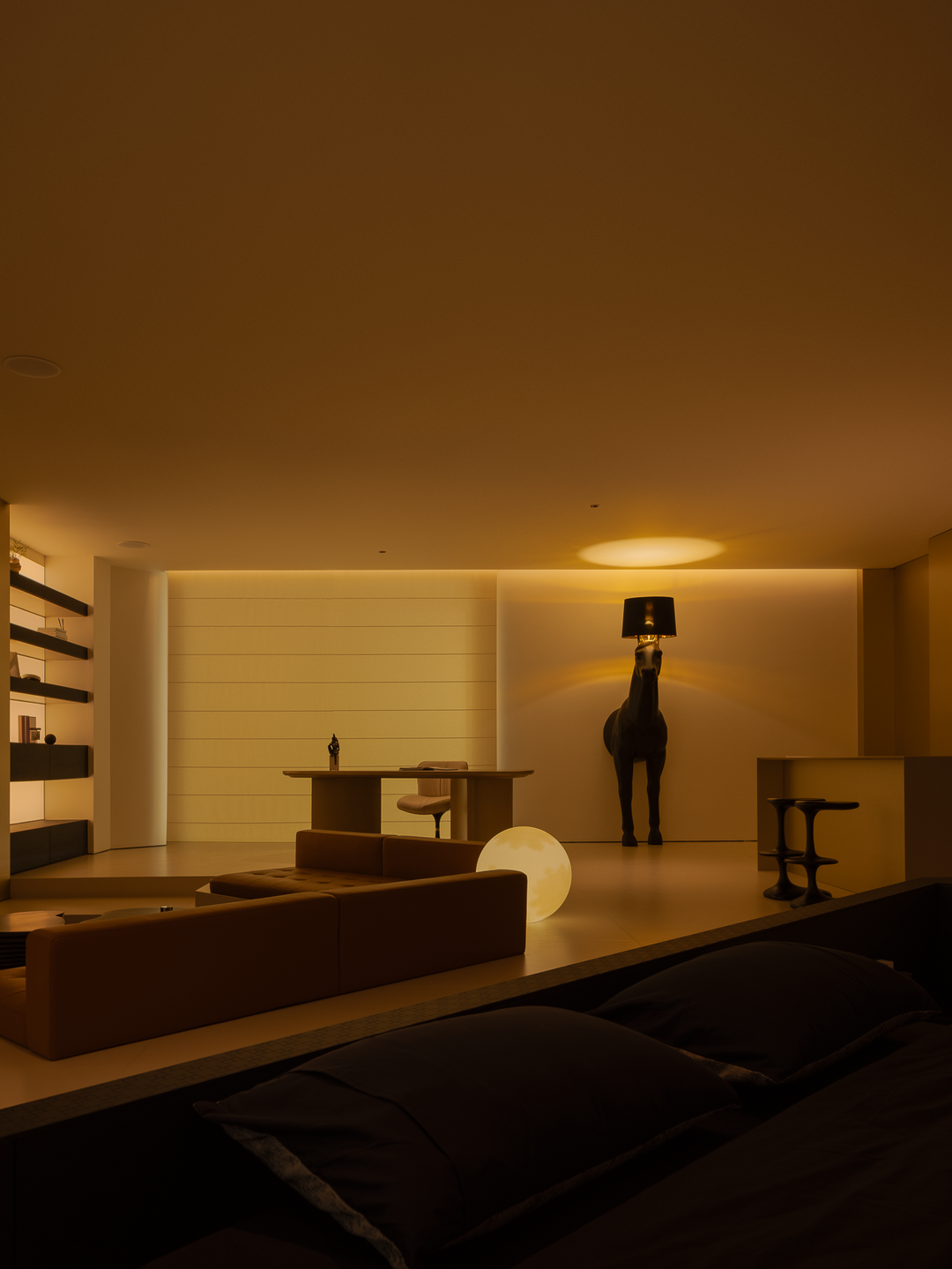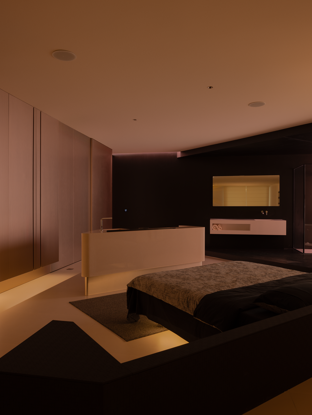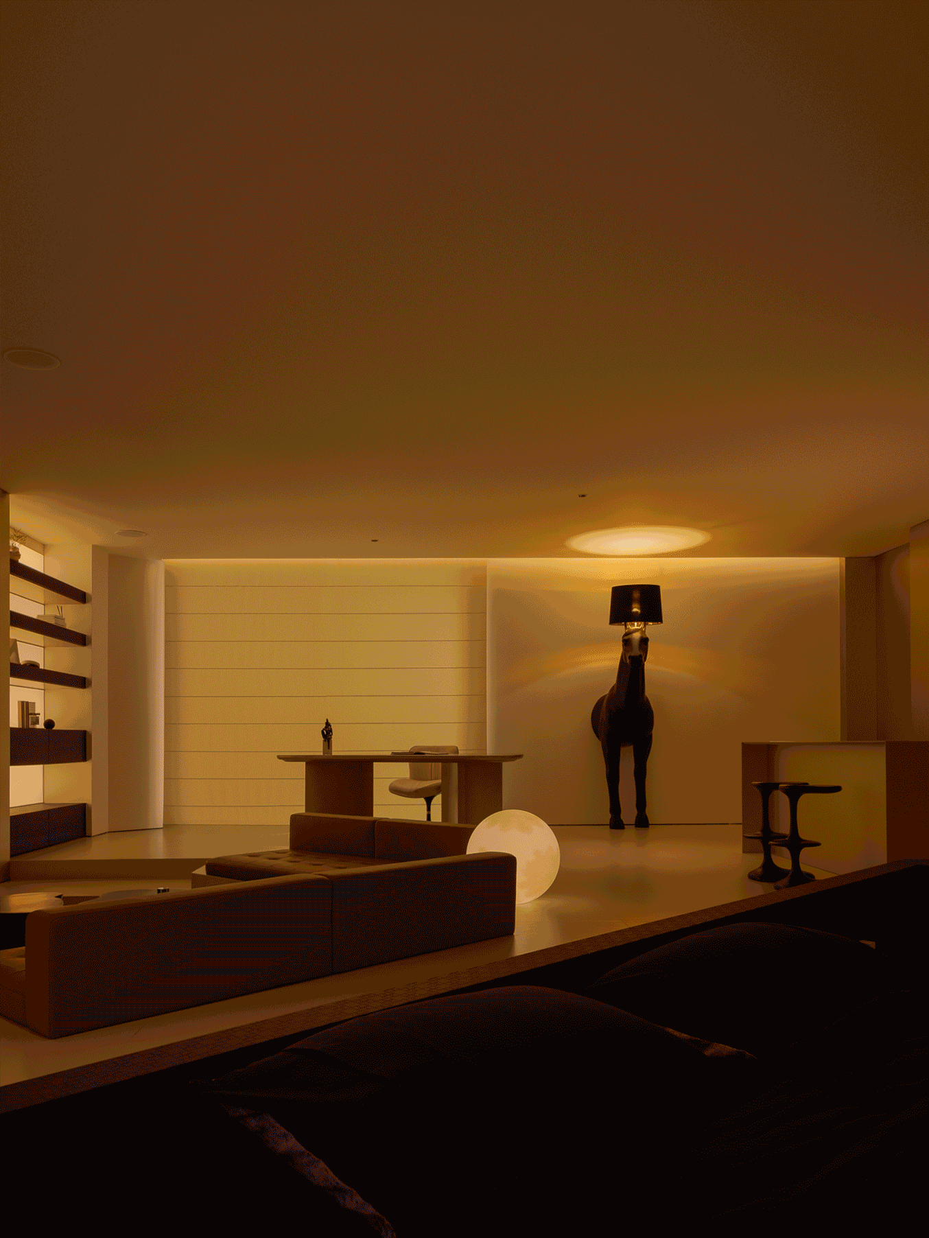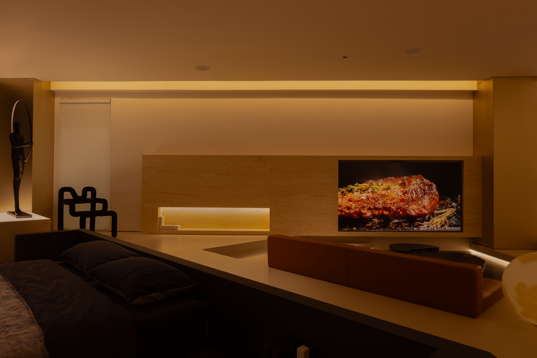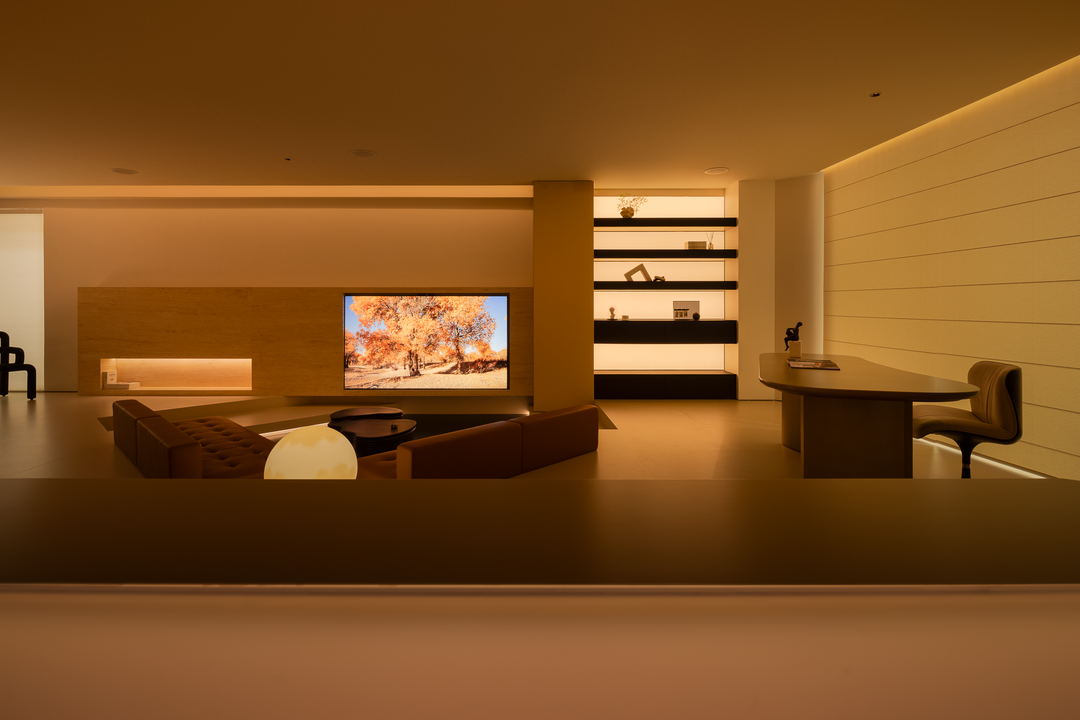 空间本身是极致的留白,所有实体皆为光的载体退让。按键启动,模式切换,光影瞬变。可以是白光覆盖,光谱精准模拟晨间情境,激活唤醒状态;也可以霓虹闪烁,表达夜晚派对的恣意与欢愉,任凭情绪沉沦;或是跌入黑暗,仅余临界微光与地脚线的线性指引,提供沉浸式的影音体验.…