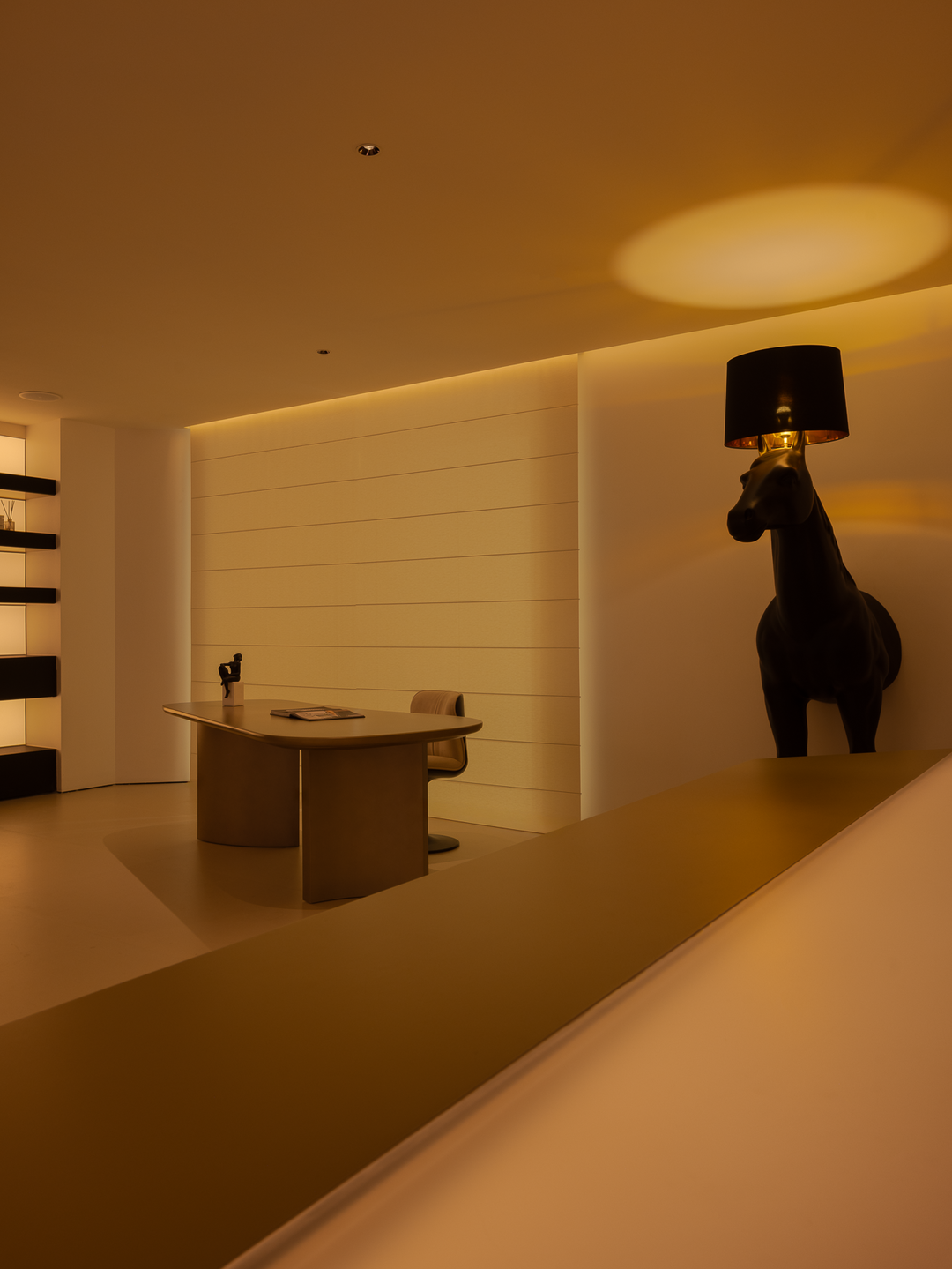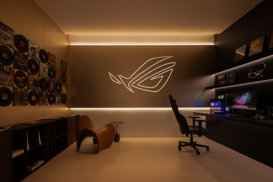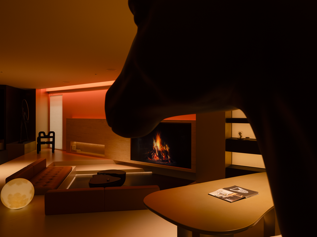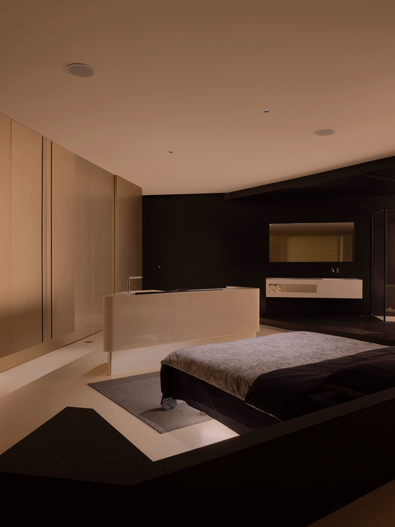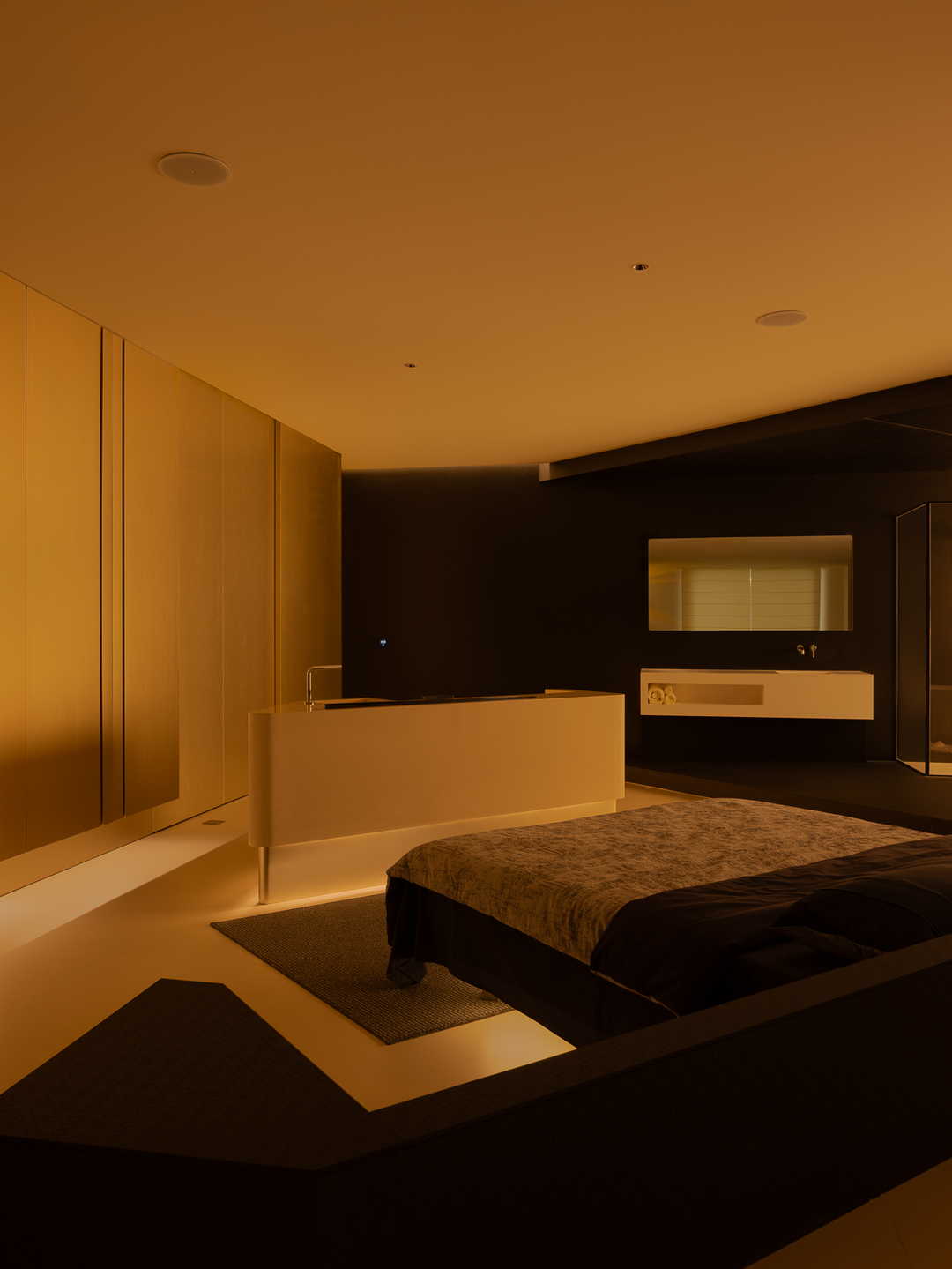 空间本身是极致的留白,所有实体皆为光的载体退让。按键启动,模式切换,光影瞬变。可以是白光覆盖,光谱精准模拟晨间情境,激活唤醒状态;也可以霓虹闪烁,表达夜晚派对的恣意与欢愉,任凭情绪沉沦;或是跌入黑暗,仅余临界微光与地脚线的线性指引,提供沉浸式的影音体验.…