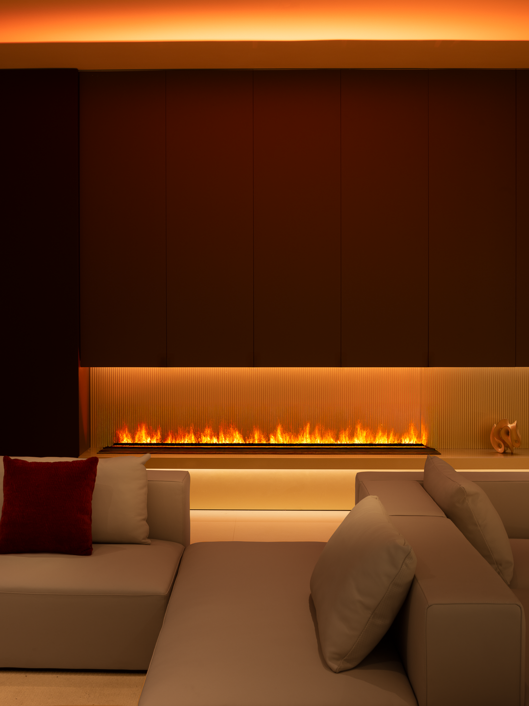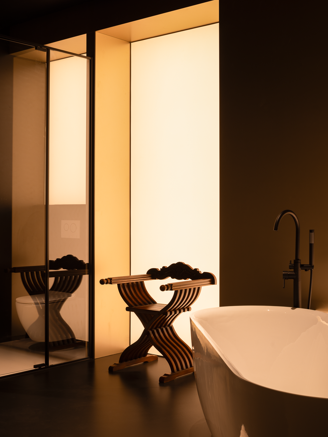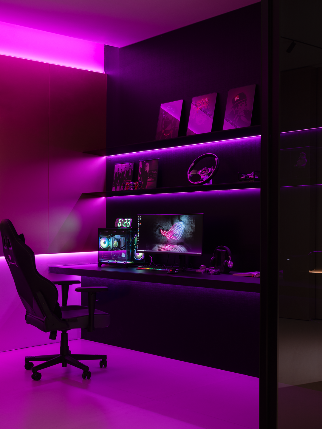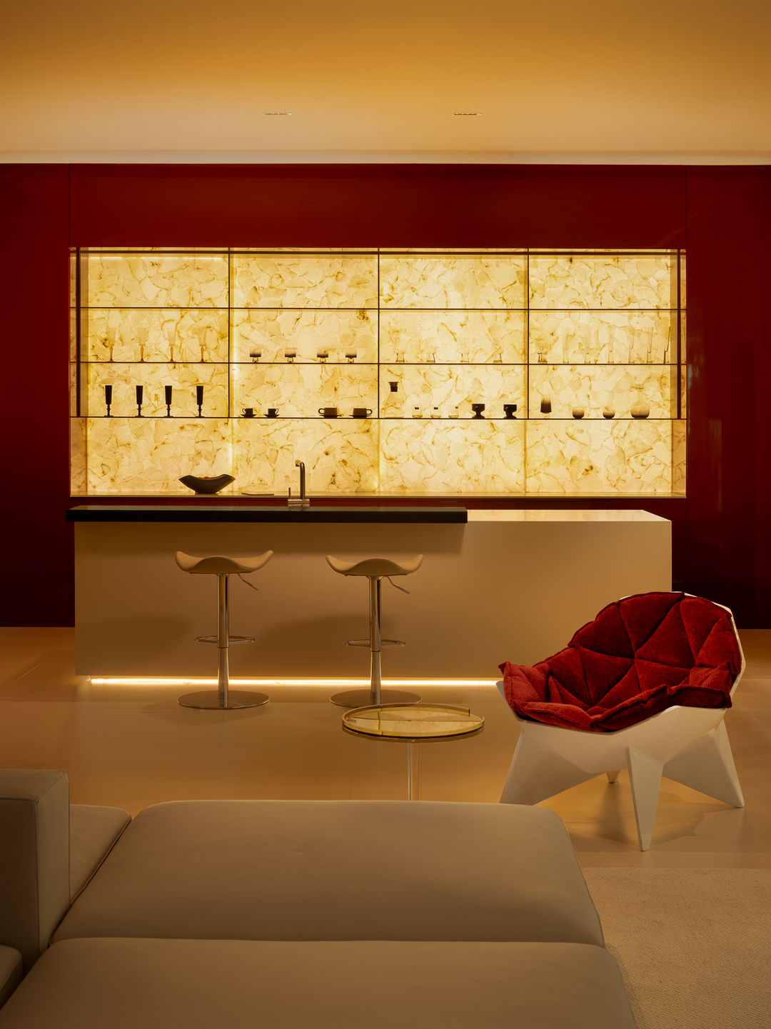 空间本身是极致的留白,所有实体皆为光的载体退让。按键启动,模式切换,光影瞬变。可以是白光覆盖,光谱精准模拟晨间情境,激活唤醒状态;也可以霓虹闪烁,表达夜晚派对的恣意与欢愉,任凭情绪沉沦;或是跌入黑暗,仅余临界微光与地脚线的线性指引,提供沉浸式的影音体验.…