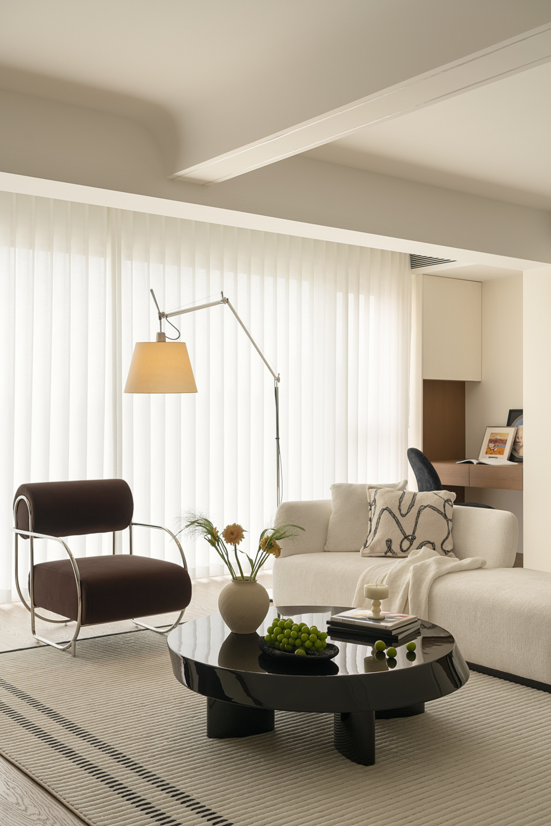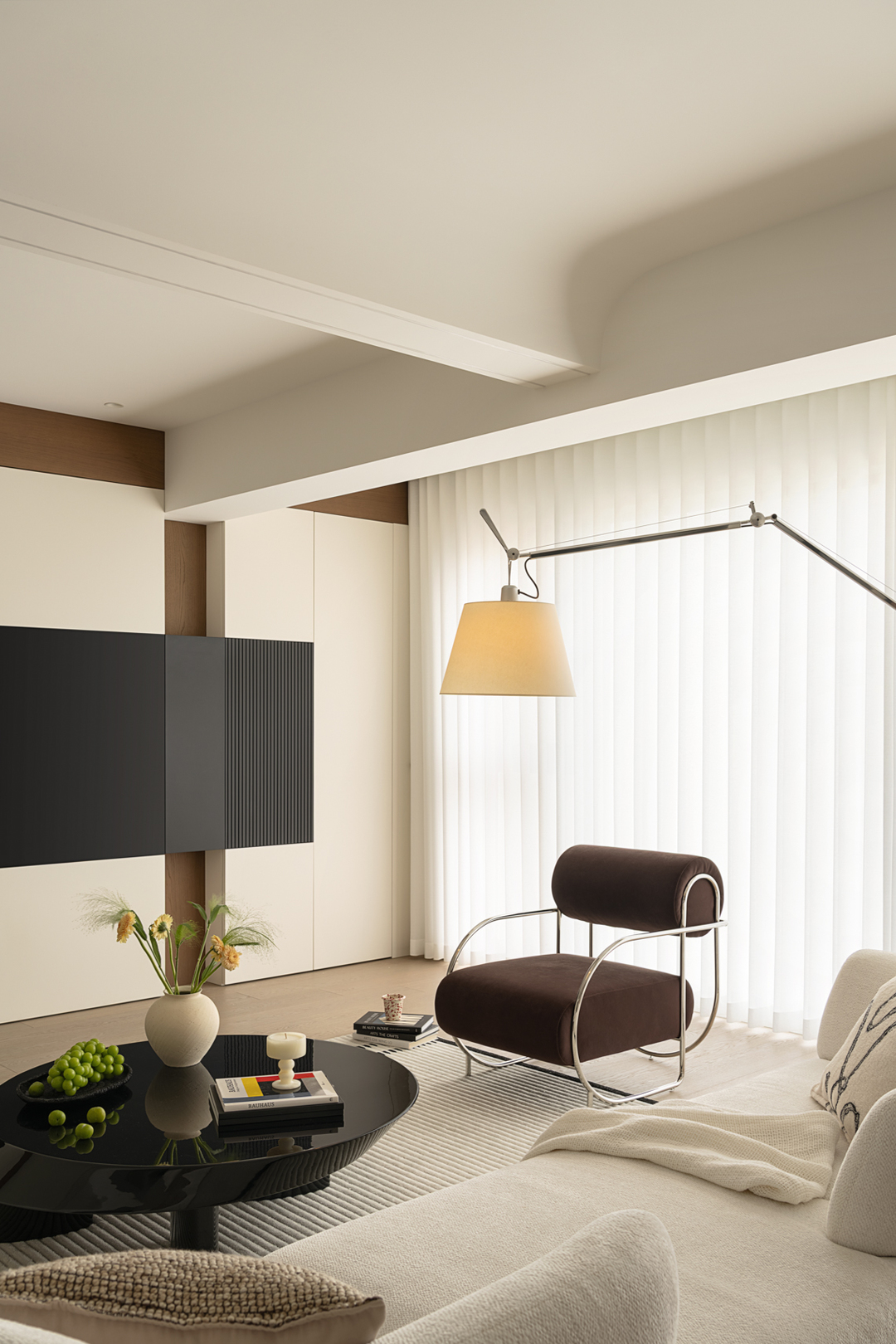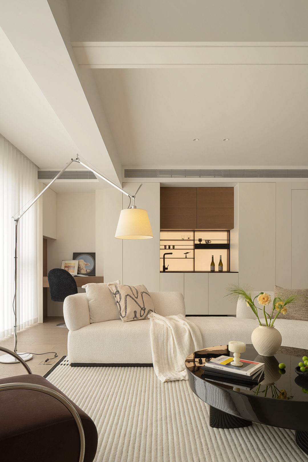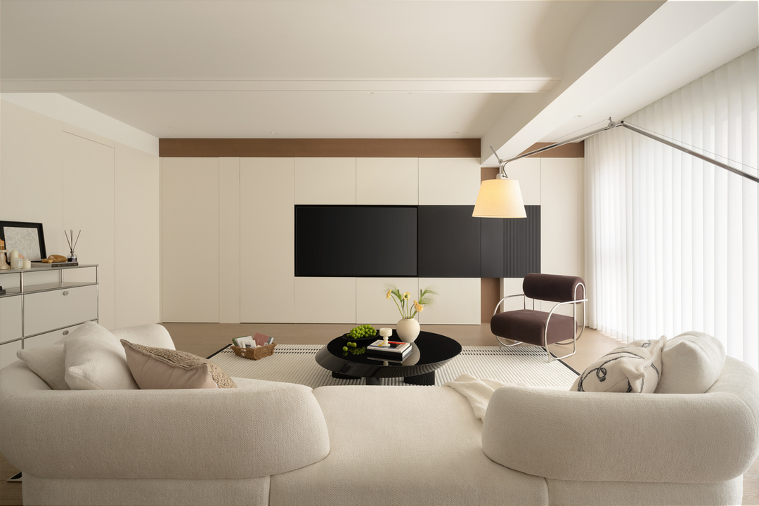 空间的基调源于对光线的深刻解读,在并入阳台之后,客厅因为整面的落地窗而成为了一个盛装光线的容器,大面积的奶油白色系不仅强化了光的漫反射效应,更塑造出了一种柔和且包容的视觉质感。