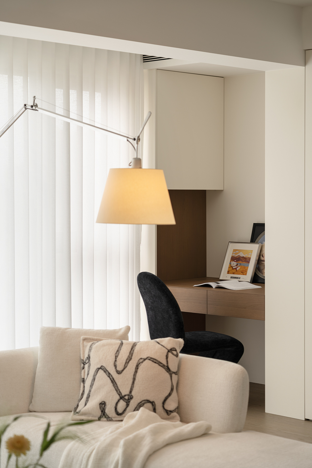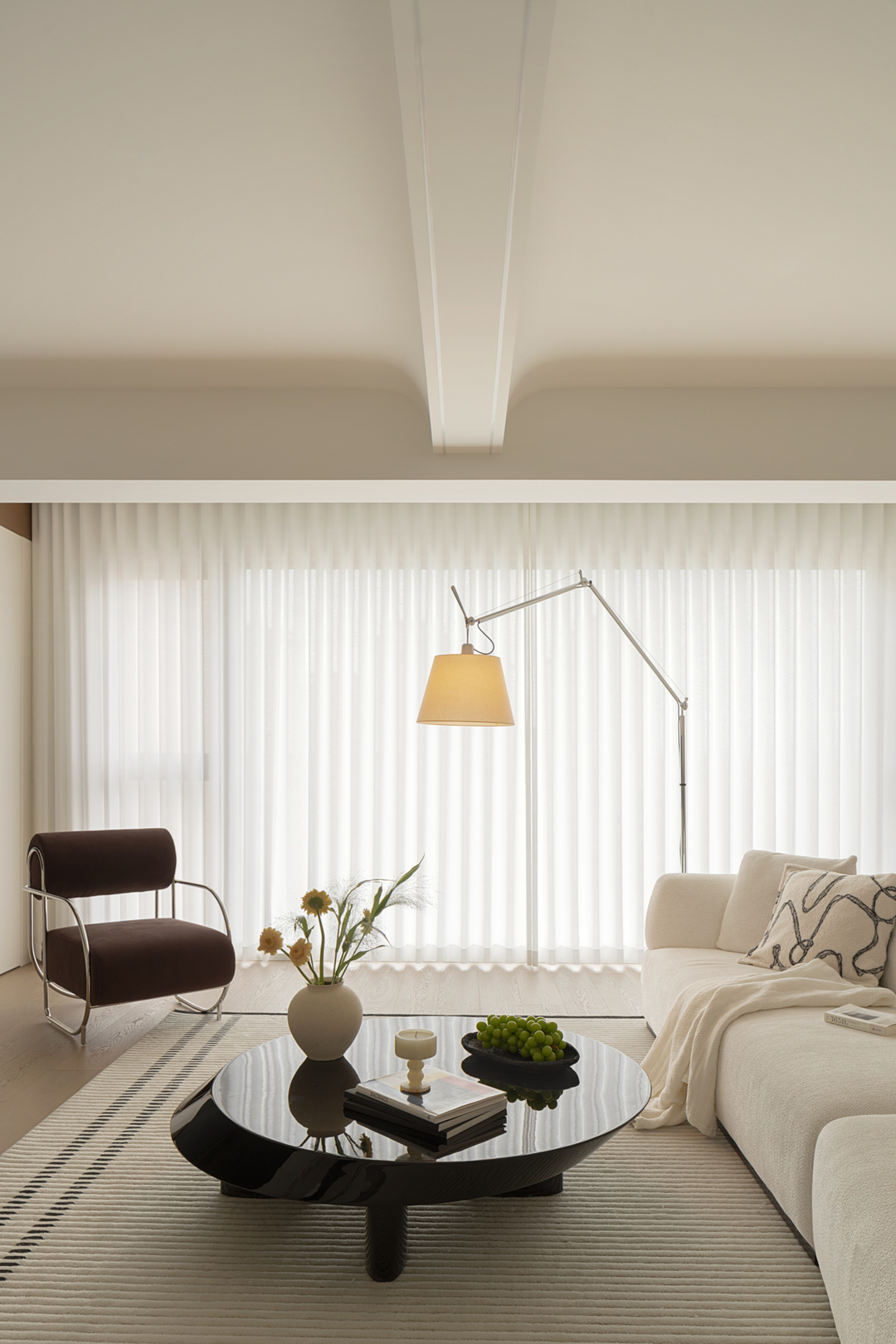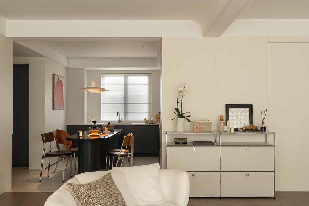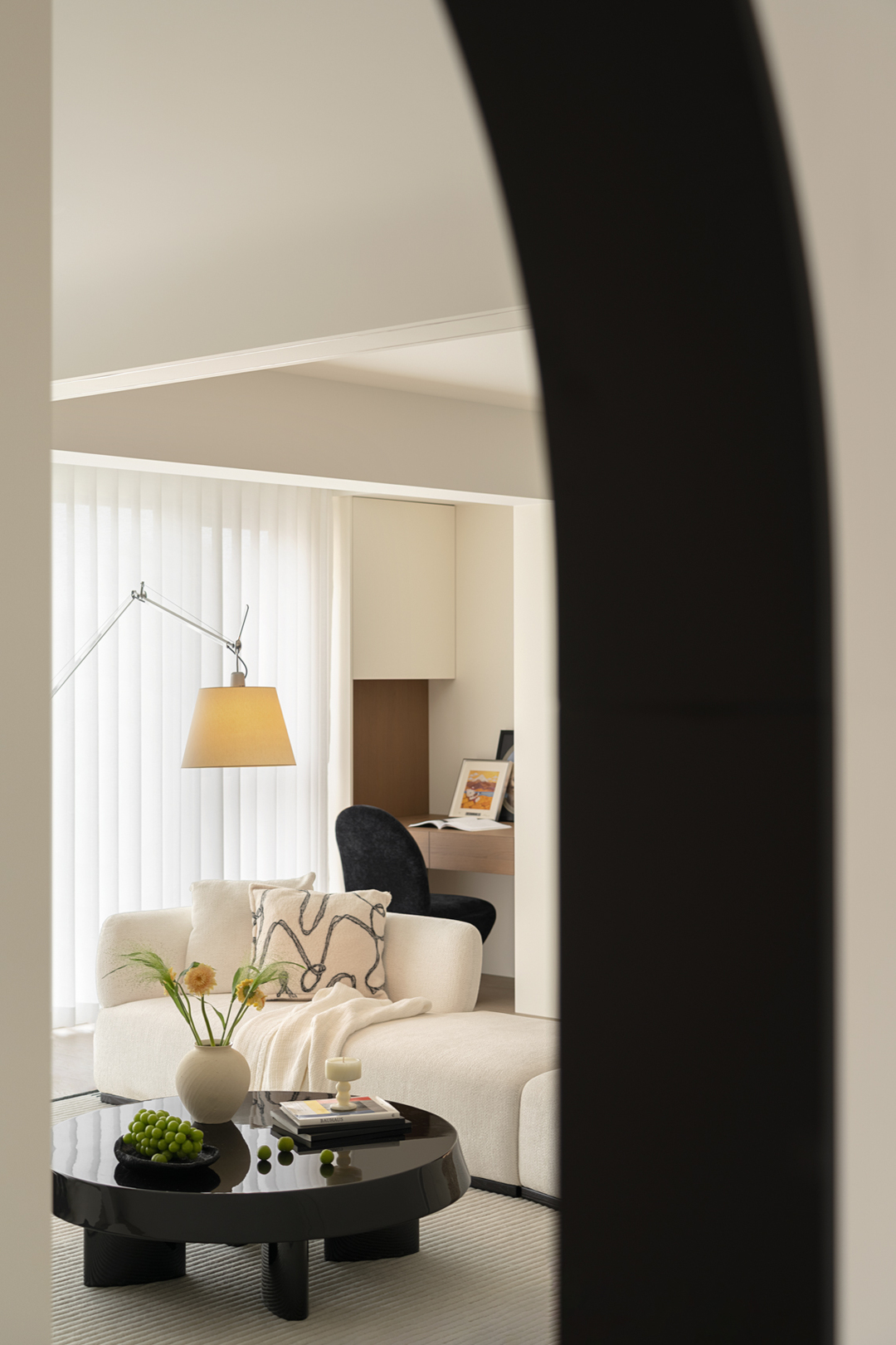 空间的基调源于对光线的深刻解读,在并入阳台之后,客厅因为整面的落地窗而成为了一个盛装光线的容器,大面积的奶油白色系不仅强化了光的漫反射效应,更塑造出了一种柔和且包容的视觉质感。