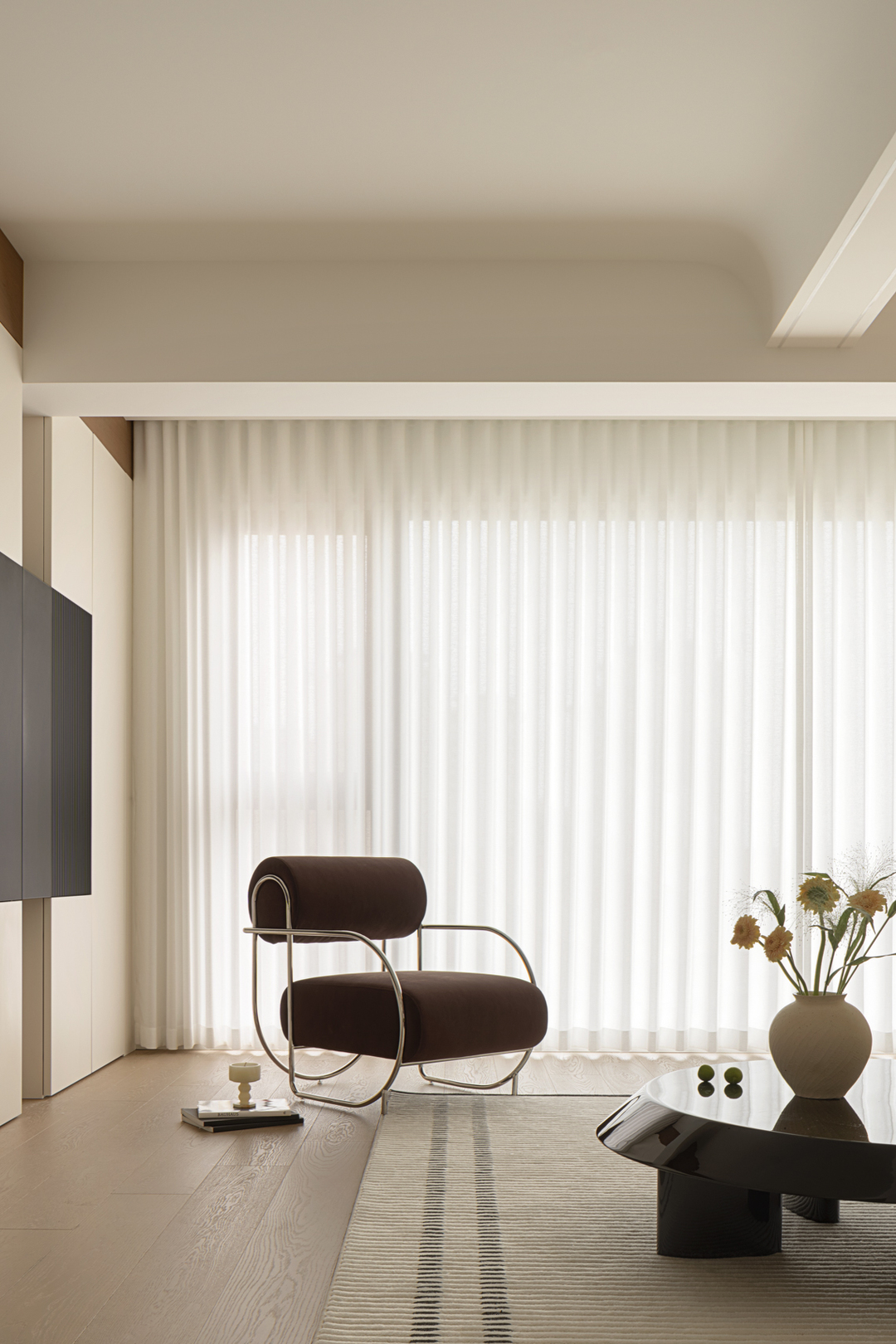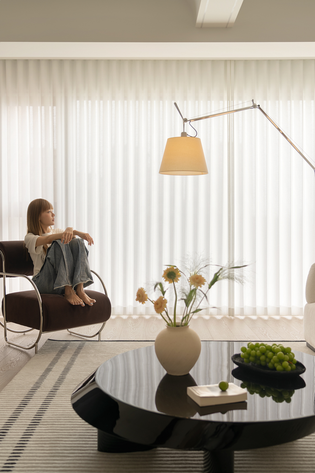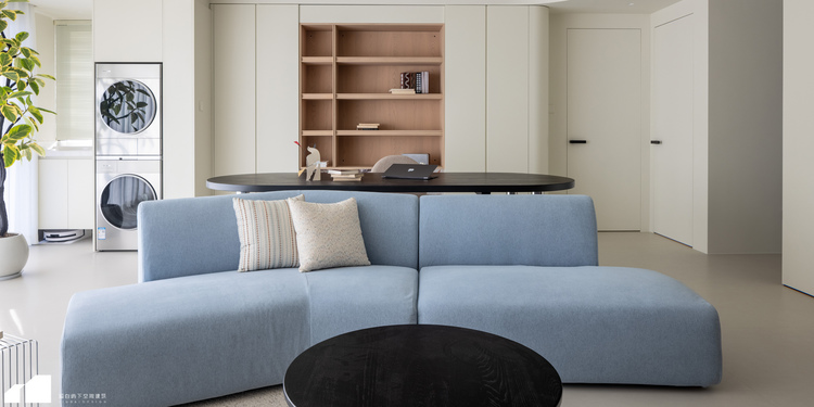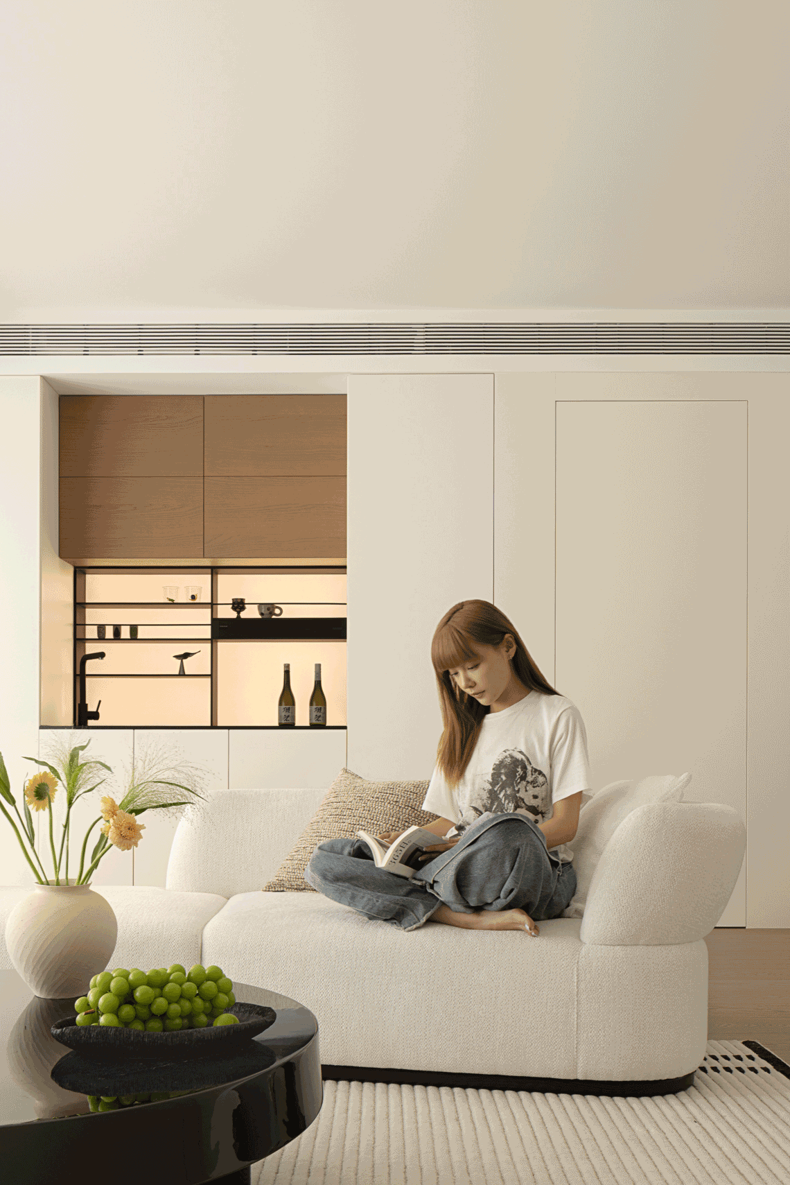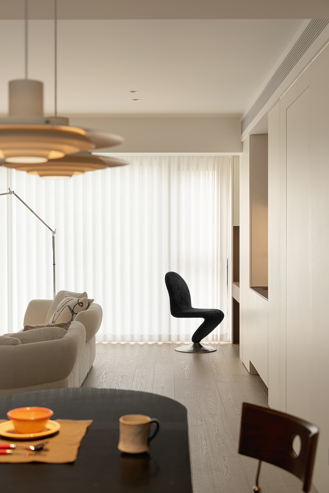空间的基调源于对光线的深刻解读,在并入阳台之后,客厅因为整面的落地窗而成为了一个盛装光线的容器,大面积的奶油白色系不仅强化了光的漫反射效应,更塑造出了一种柔和且包容的视觉质感。