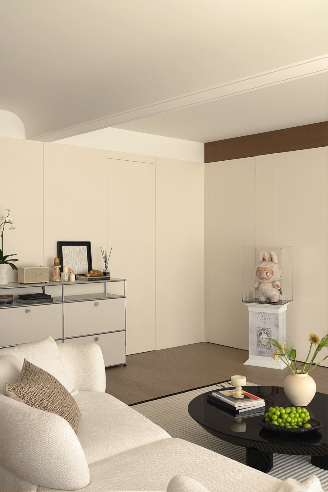 这是为一对90后夫妻与他们的幼子打造的空间,以低饱和度的奶油色系,构建出一个具有时间包容度的背景式场景,设计师相信,真正的居住智慧不在于追逐转瞬即逝的风格化标签,而在于创造能够随生活一同成长的居住逻辑。