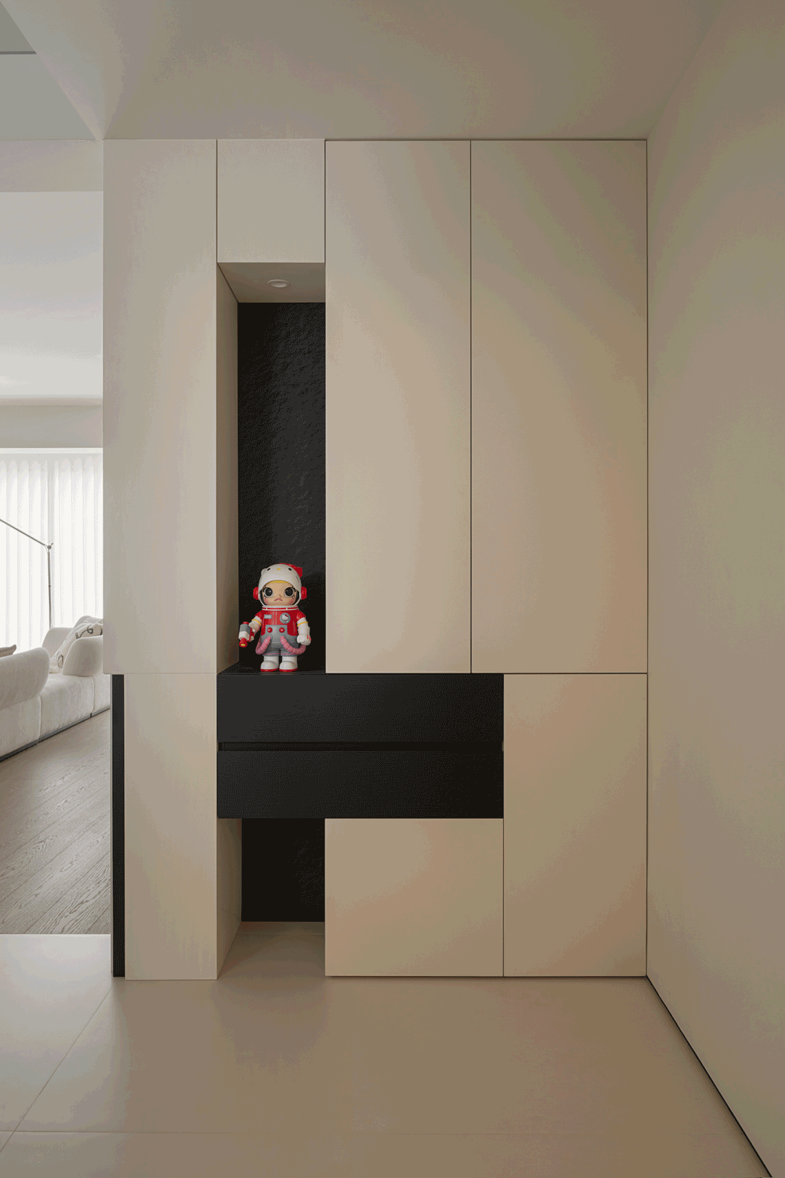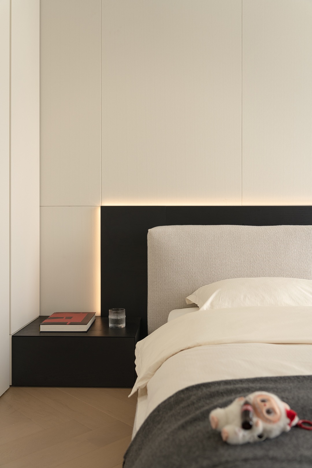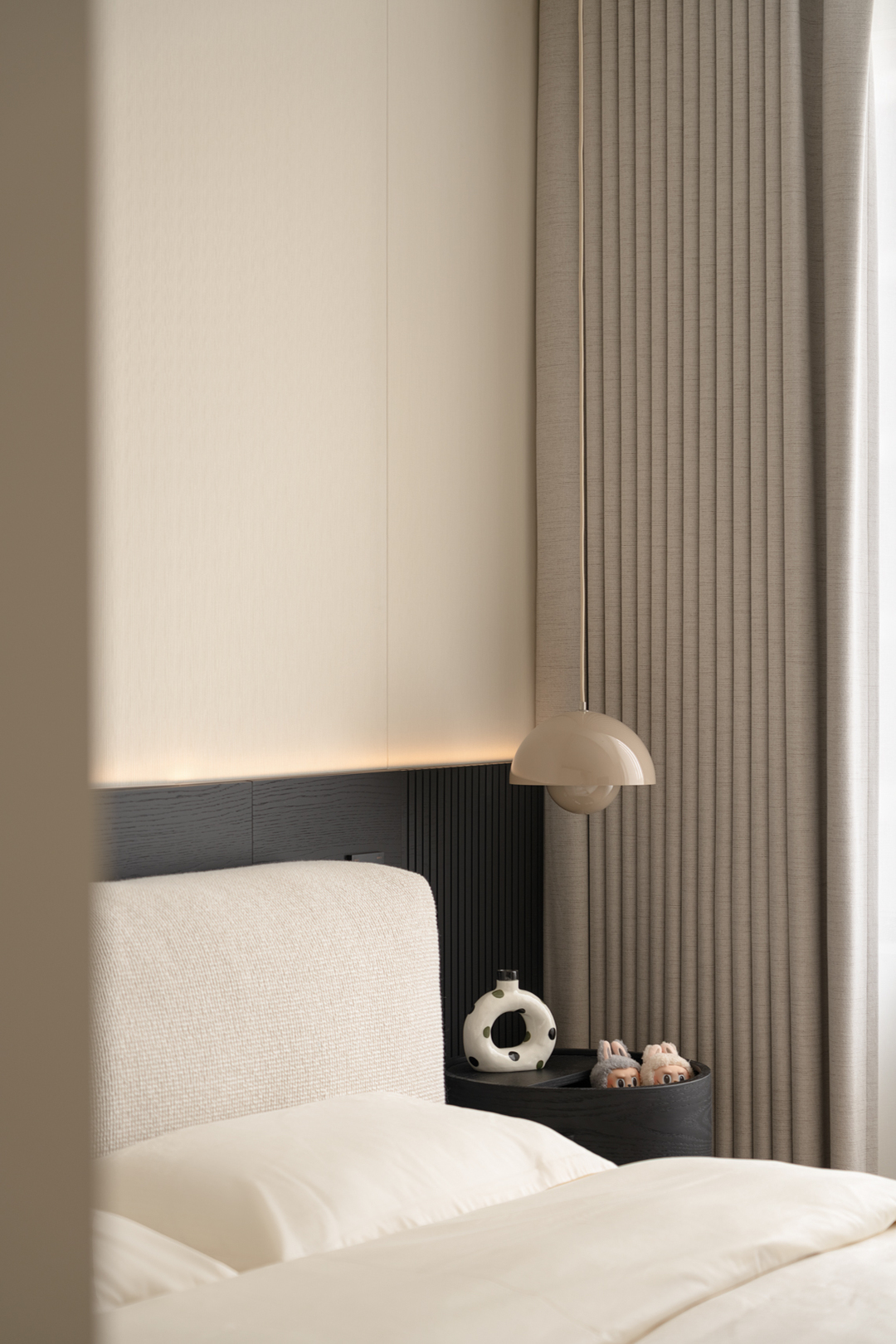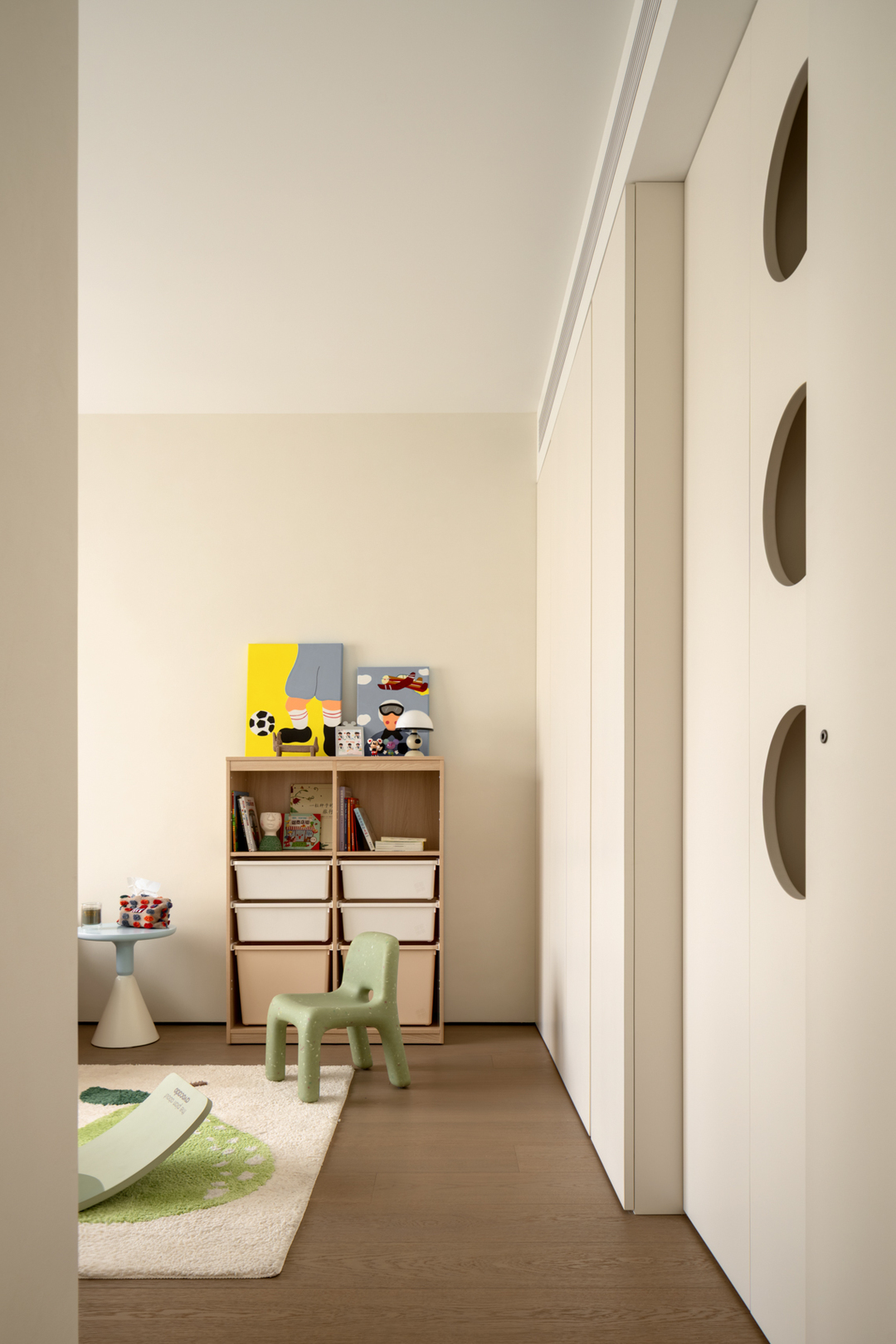 考虑成长型空间对储物的需求,设计师通过墙面储物系统的设计,摒弃了外显的柜体形式,采用嵌入式的隐秘处理,在兼顾实用性的同时,维持空间的纯净度。柜门与墙体融为一体,勾勒出平滑而连续的界面,自然化为空间的细节语言。