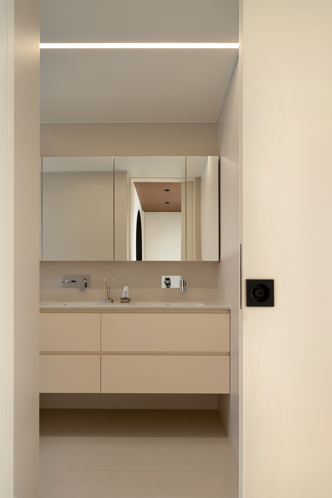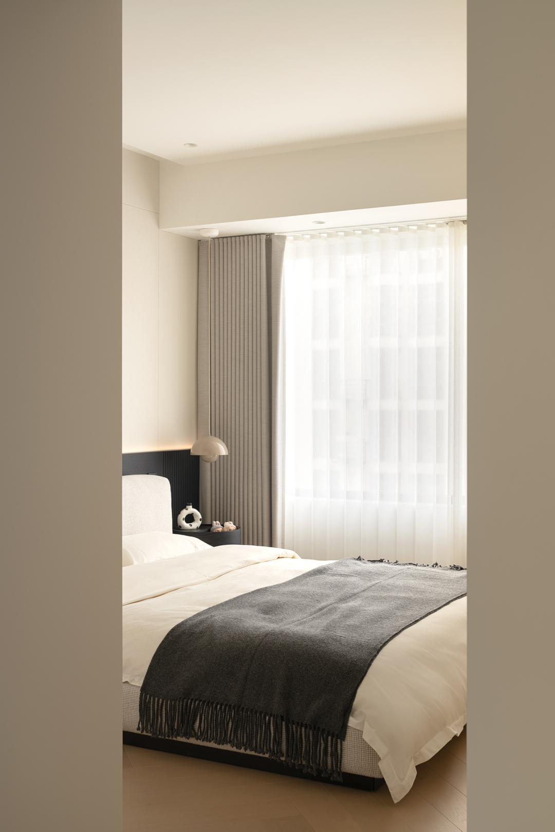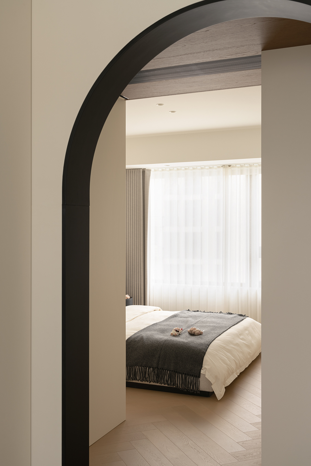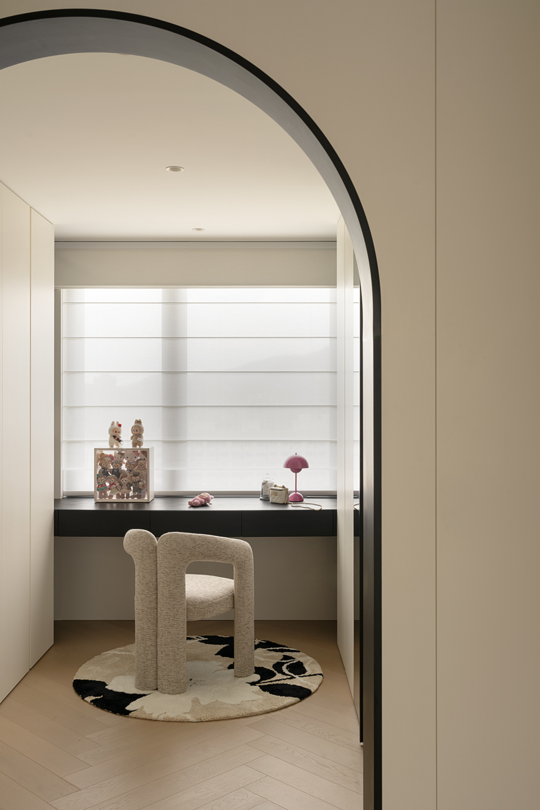 考虑成长型空间对储物的需求,设计师通过墙面储物系统的设计,摒弃了外显的柜体形式,采用嵌入式的隐秘处理,在兼顾实用性的同时,维持空间的纯净度。柜门与墙体融为一体,勾勒出平滑而连续的界面,自然化为空间的细节语言。