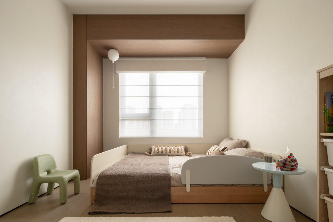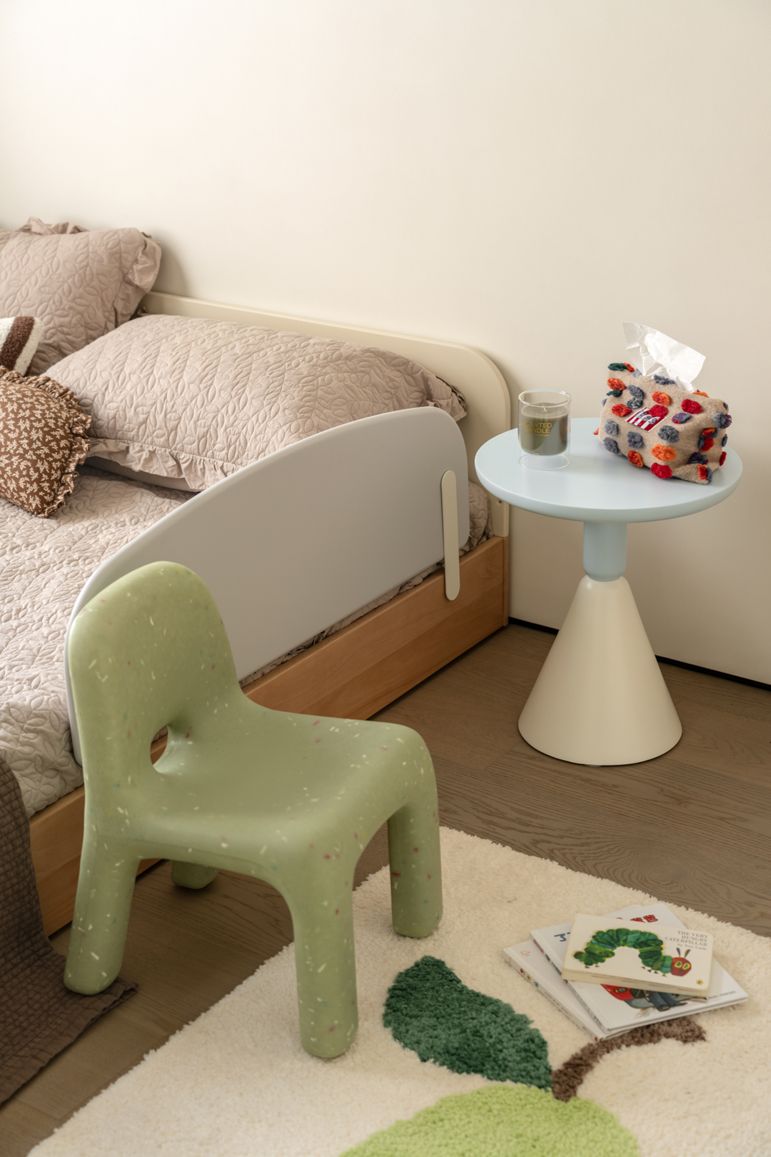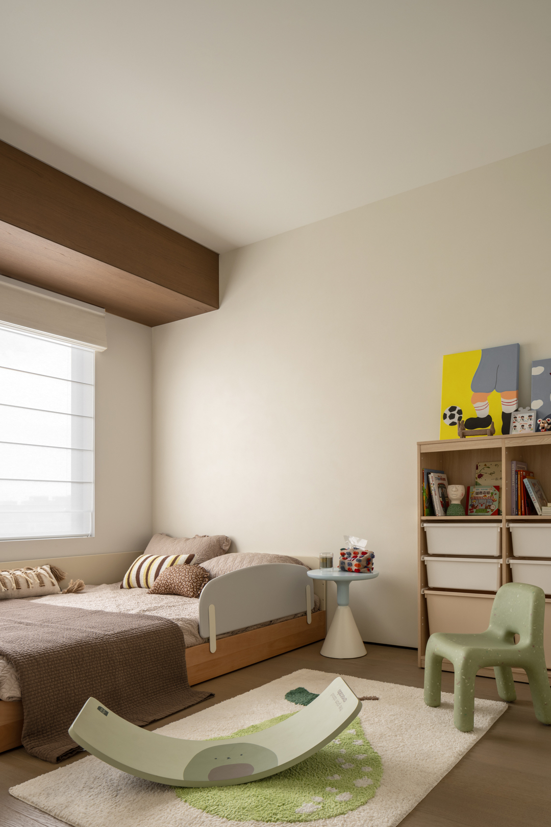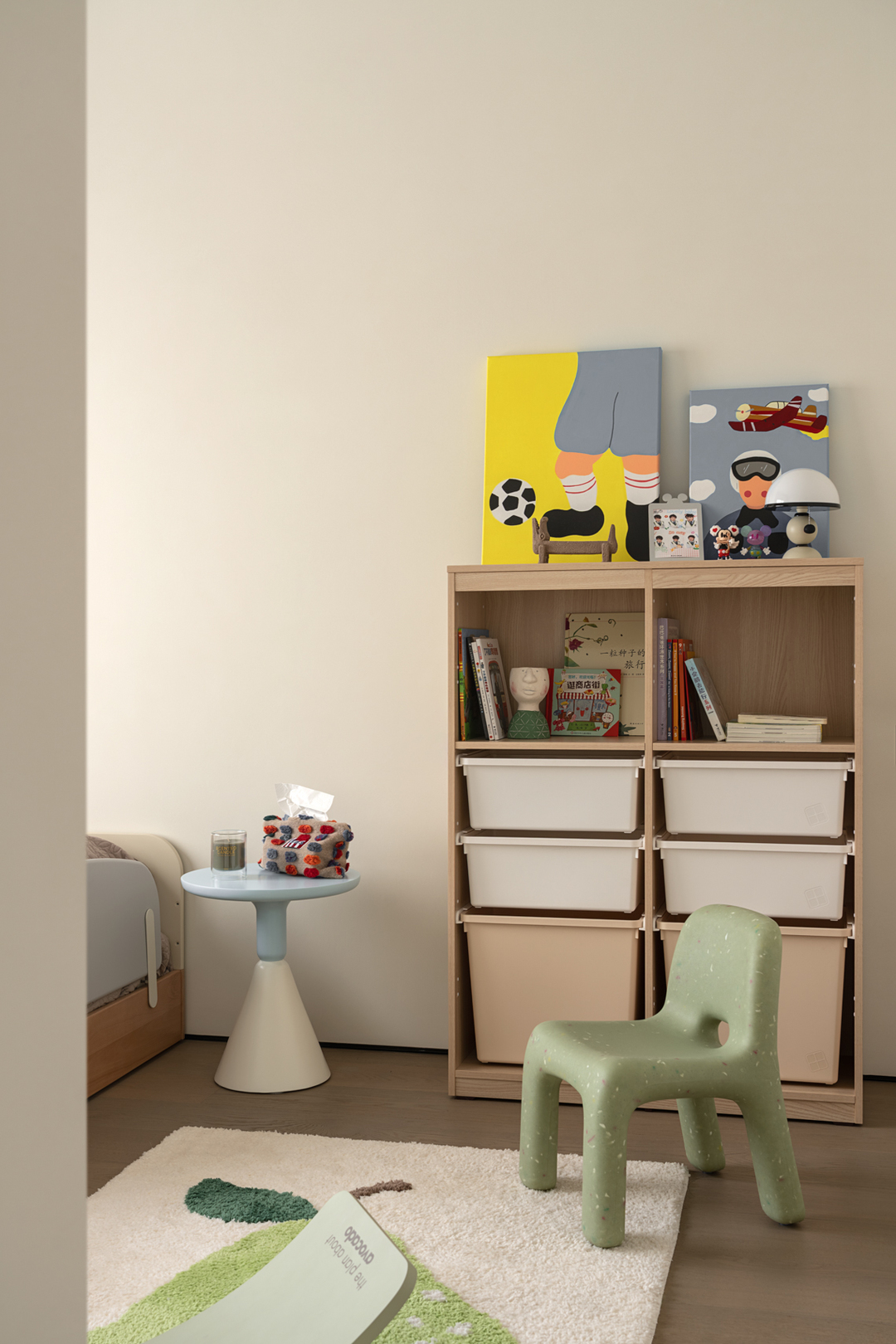 场景中并未以过多的装饰填塞,而是布置可移动的家具,刻意留出游戏区域,将空间的主导权交还于孩子。于此同时,空间也因此拥有了更多可变性的可能,当孩子逐渐长大,空间可以随使用的场景逐步更新丰盈,为未来的想象与探索预留成长的弹性。