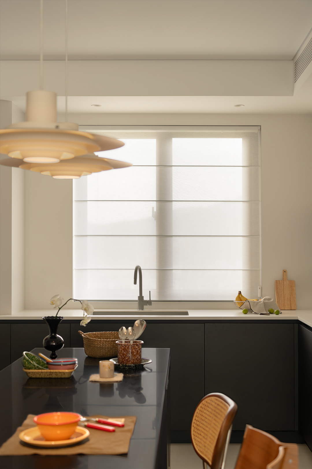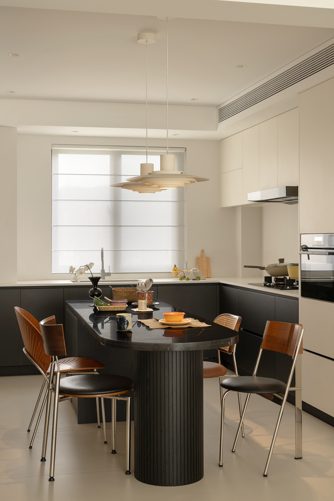 开放式的客餐厅布局不仅放大了场景的物理尺度,更是创造了视觉与行为的连续流动,重构起家庭成员间的互动模式。
