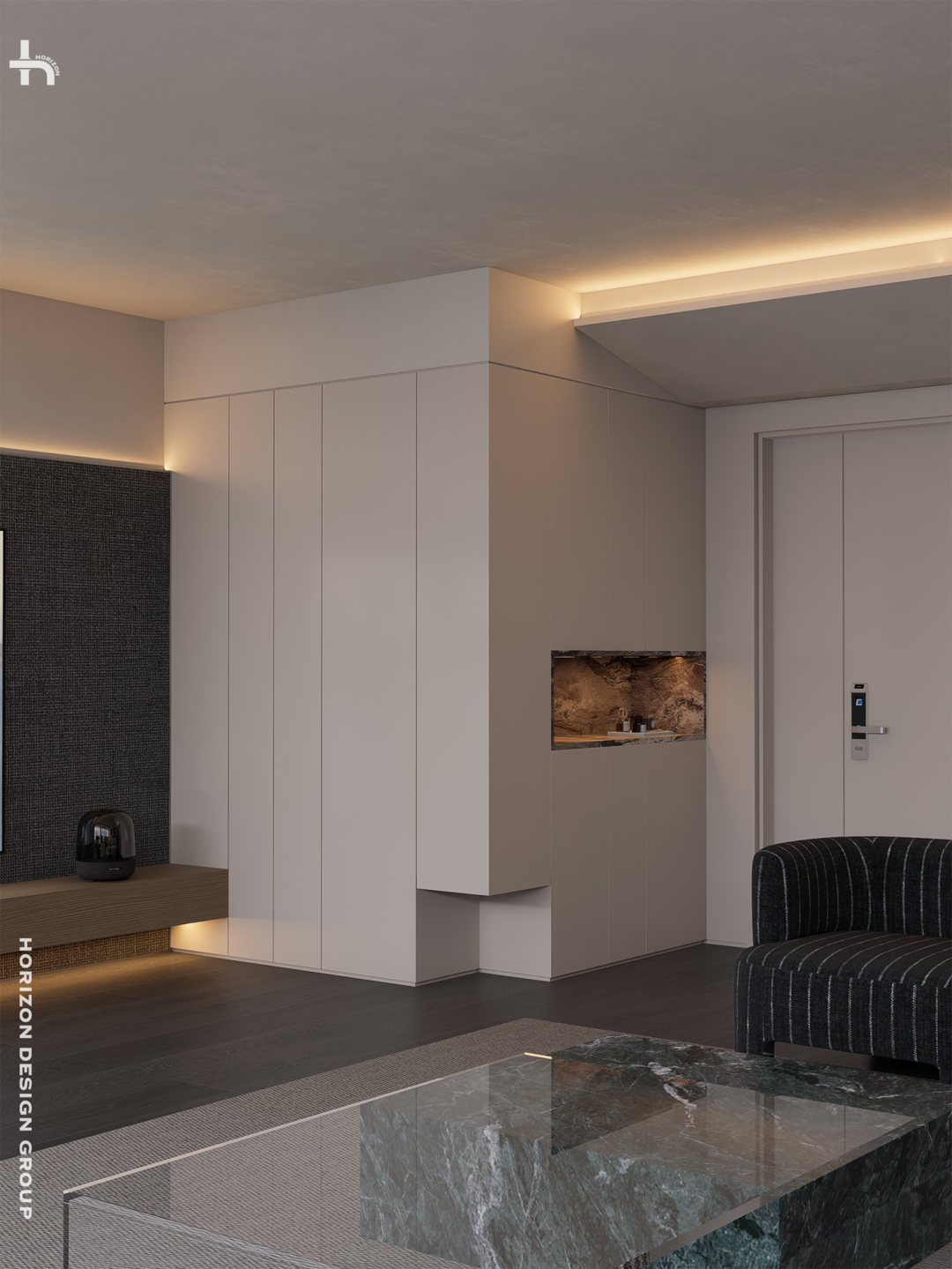 倚靠客厅的开放式书房被塑造为空间序列中一个承前启后的关键节点,多元化的生活场景被精巧编织于一体化空间骨架之中。悬浮岛台的延伸体——更化为动线上一个隐形的方向标,自然引导脚步与视线,向更深处静谧的卧室区域流淌。