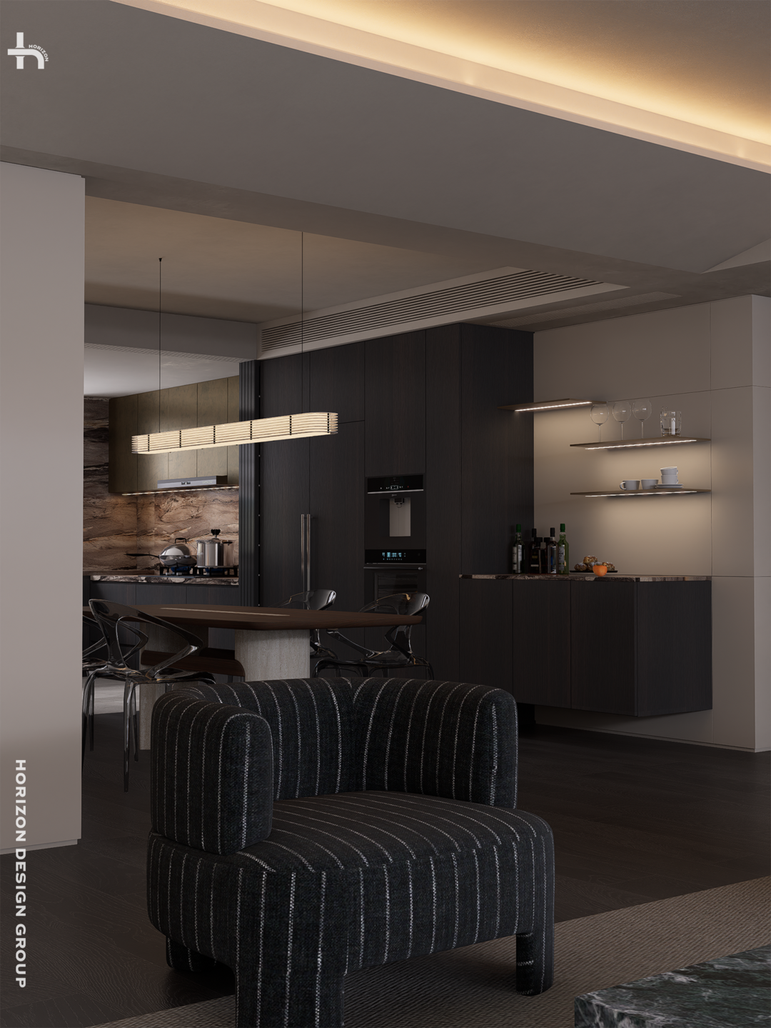 在厨房与餐厅的叙事中,没有采用当下主流的餐岛一体式,转而拥抱更具仪式感的分体设计。独立的餐桌与岛台之间,形成一种优雅的距离。