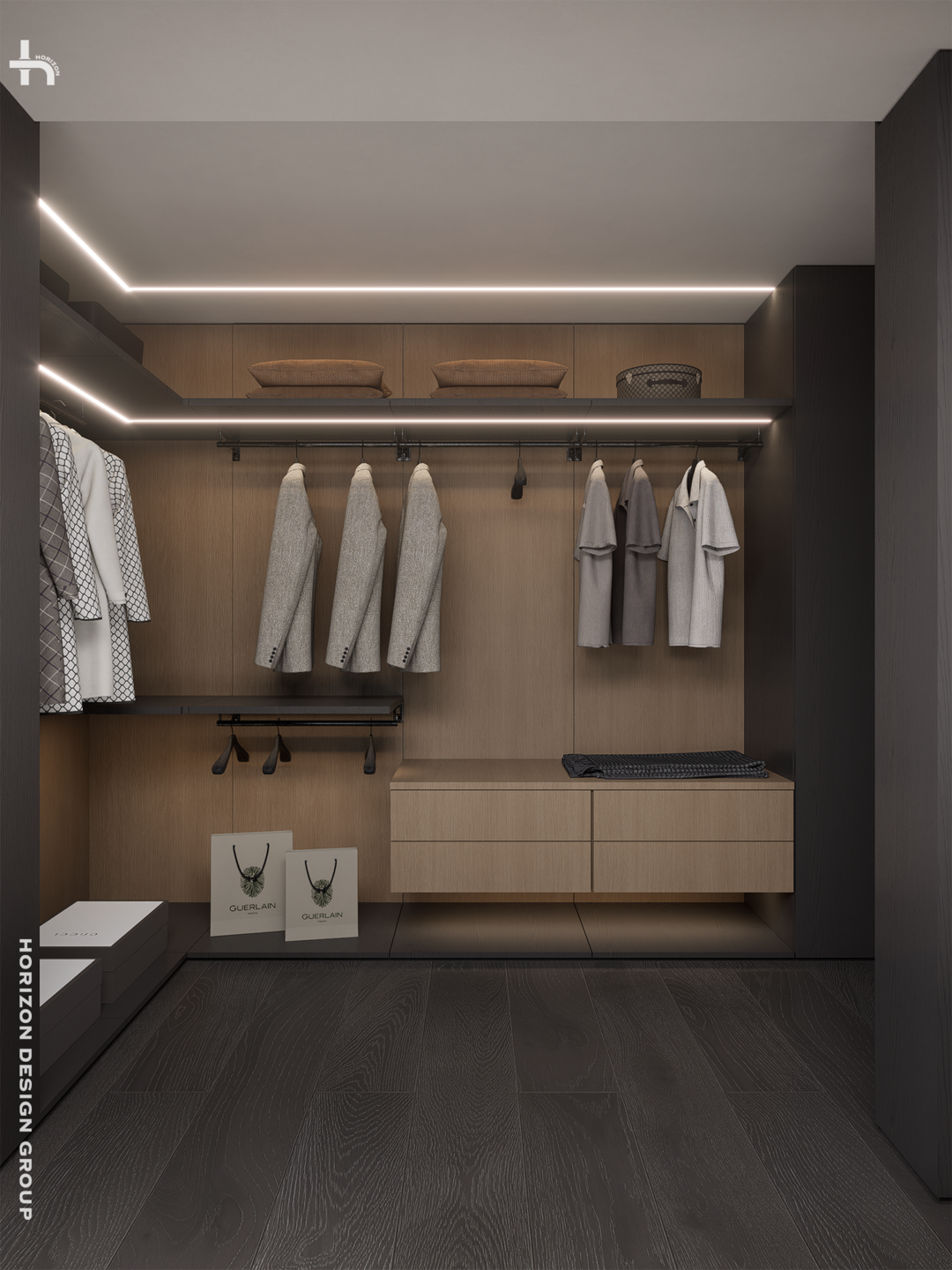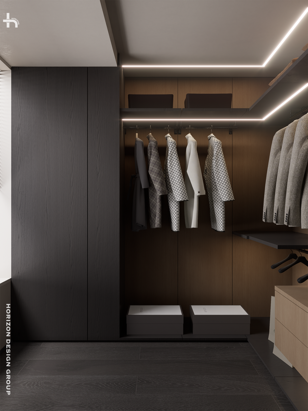 将次卧纳入主卧版图,这并非简单的面积叠加,而是一次深思熟虑的功能再分配 。空间被悉数注入主卧的储物中,打造了一个大容量的收纳体系,并融入空间的立面语言, 有了更具秩序化的呈现。