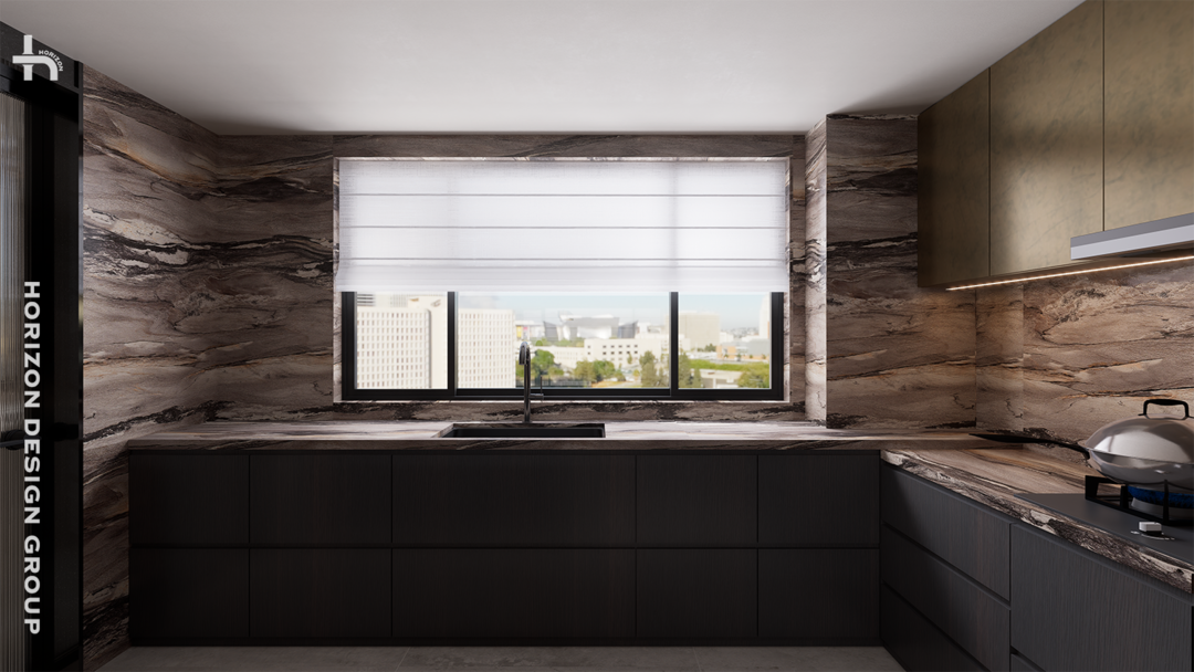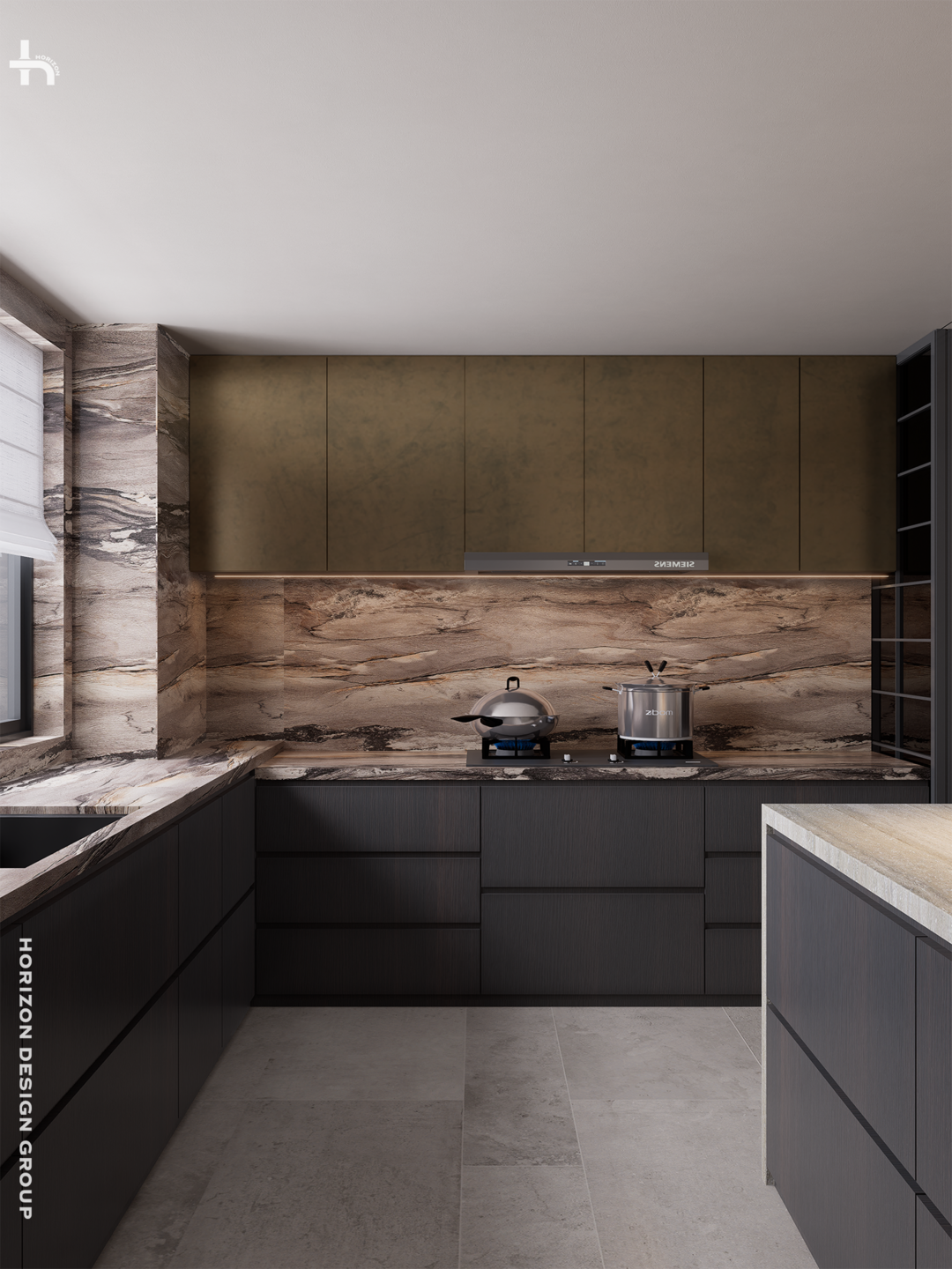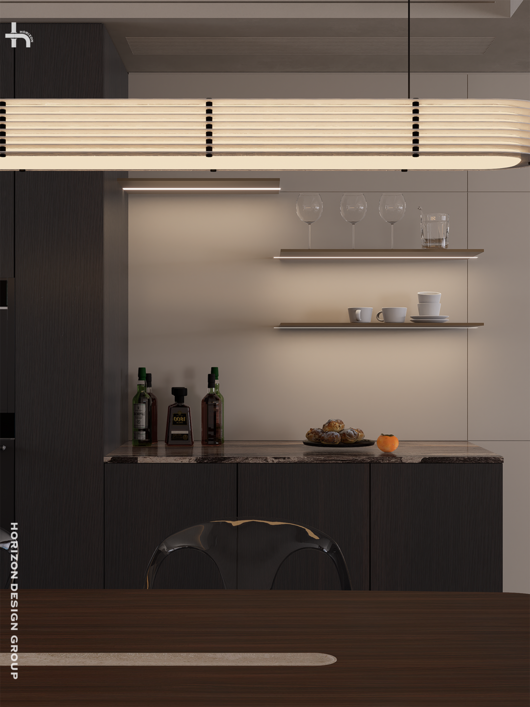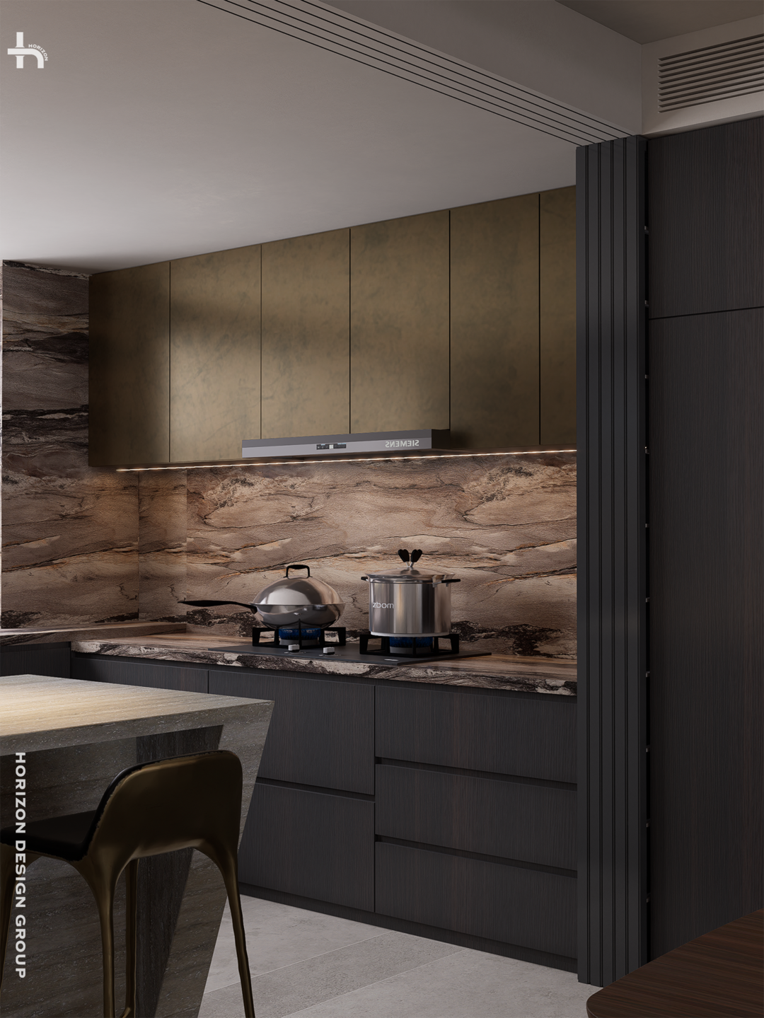 在材质与色彩的交响中,则进行了一场精妙的「革命」:并没有依赖石材的堆砌,而是运用烟熏木皮的柜门,以其深邃的色泽与温润的肌理,为经典的意式注入呼吸感与温度;上方的吊柜大胆采用金属板,其清冷的质感与空间中达成无声的共振。