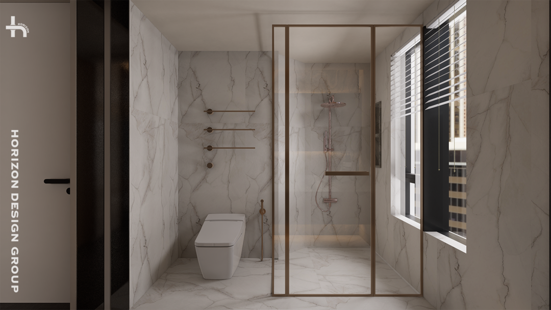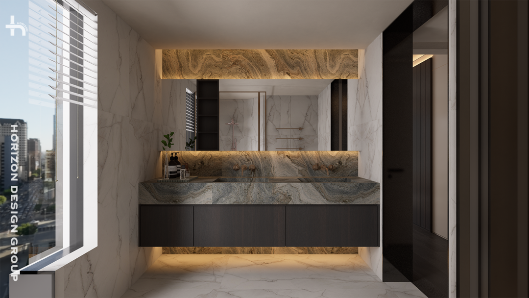 而戏剧性转折则呈现在台盆区——背景墙面大胆采用深邃色调的大理石,与白色基底形成鲜明而强烈的视觉对比,完成了空间层次的巧妙转换,赋予卫浴空间更丰富的表情与深度。